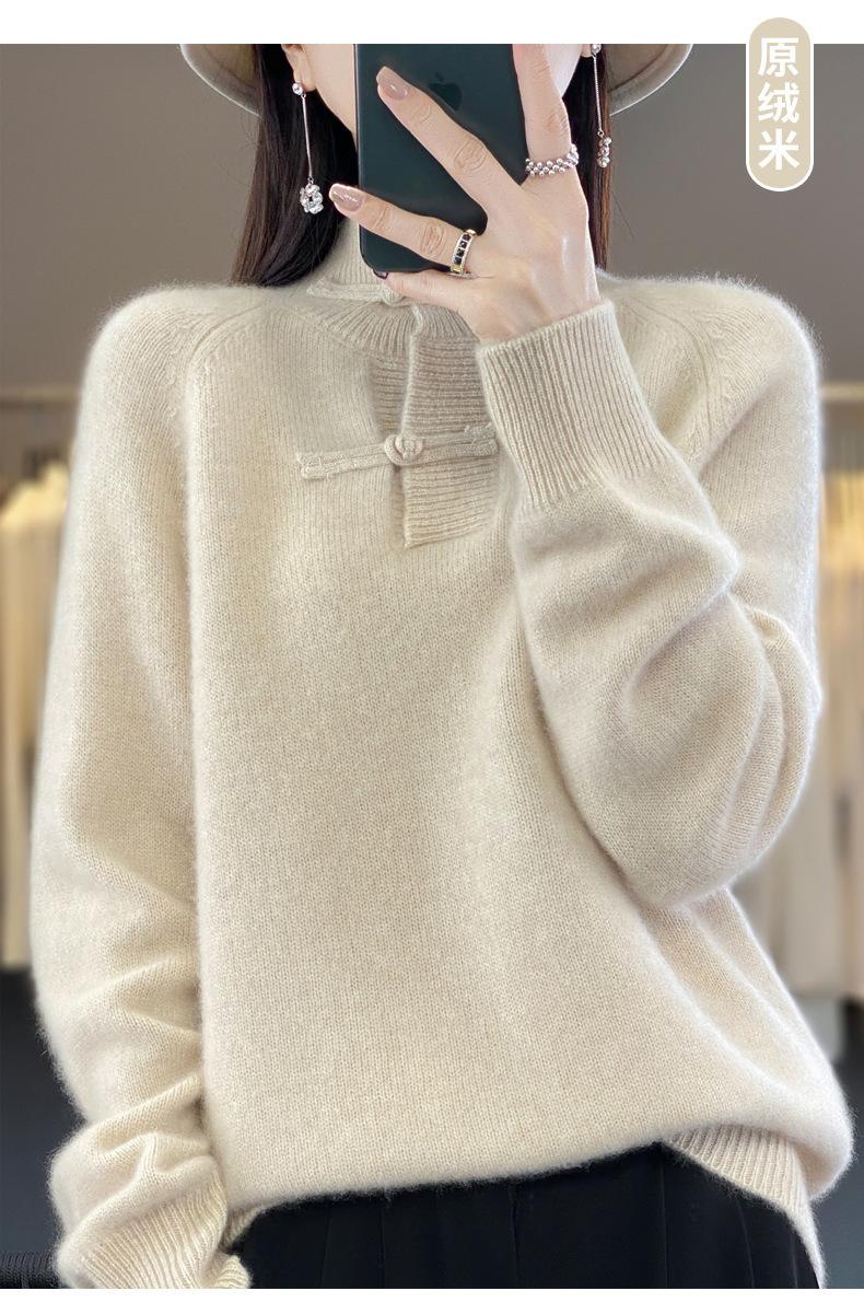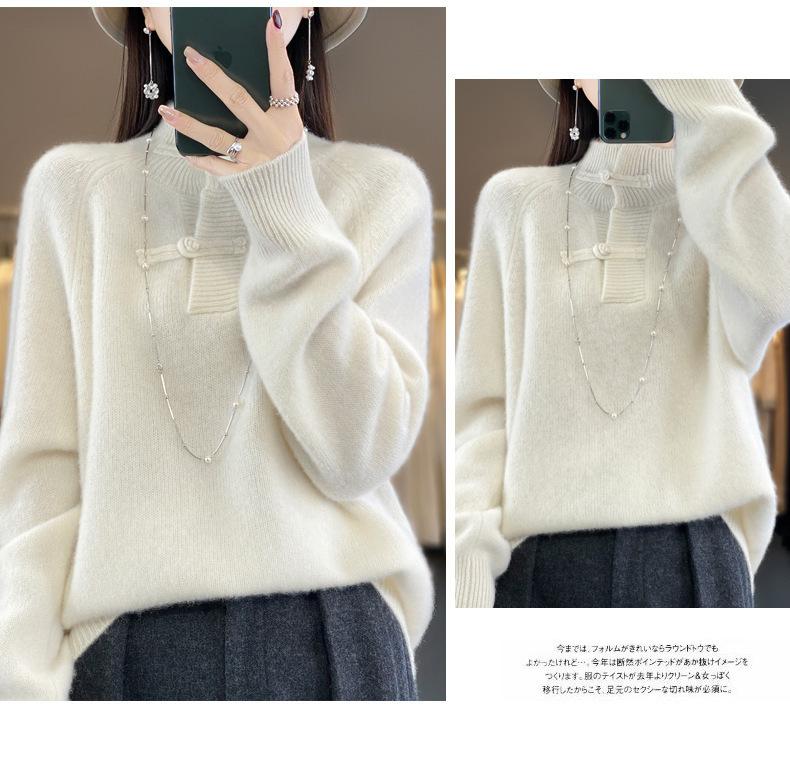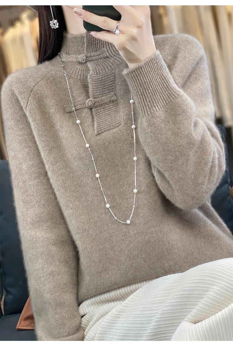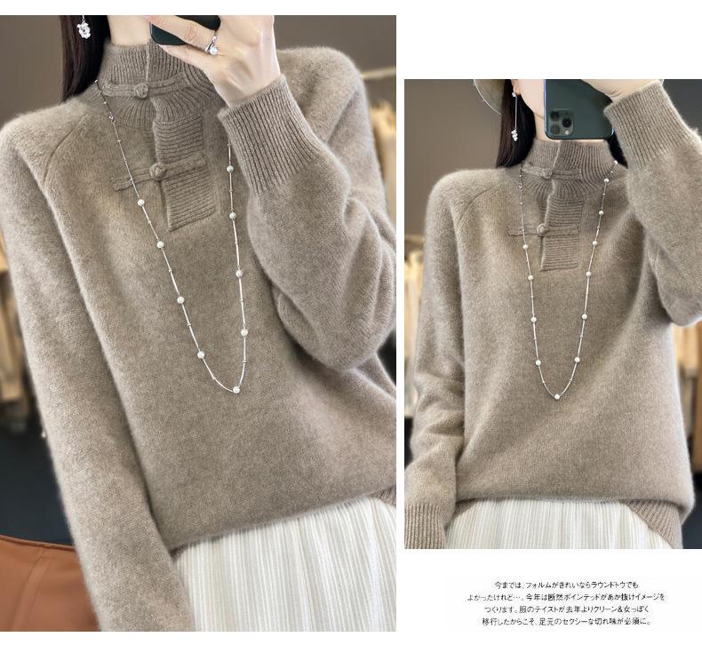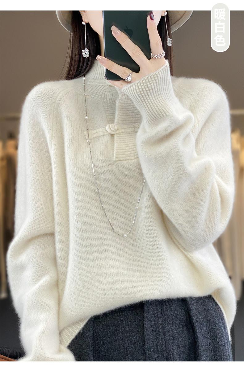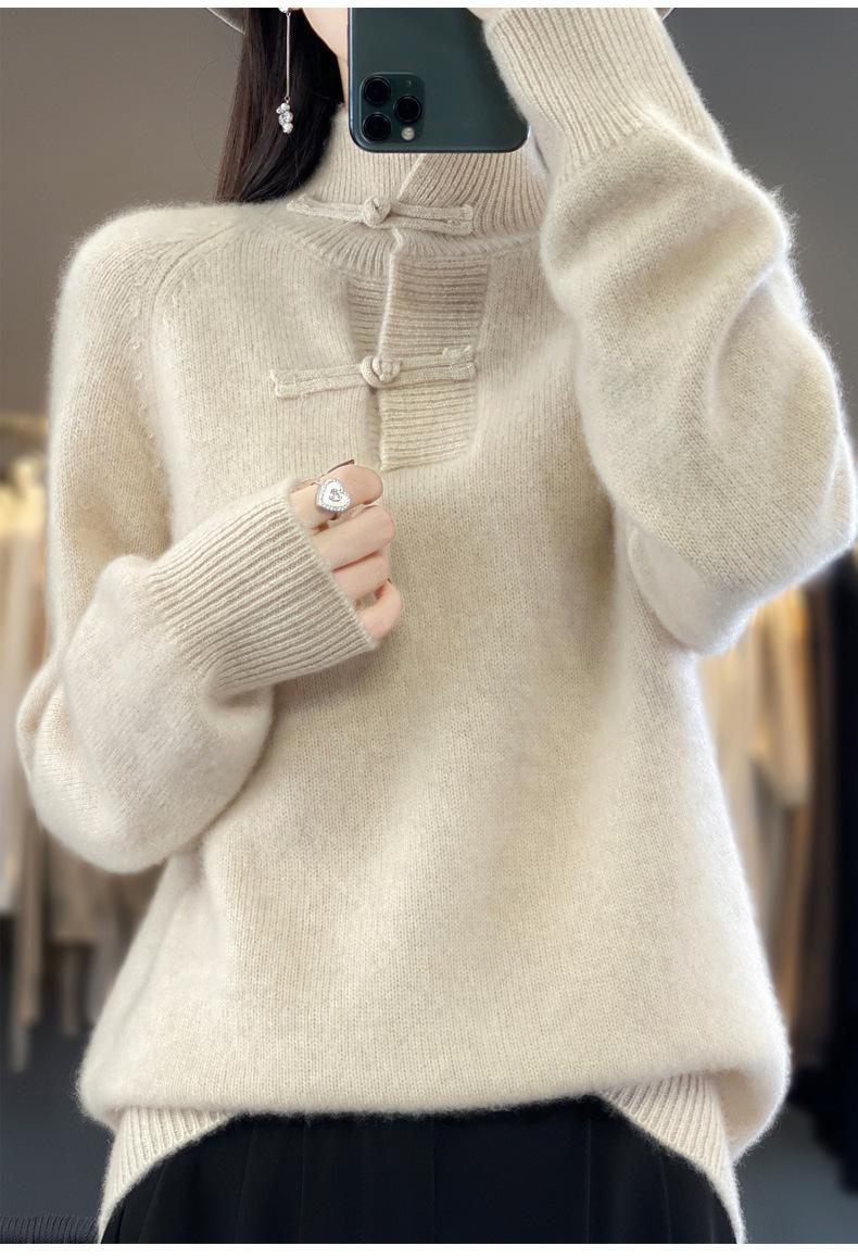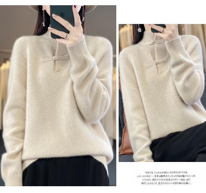 Suéter de Cachemira de Cuello Alto Medio con Hebilla Vintage para Mujer Otoño e Invierno Nuevo Suéter Holgado Grueso de Punto de Lana Camiseta Base