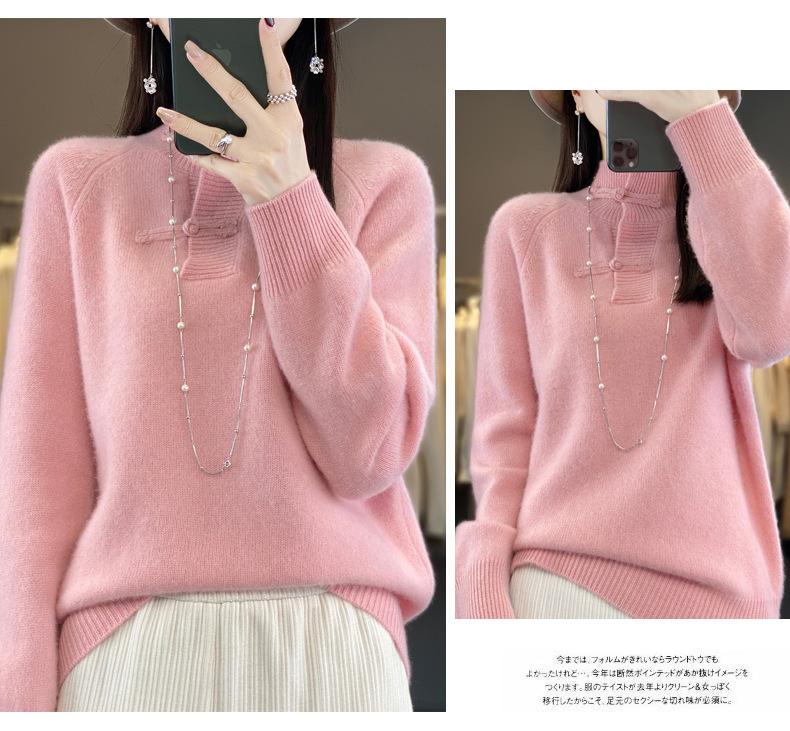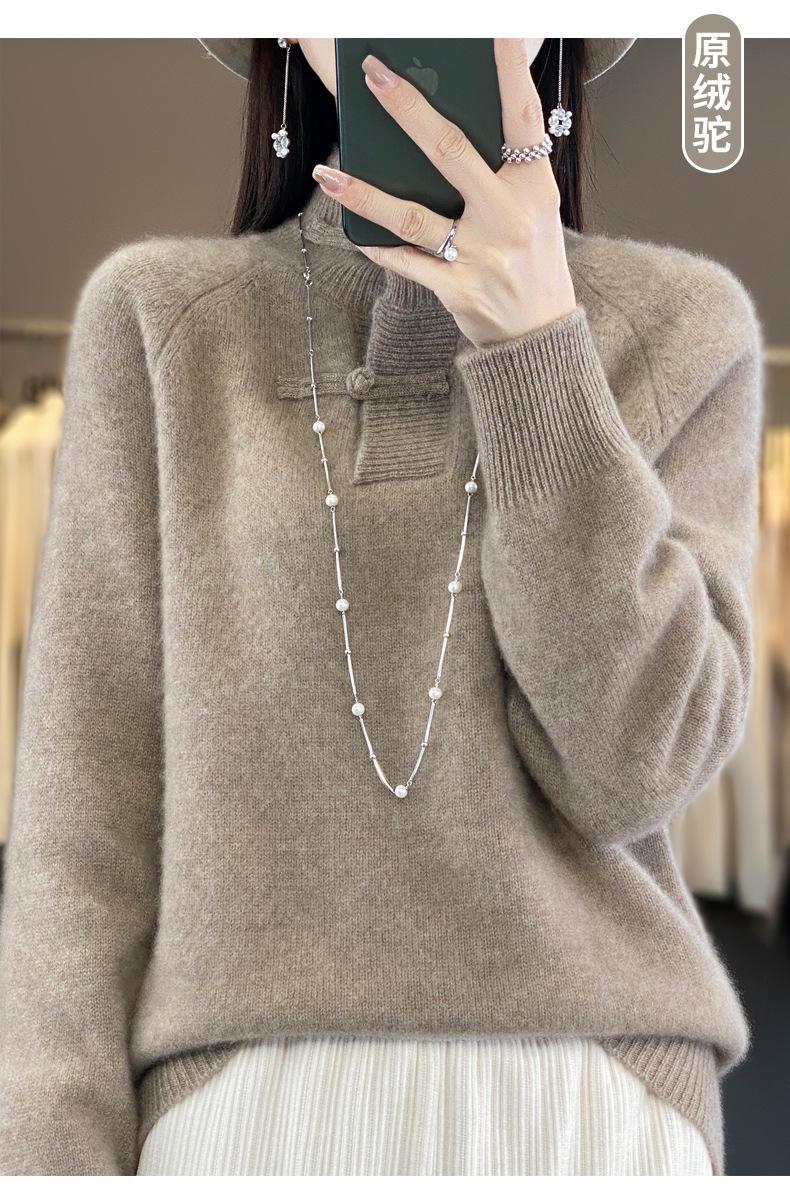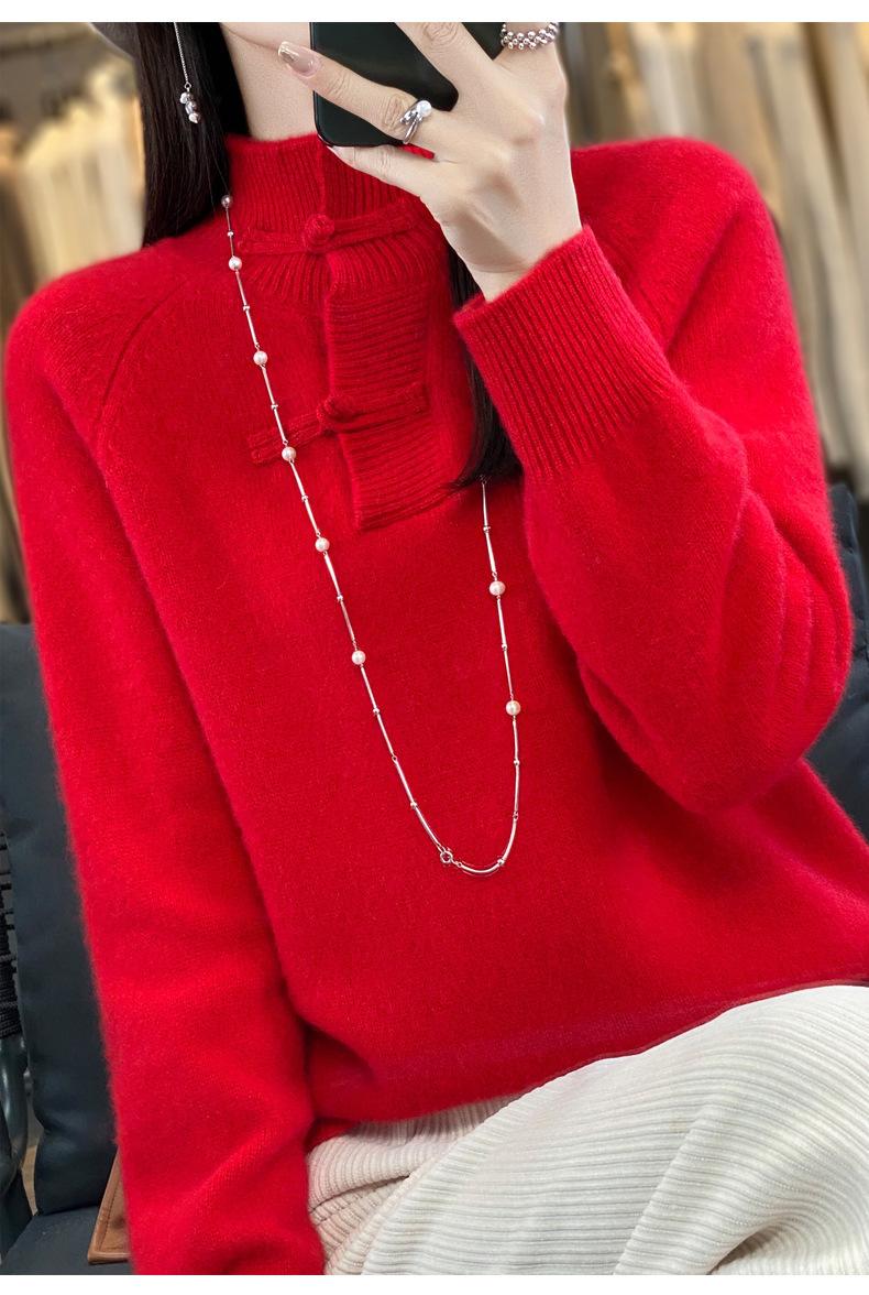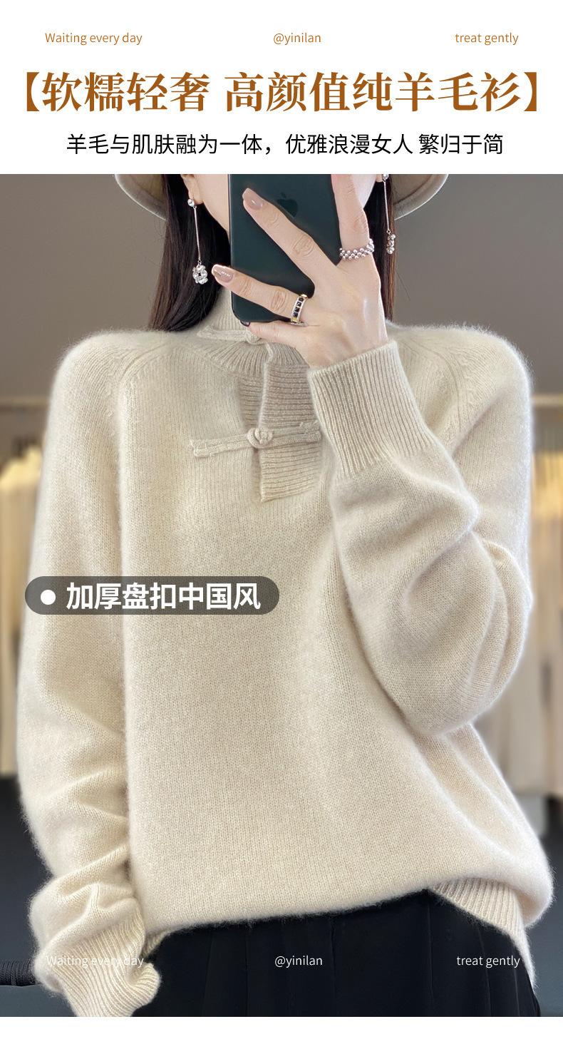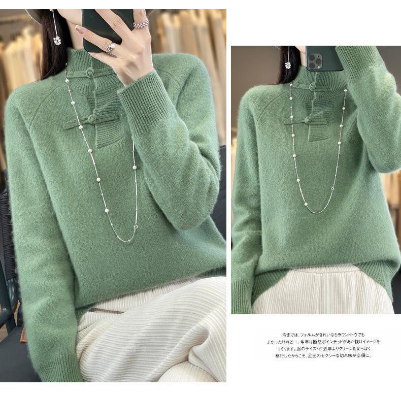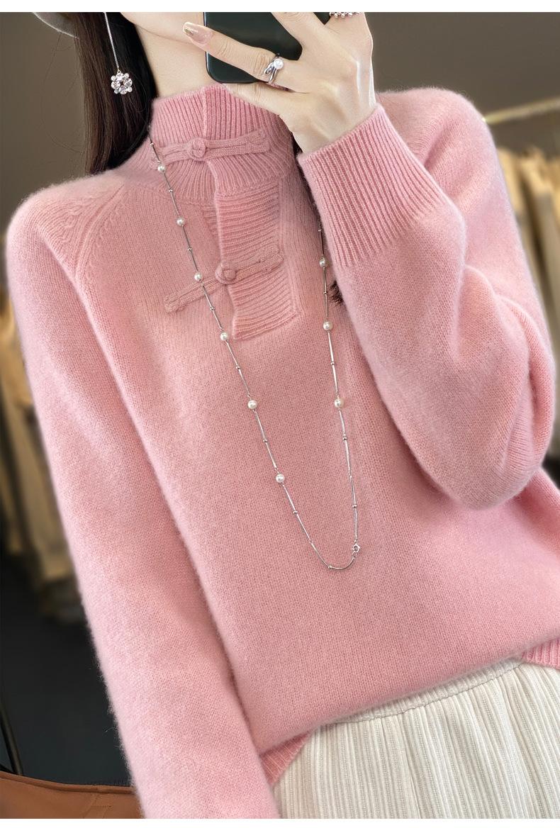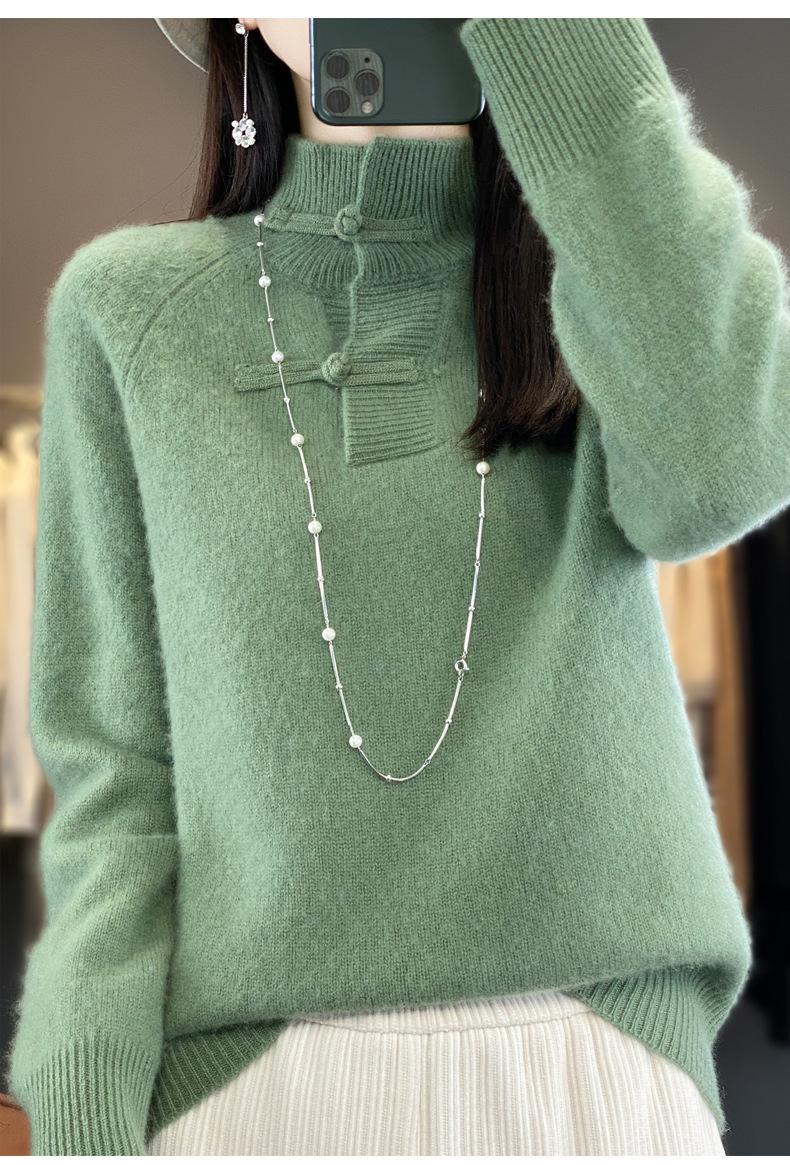 Suéter de Cachemira de Cuello Alto Medio con Hebilla Vintage para Mujer Otoño e Invierno Nuevo Suéter Holgado Grueso de Punto de Lana Camiseta Base
