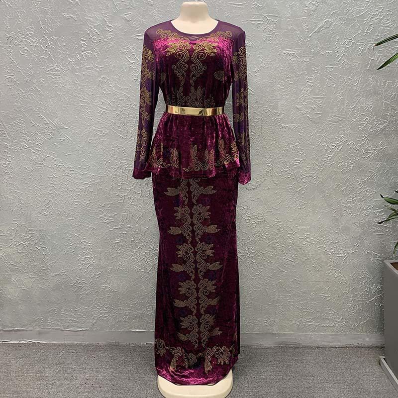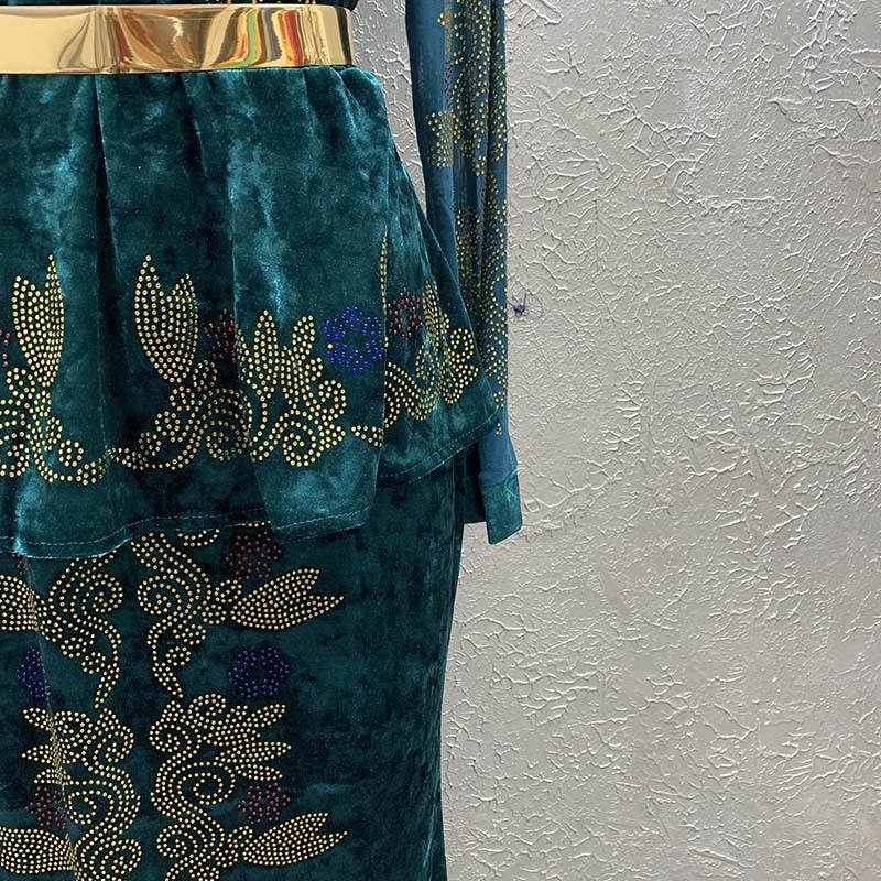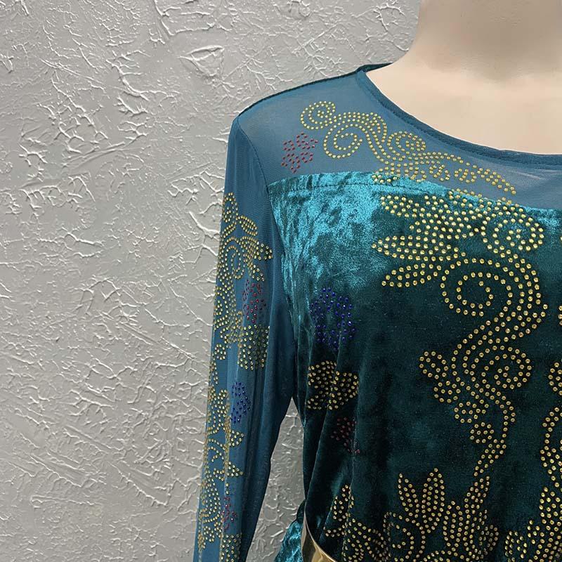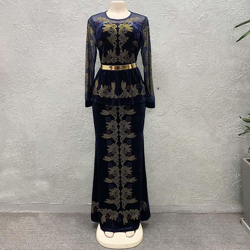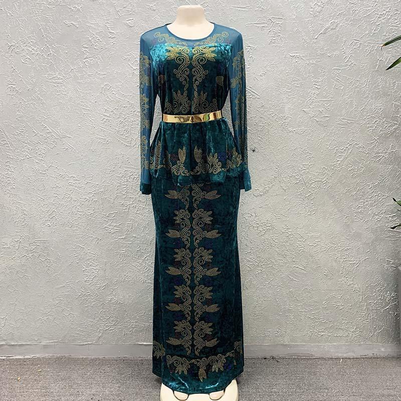 Suministro transfronterizo de nuevo vestido de cadera con costuras de malla de terciopelo dorado de color sólido y diamantes de imitación con cinturón sin bufanda.