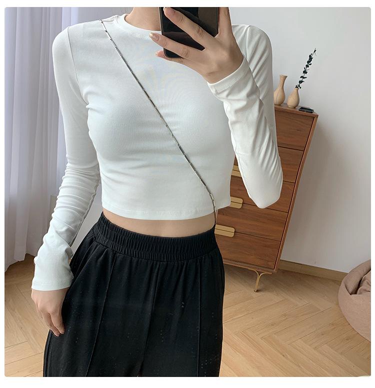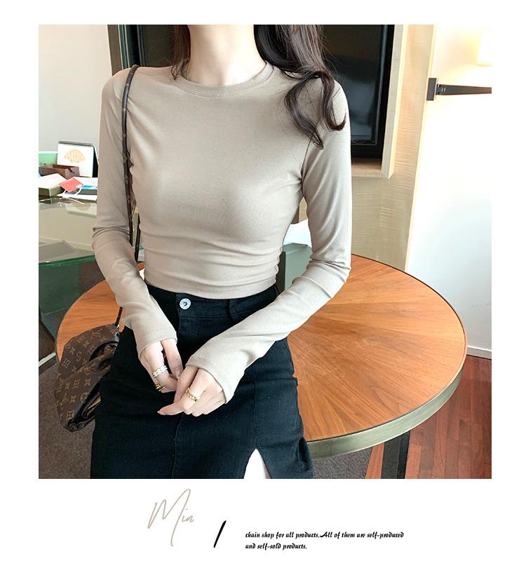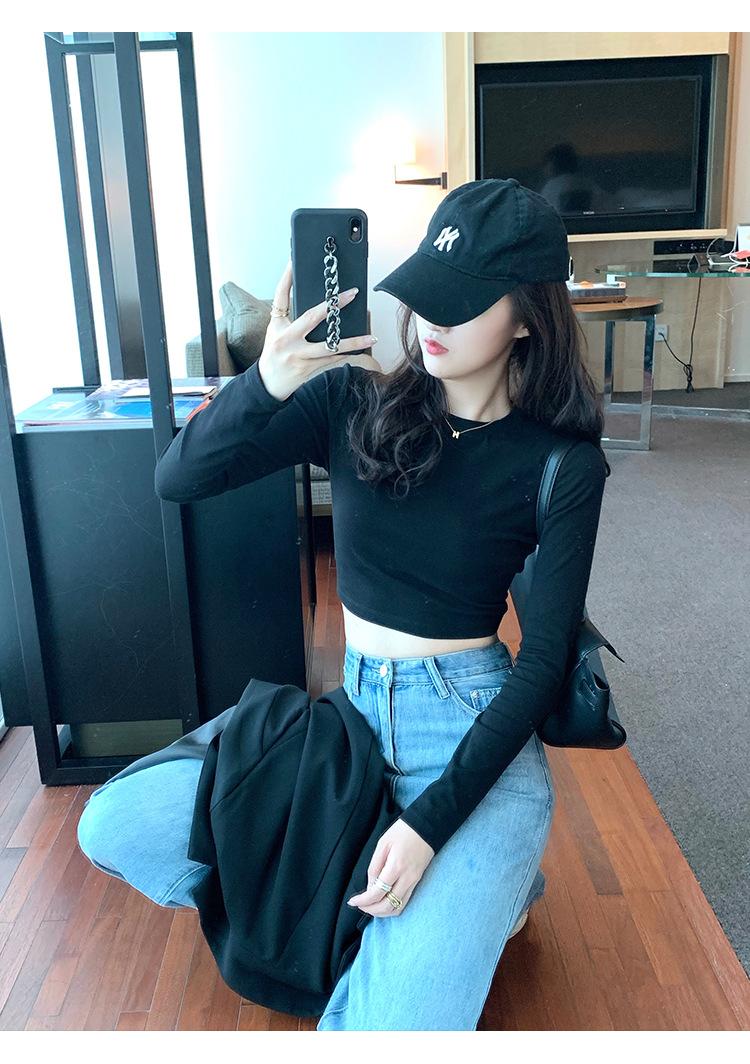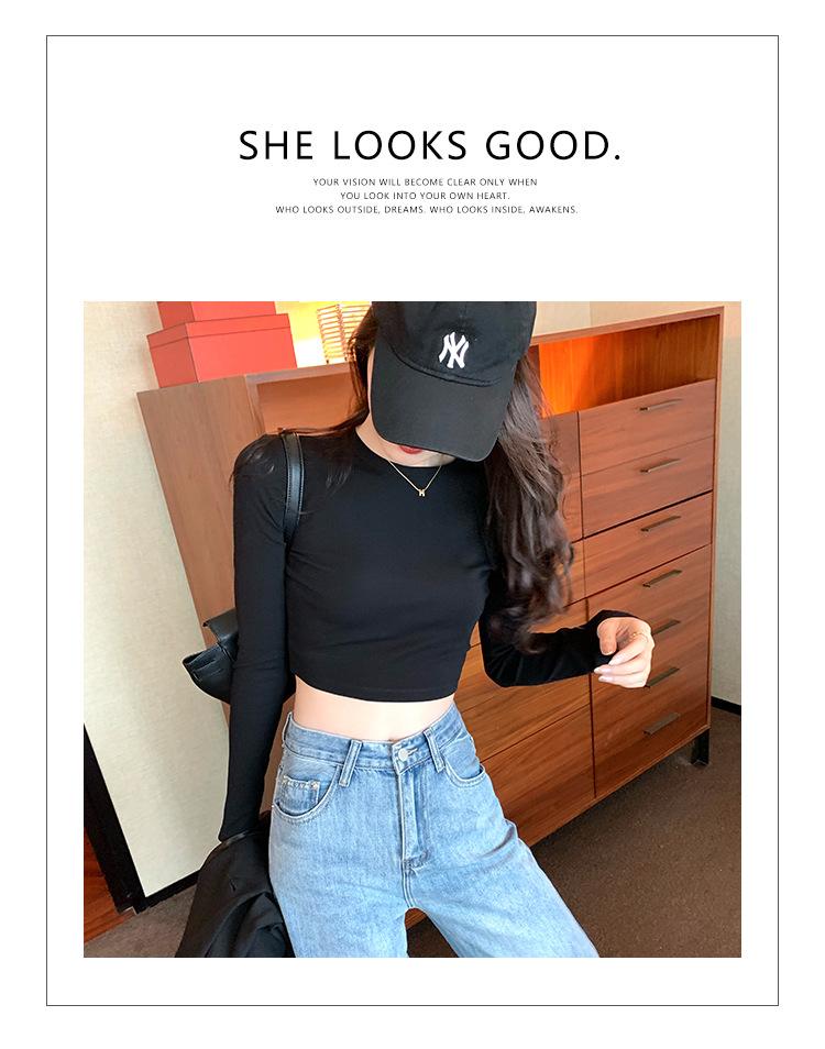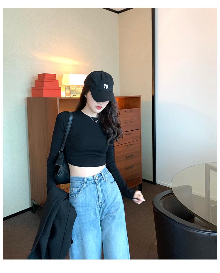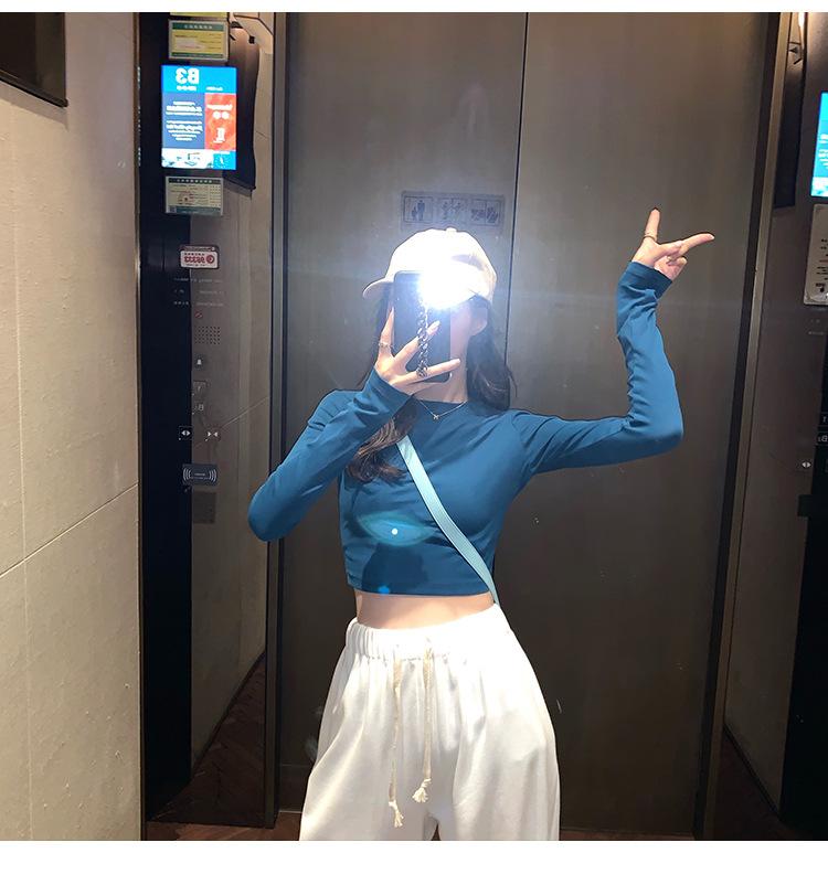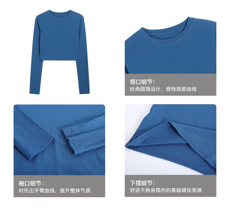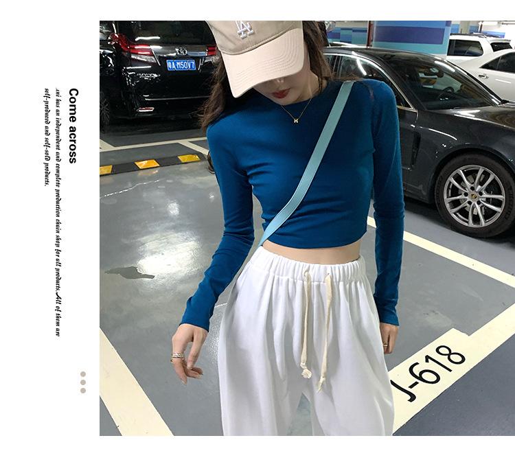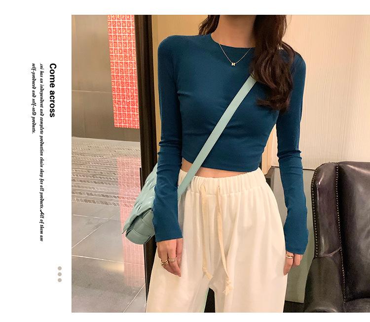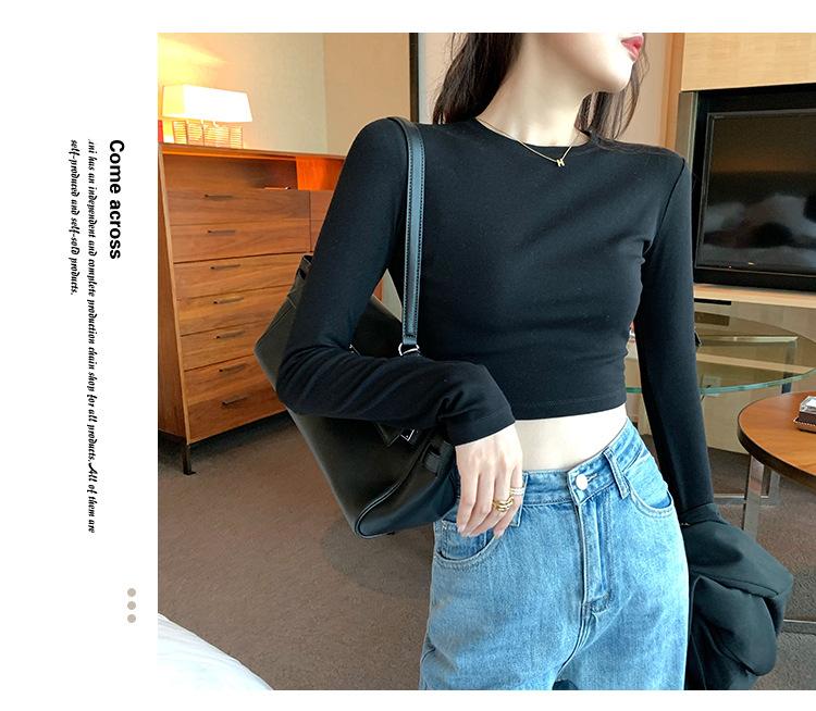 Playera Corta de Algodón Puro Seleccionado de Cintura Alta para Mujer 2025 Otoño Nuevo Estilo con Top de Manga Larga Descubriendo el Ombligo y Camiseta Básica Slim