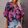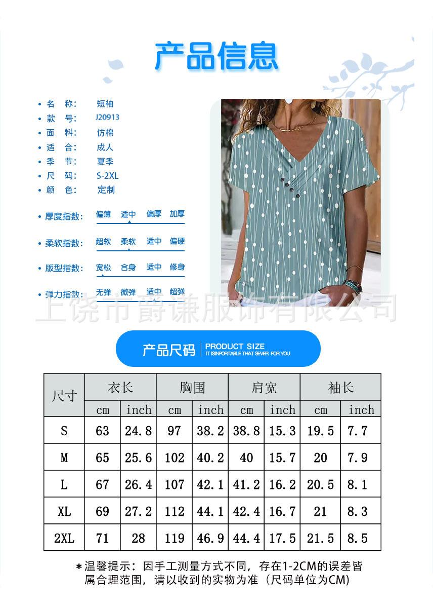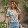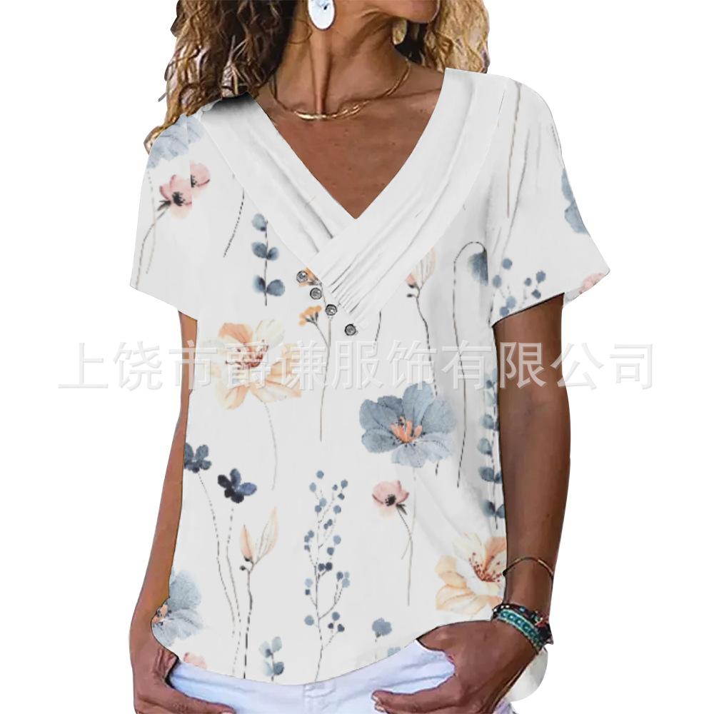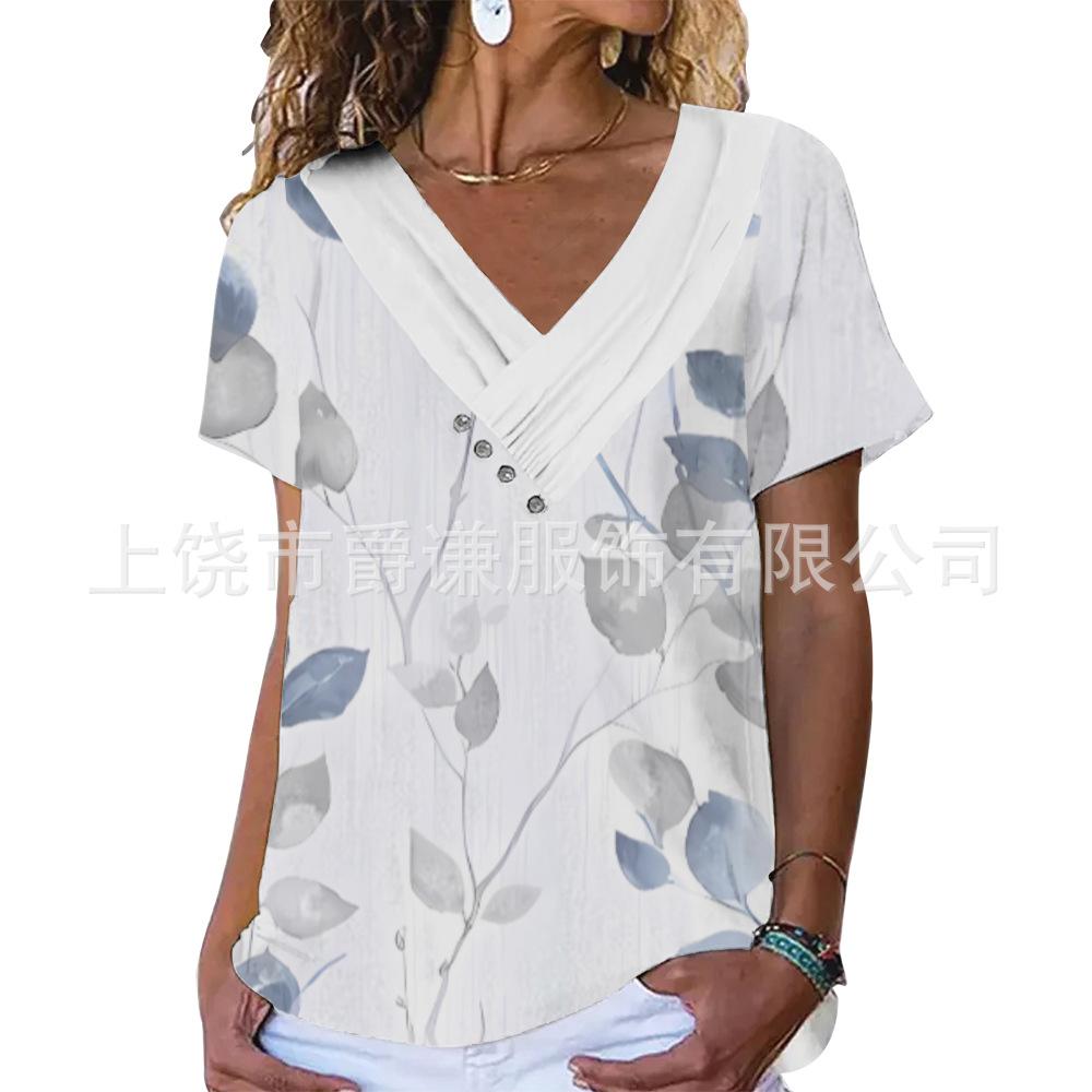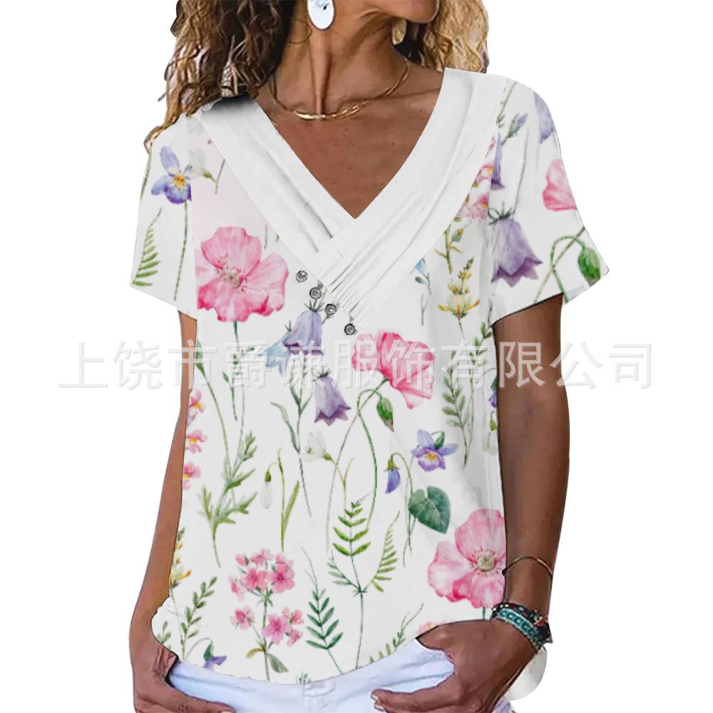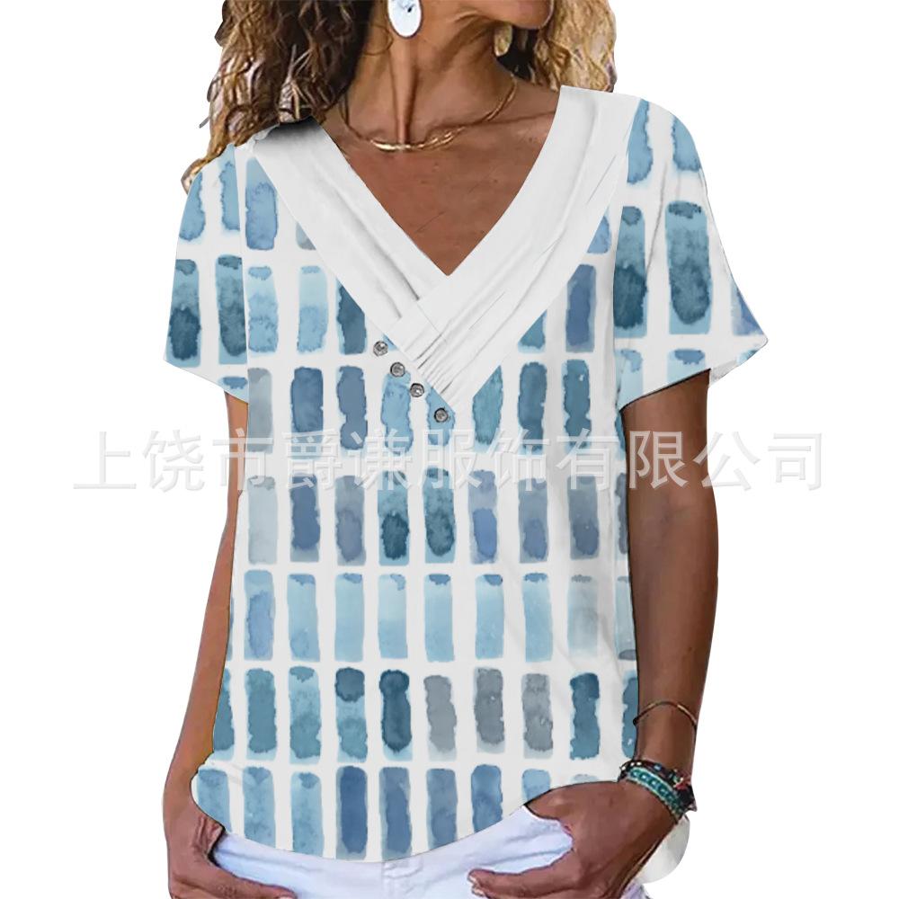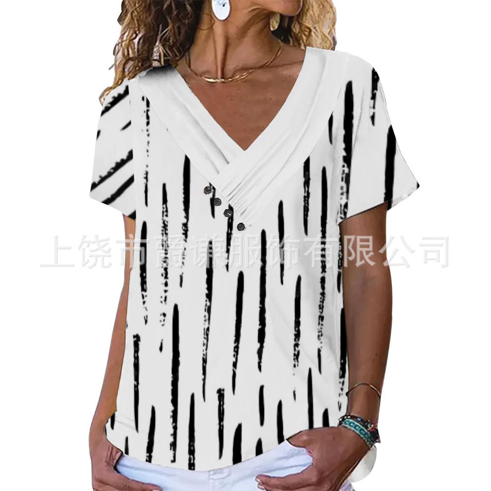 Comercio exterior transfronterizo verano caliente ropa de mujer moda europea y americana cuello en V botón camiseta impresión digital 3D jersey manga corta top