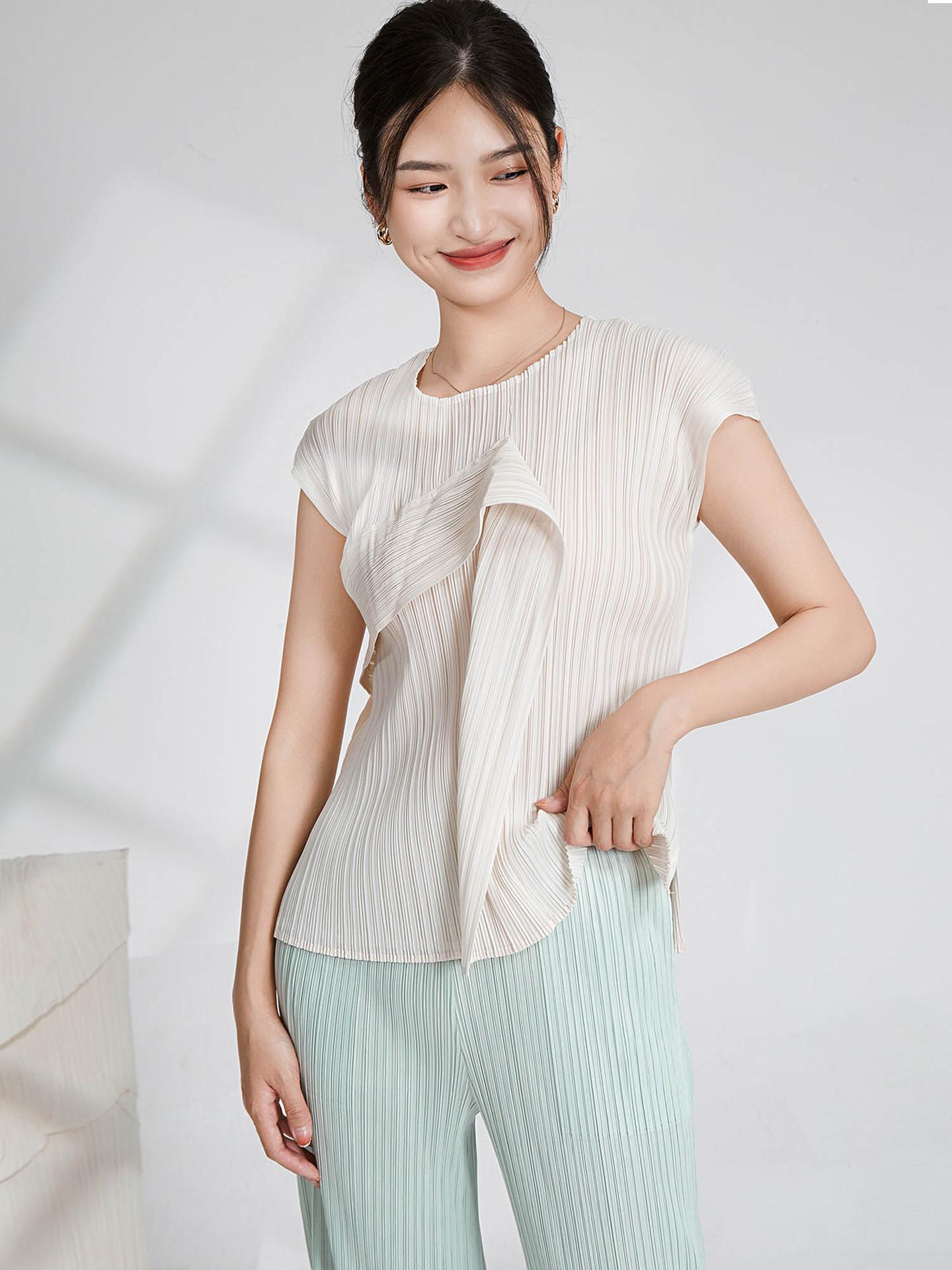 | Camiseta corta irregular Miyake, holgada y ajustada, nueva camiseta de verano, camiseta sin mangas, top plisado para mujer |