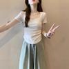| Camiseta plisada de manga corta suelta para mujer en verano, diseño, nicho, elástica, ligera, transpirable, color sólido, tops versátiles, con estilo. |