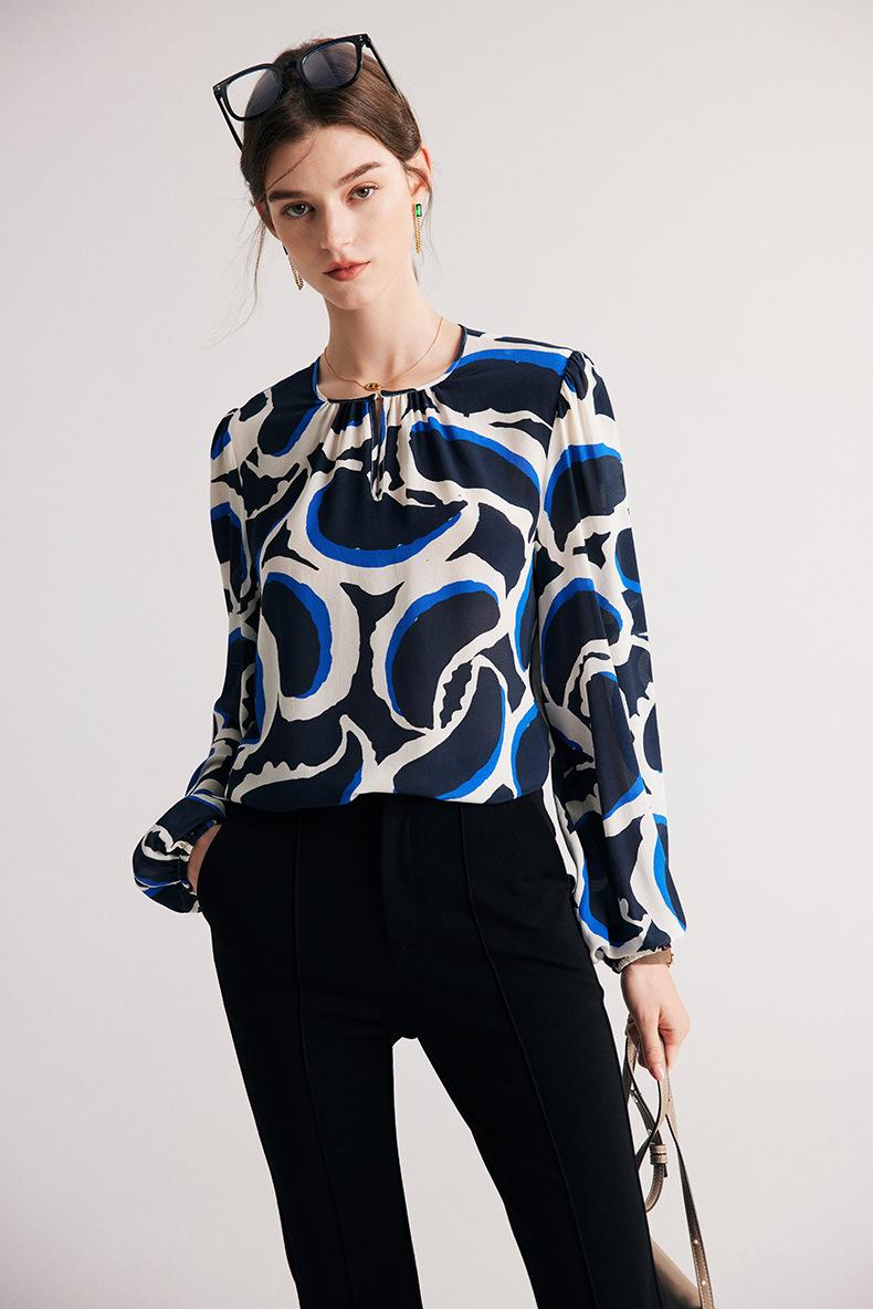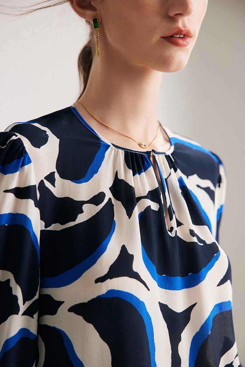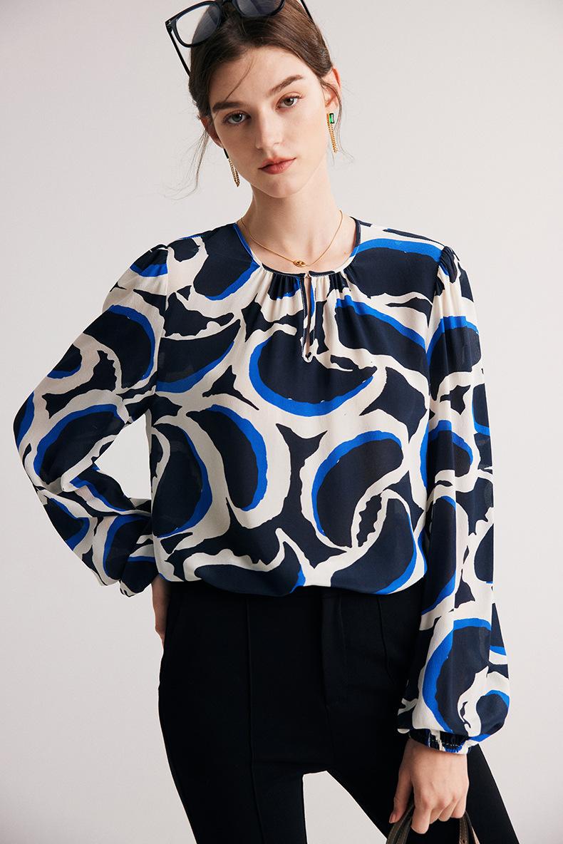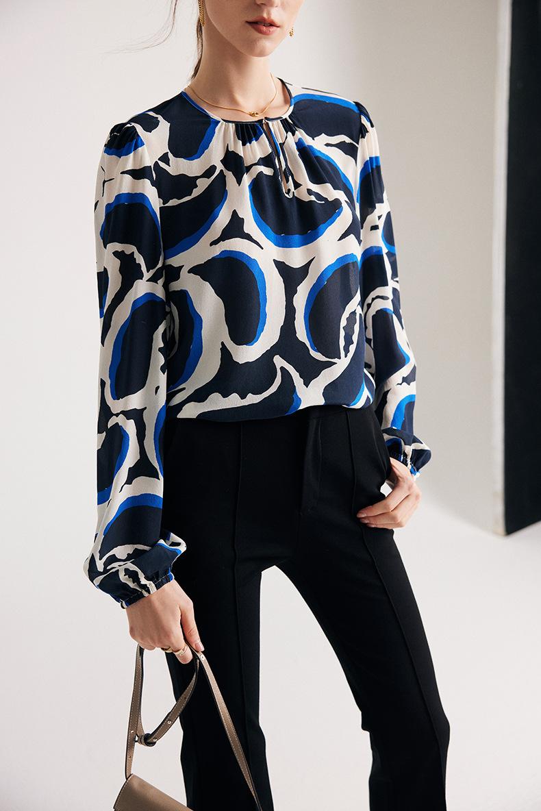Camisa de seda para mujer, primavera y verano 2025, nueva, jersey de cuello redondo estampado de crepé de China, top de seda morera 100% estampado.