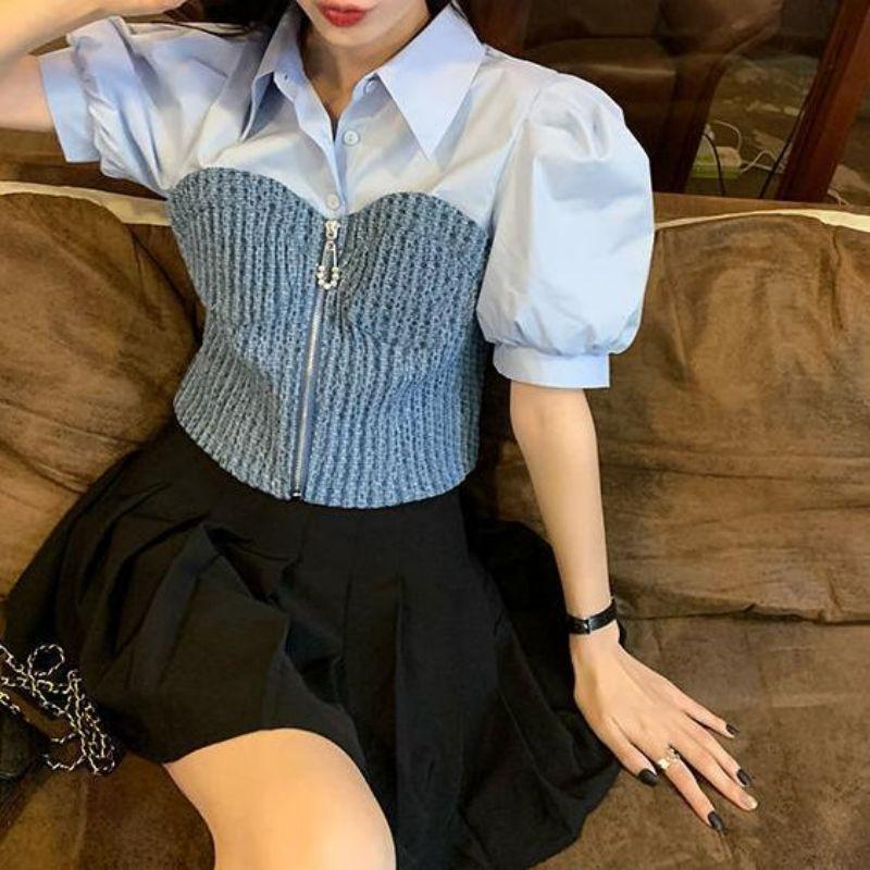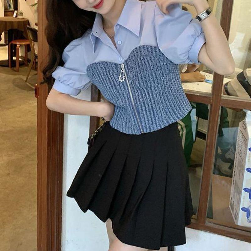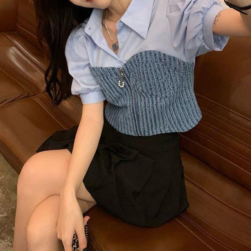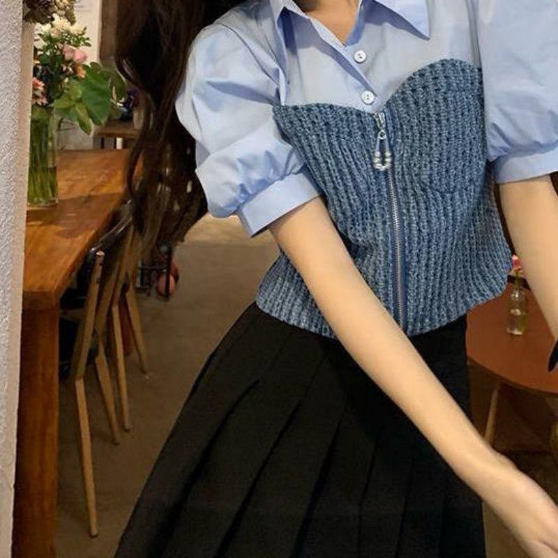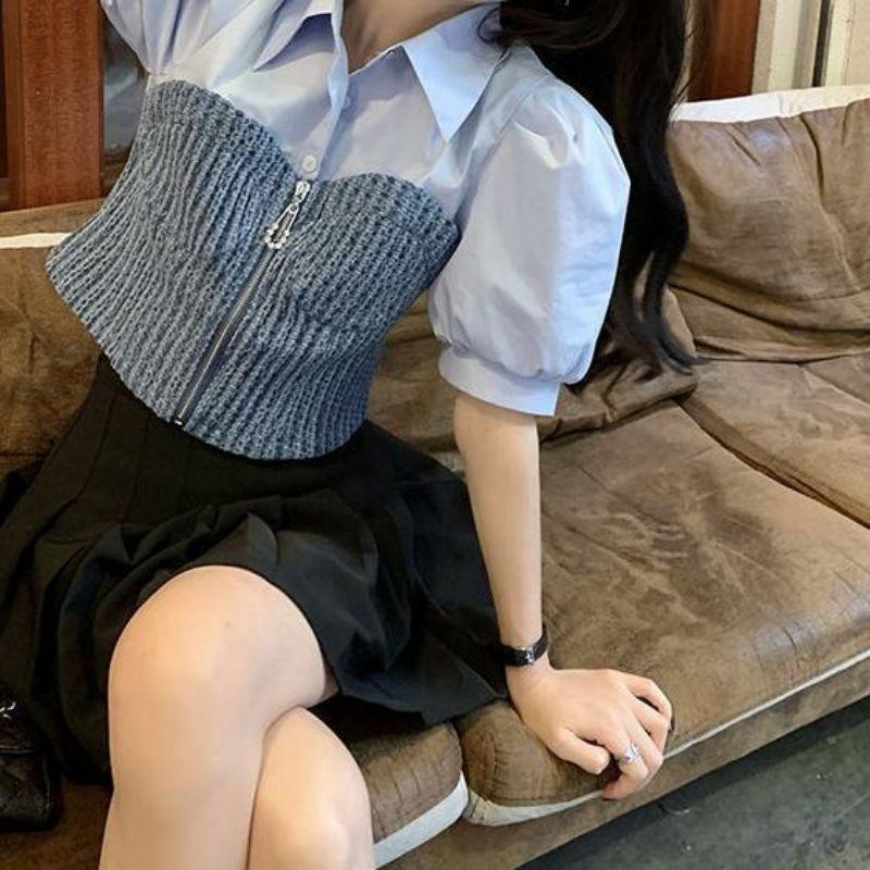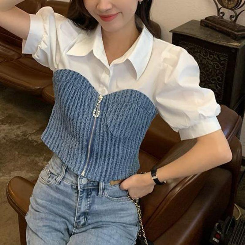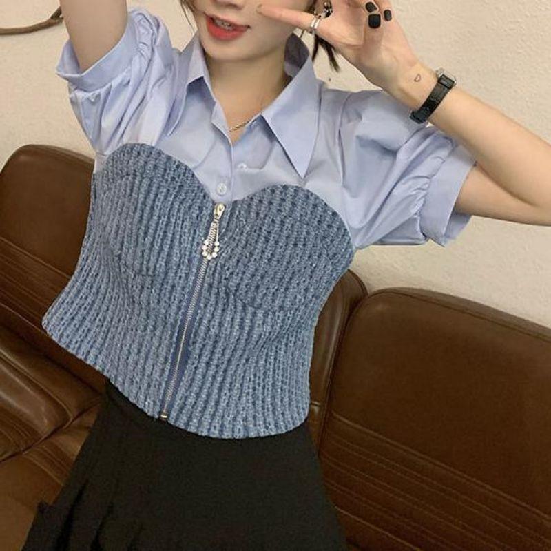 Camisa de Costura Estilo Coreano para Mujer Diseño de Nicho Verano Nuevo Vintage Ajustada Adelgazante Manga Corta Tejida Top de Cintura Baja para Mujer