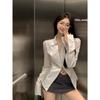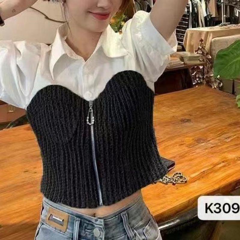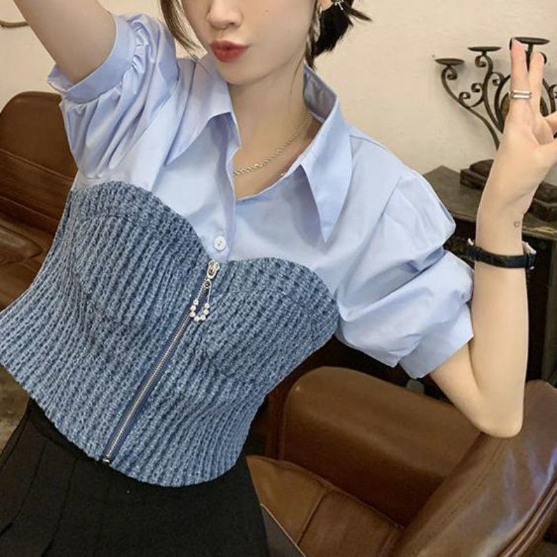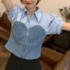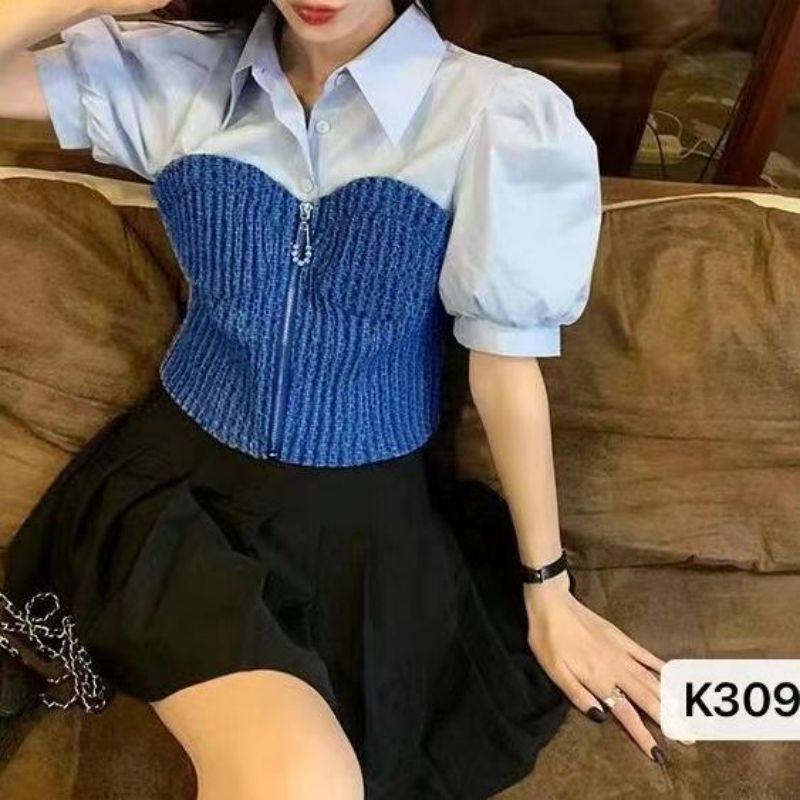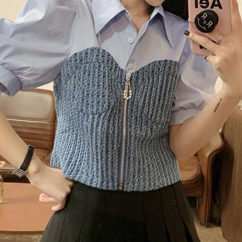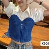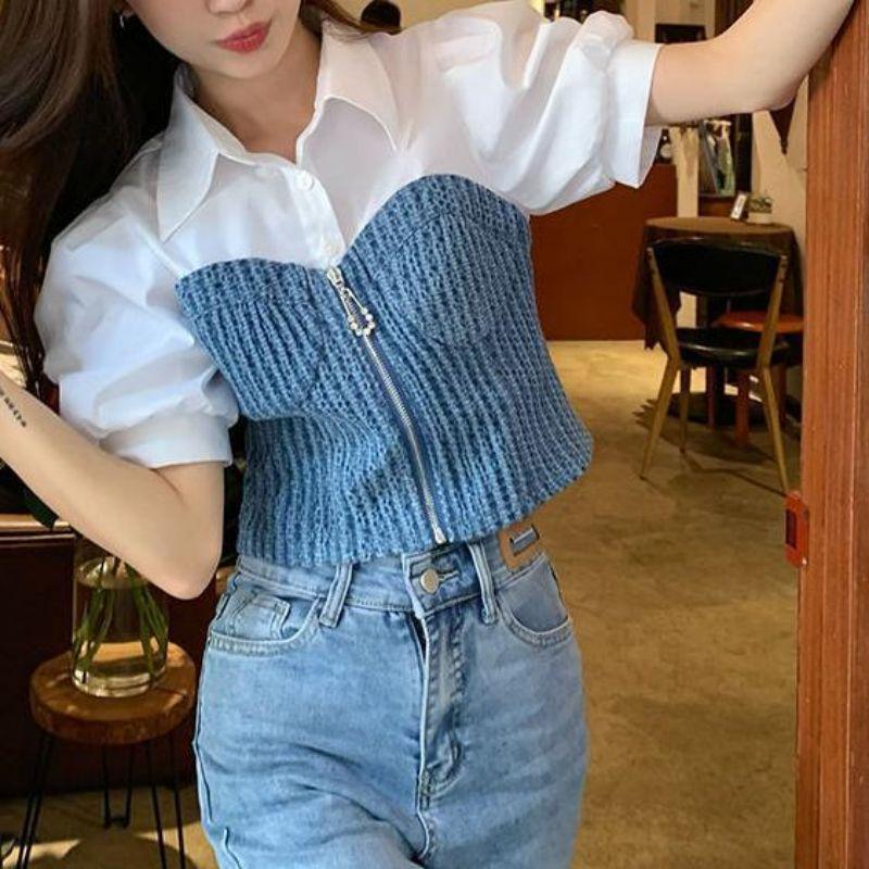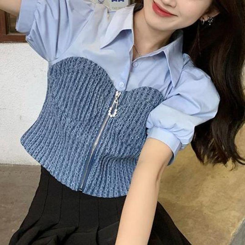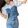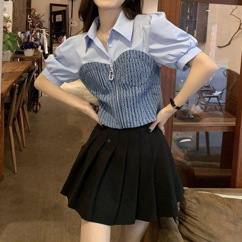 Camisa de Costura Estilo Coreano para Mujer Diseño de Nicho Verano Nuevo Vintage Ajustada Adelgazante Manga Corta Tejida Top de Cintura Baja para Mujer