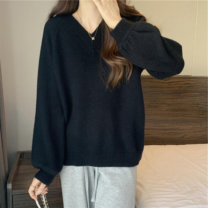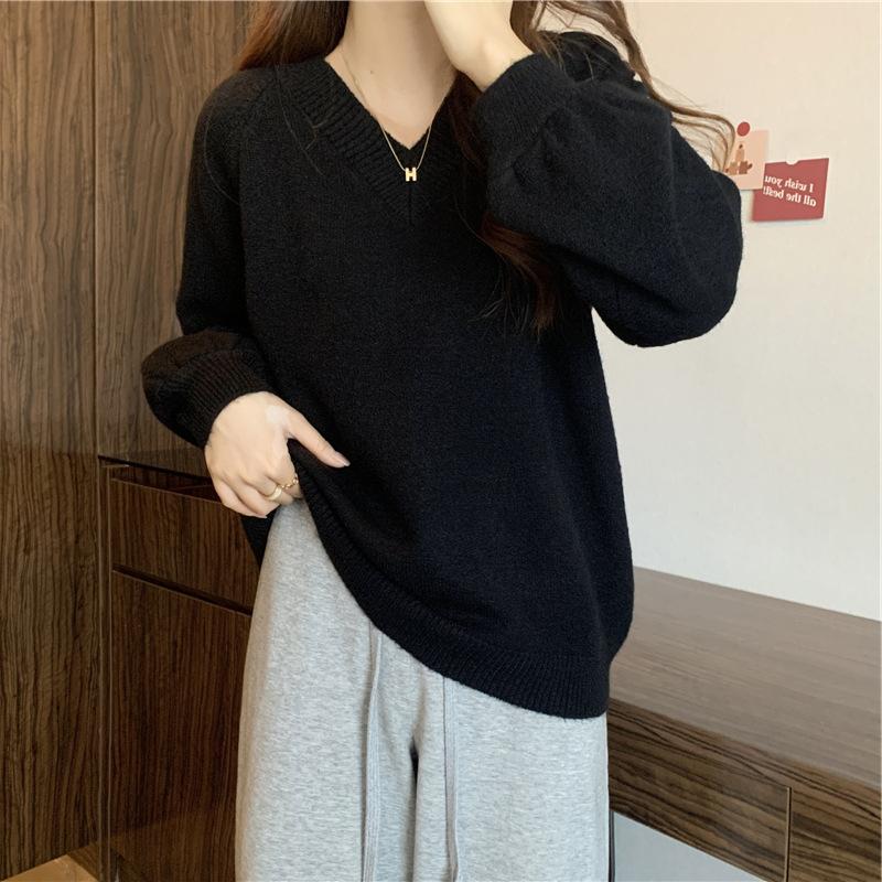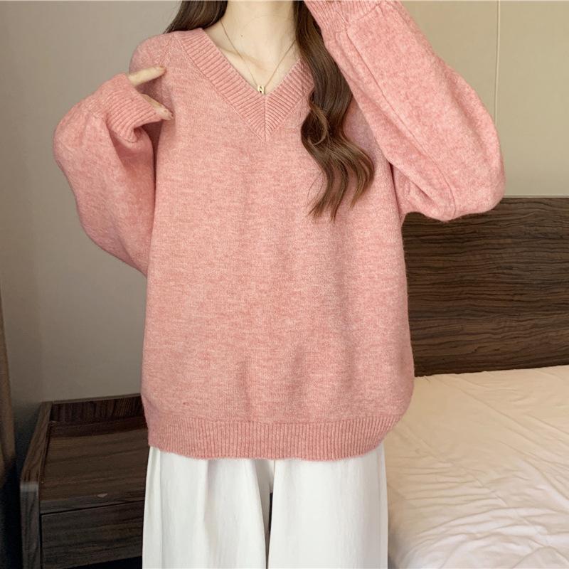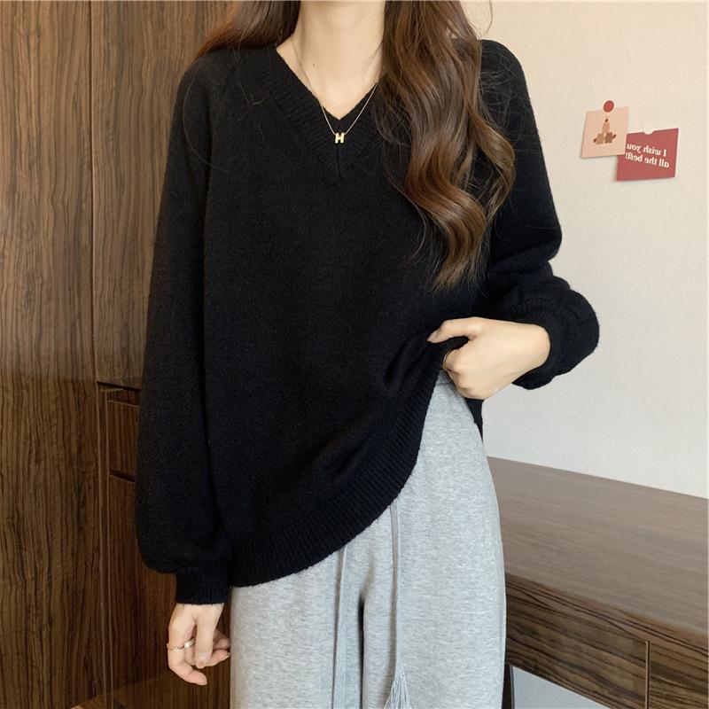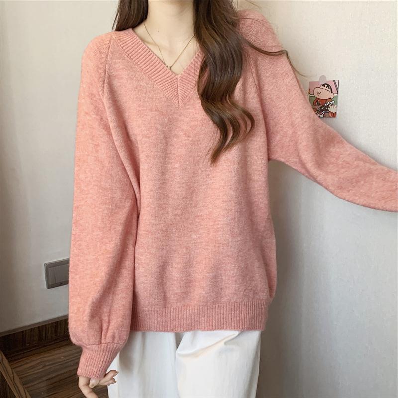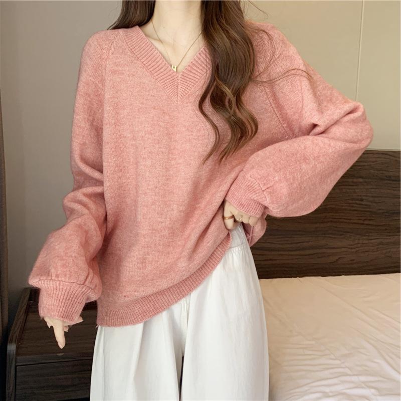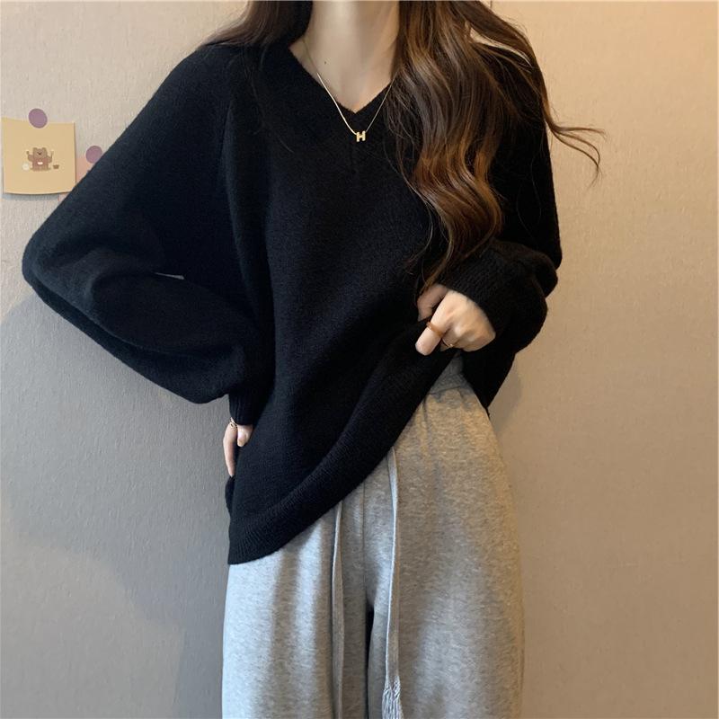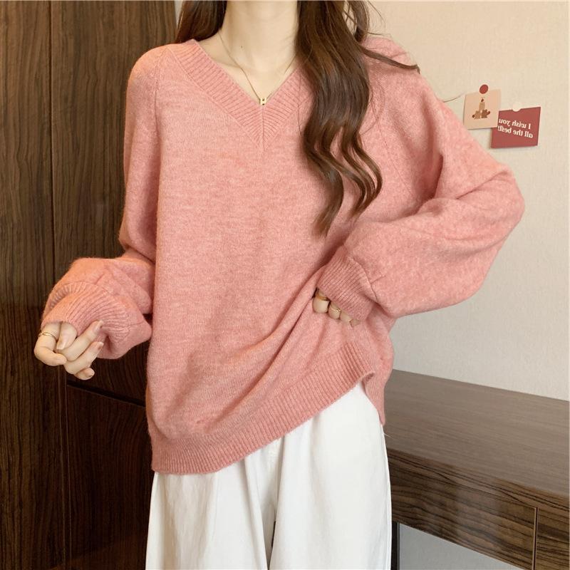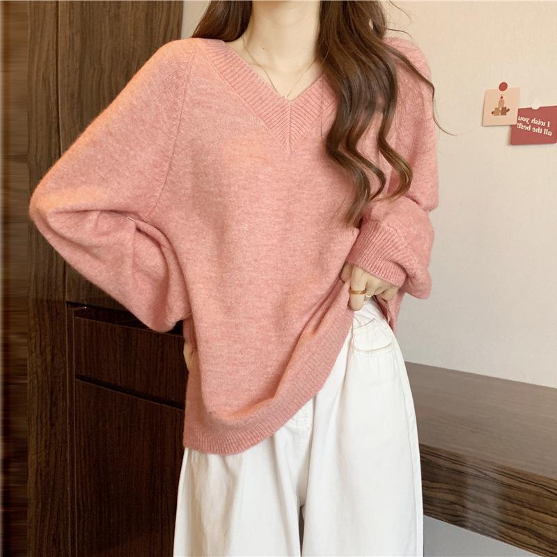 Suéter de cuello en V de alta gama, suave y ceroso, de color liso, para mujer, otoño e invierno, nuevo estilo holgado, camisa básica de punto ajustada.