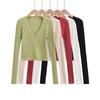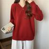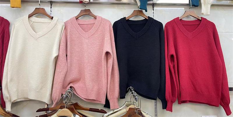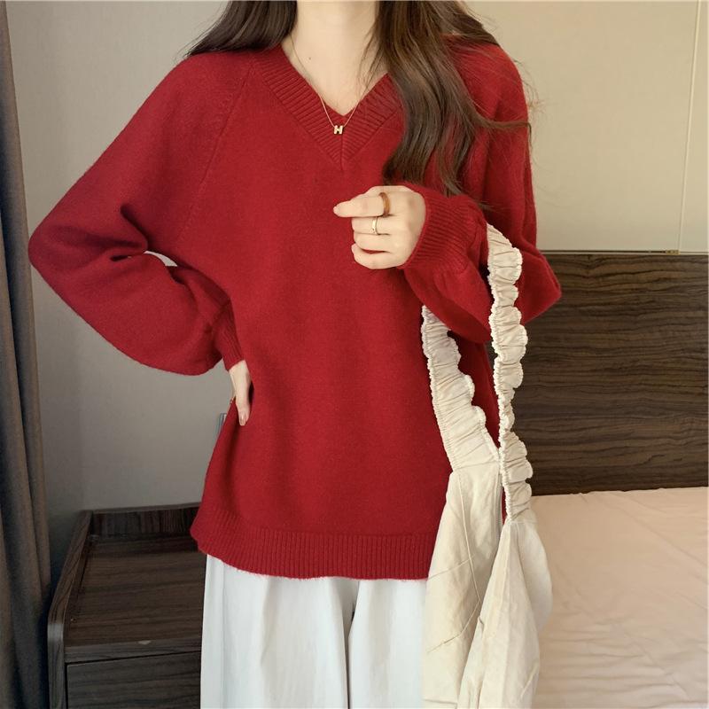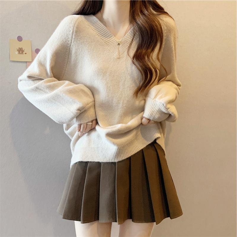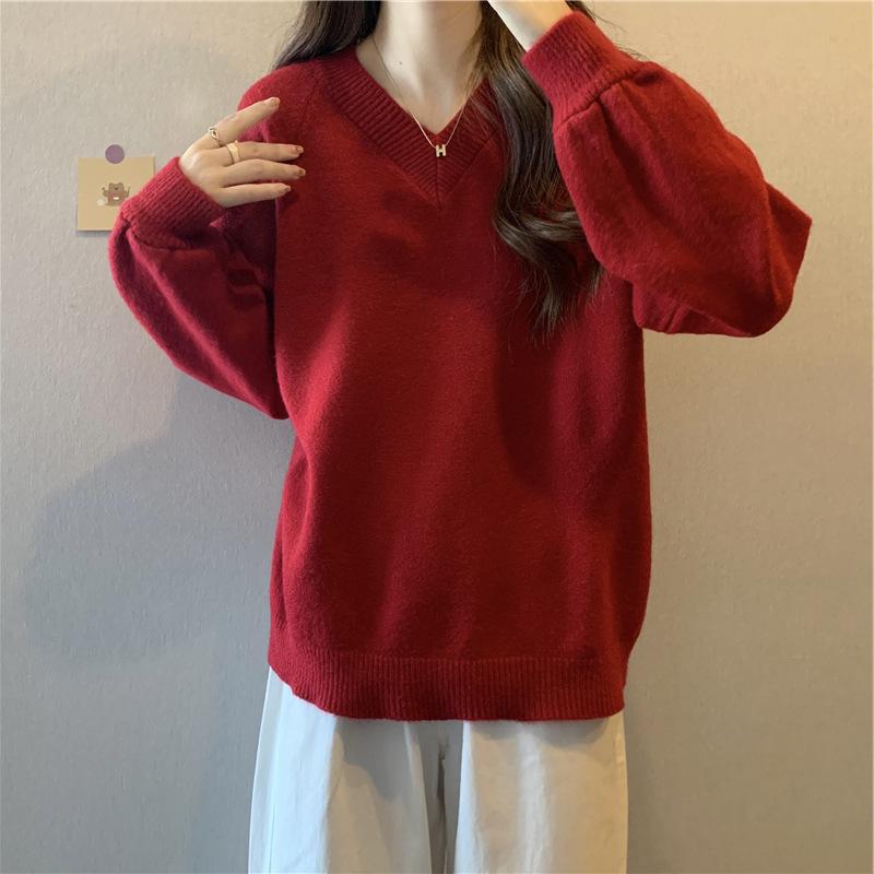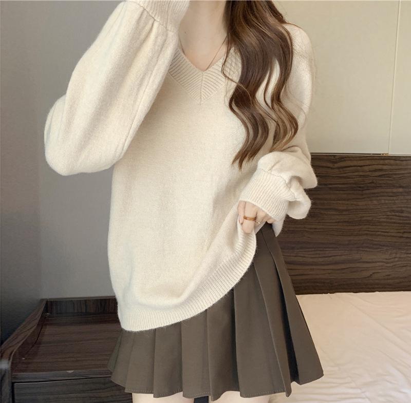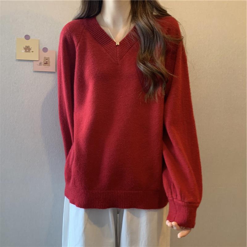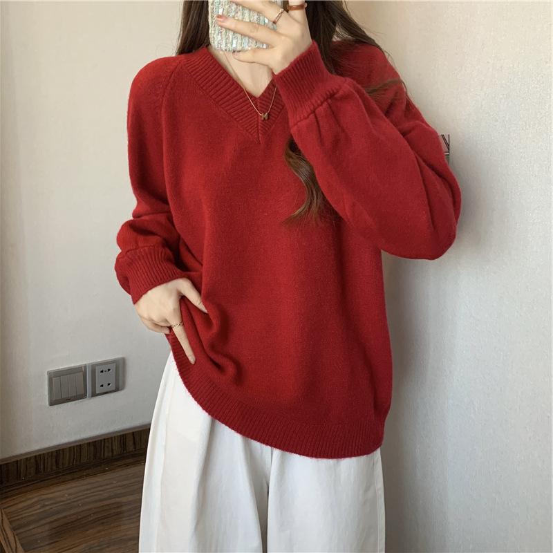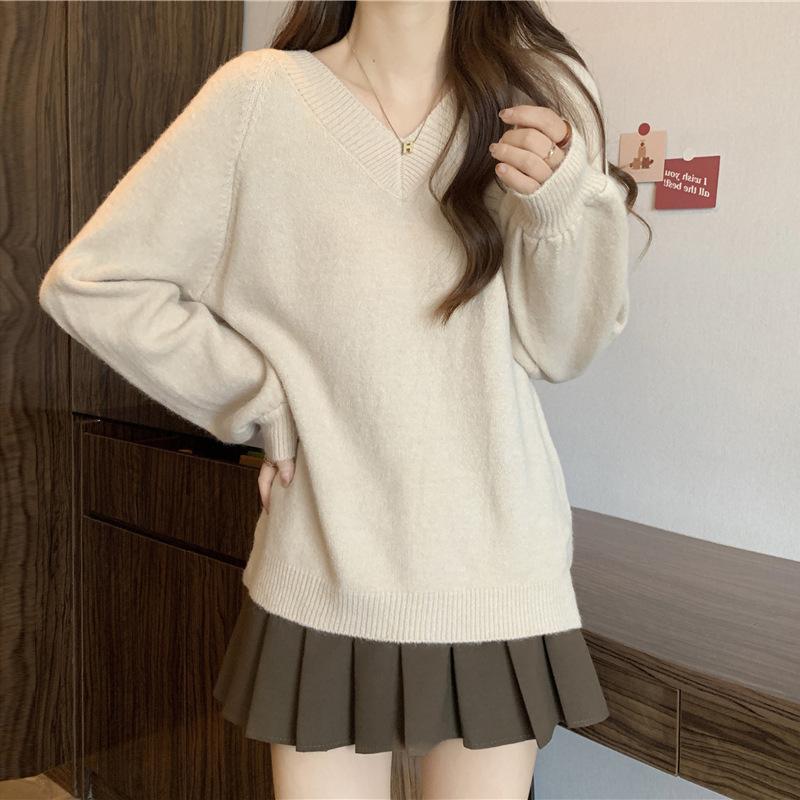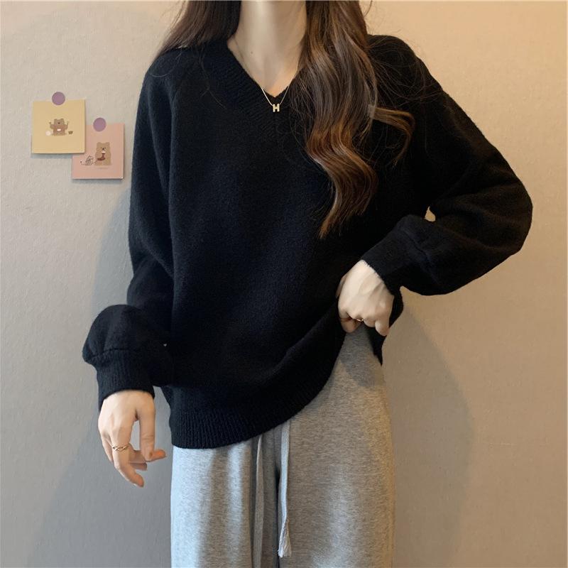 Suéter de cuello en V de alta gama, suave y ceroso, de color liso, para mujer, otoño e invierno, nuevo estilo holgado, camisa básica de punto ajustada.