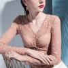 Camisa básica con cuello en V y costuras de malla para mujer, estampada, ajustada, estilo occidental, de encaje, primavera y otoño, 2023