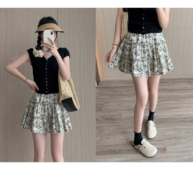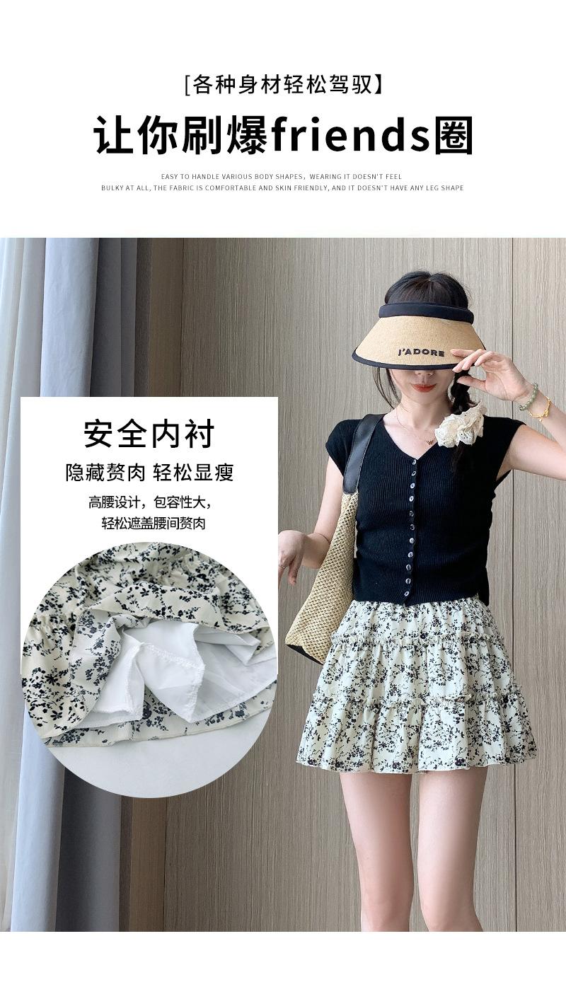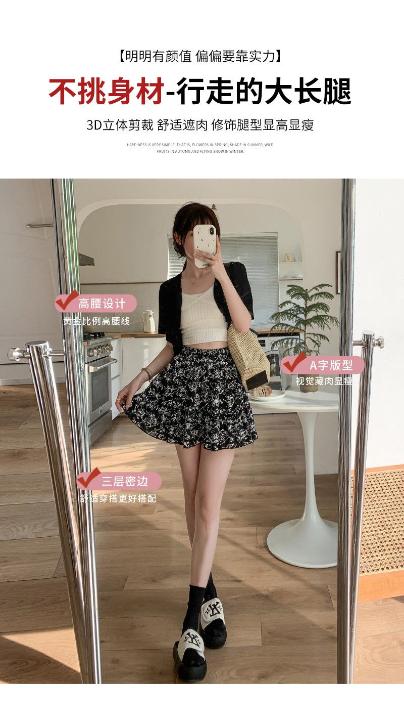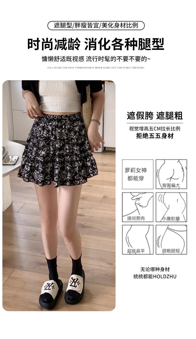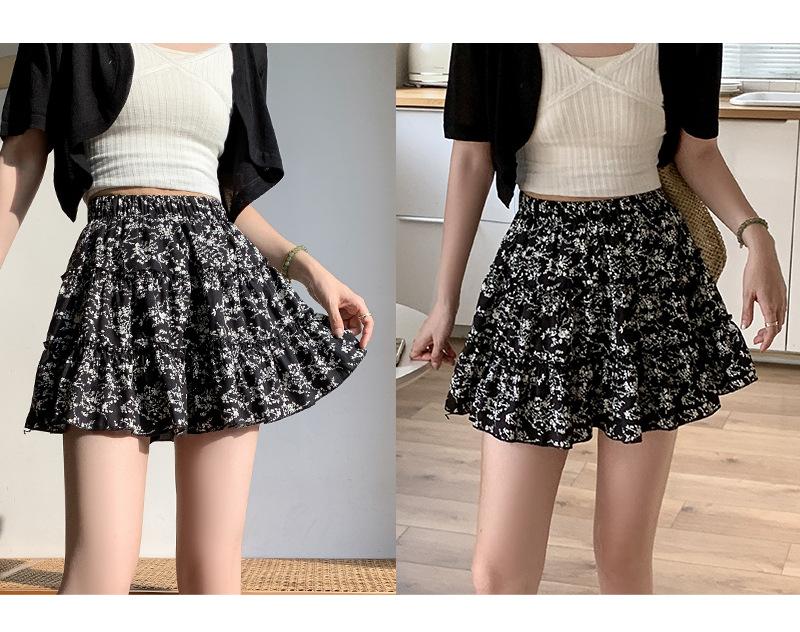 Dulce Falda de Pastel de Borde Delgado de Flores para Mujer Verano Cintura Alta Plisada Versátil Esponjosa Línea A Falda Anti-Exposición