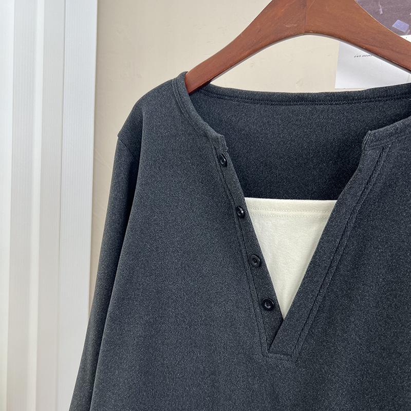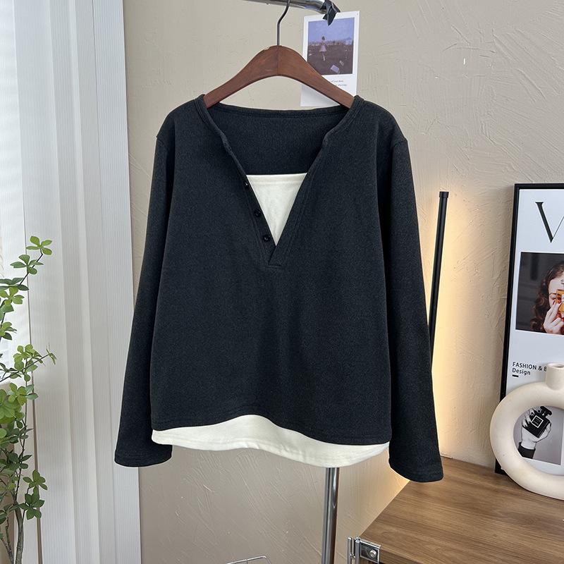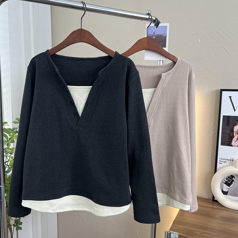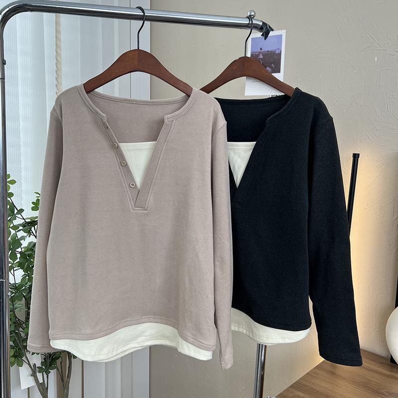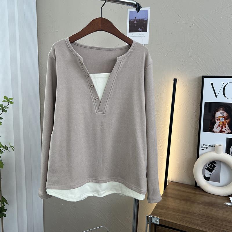 Terciopelo de Doble Cara Súper Cálido Básico Versátil Cuello en V Abotonadura Inferior Camisa 2023 Nuevo Top de Otoño e Invierno de Dos Piezas Falsas para Mujer