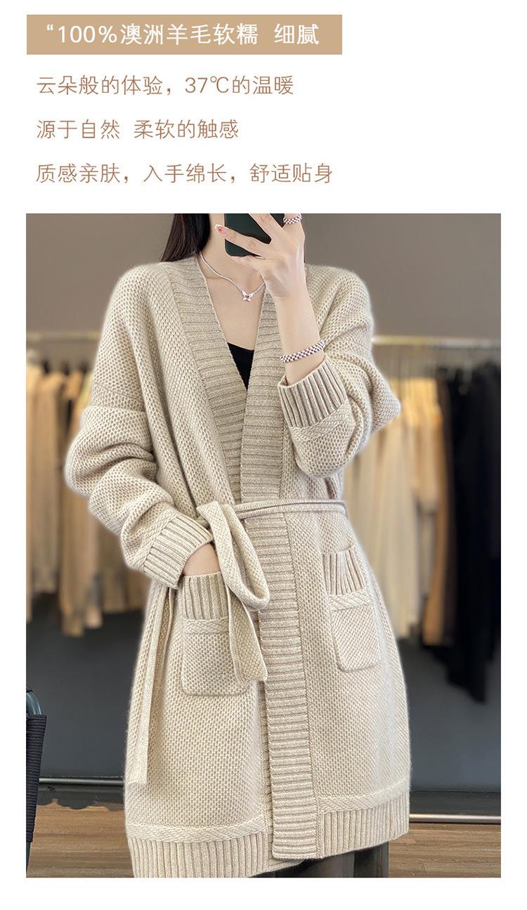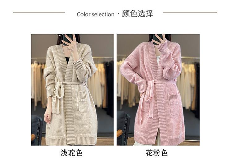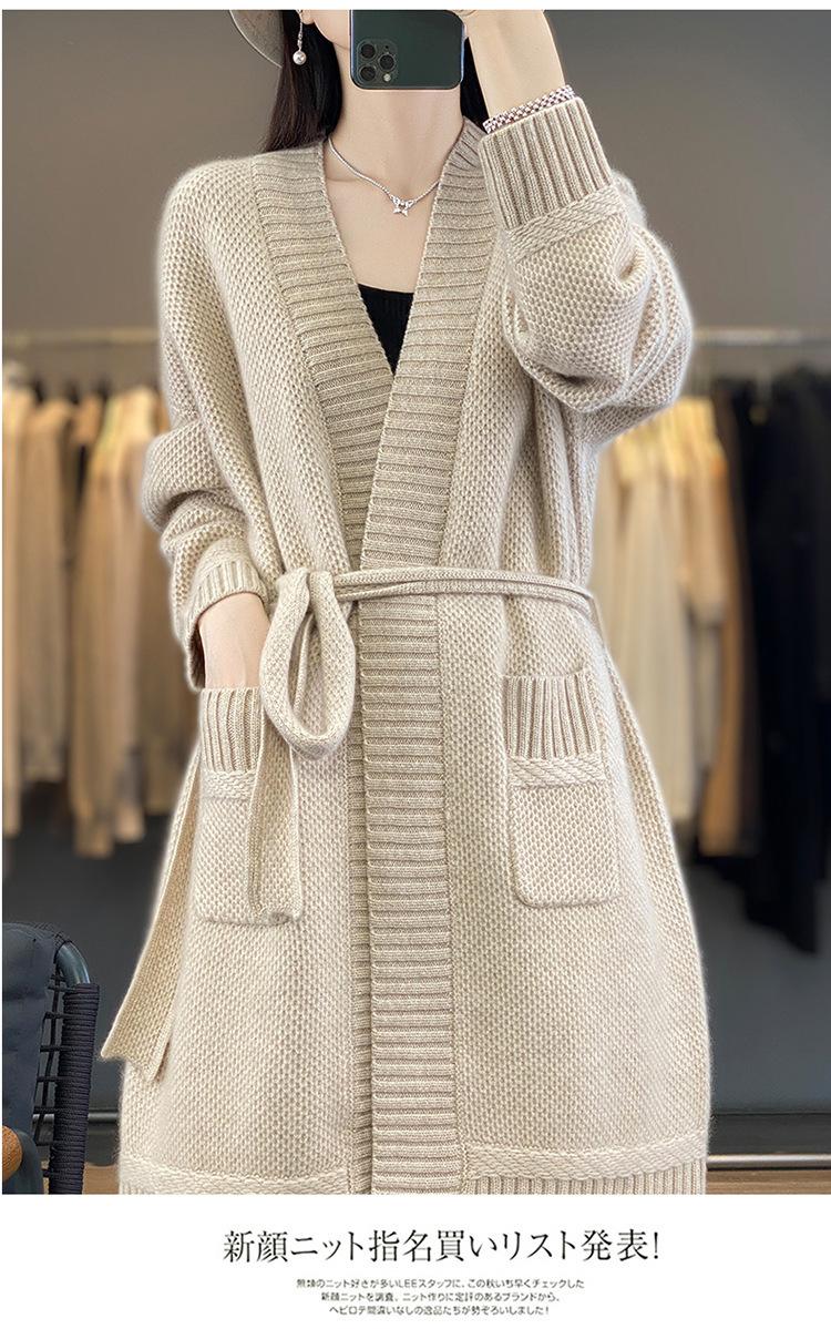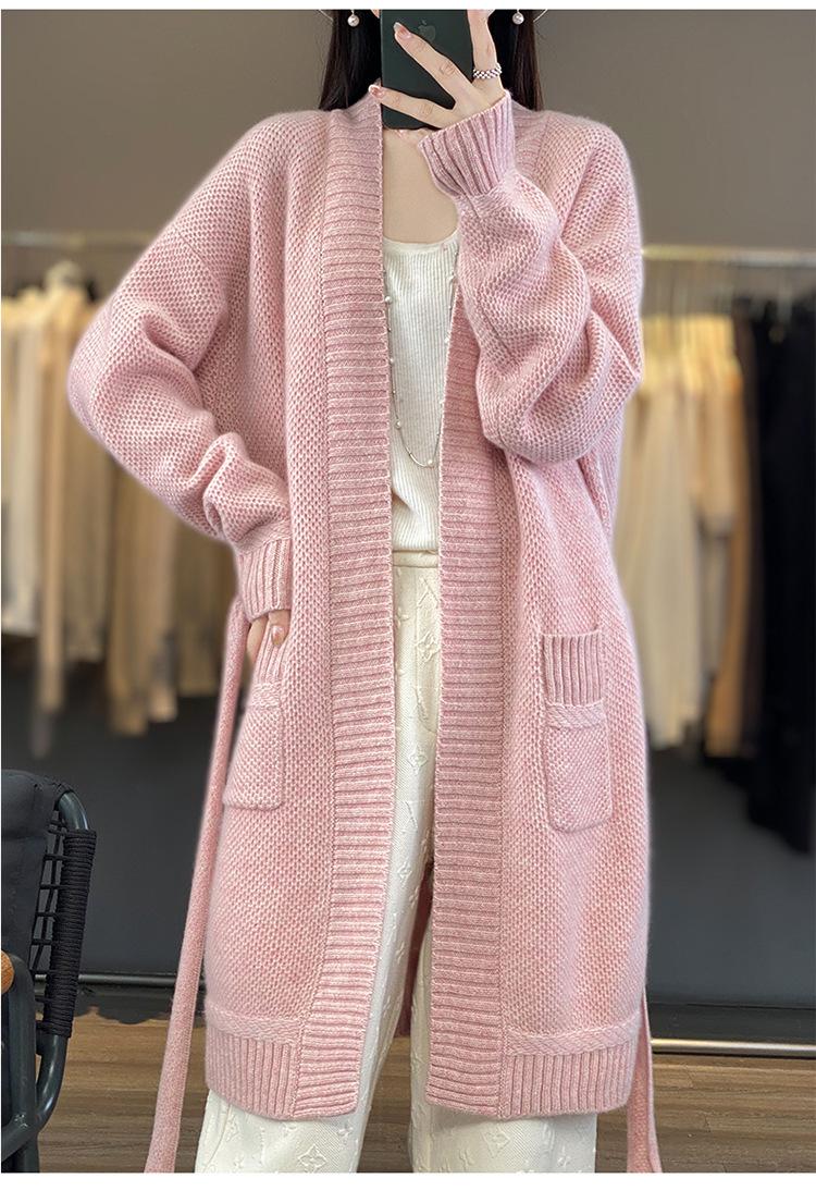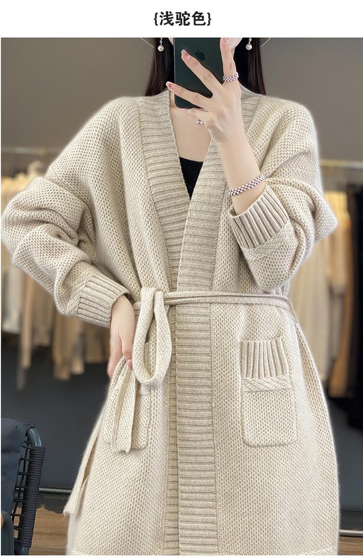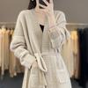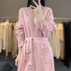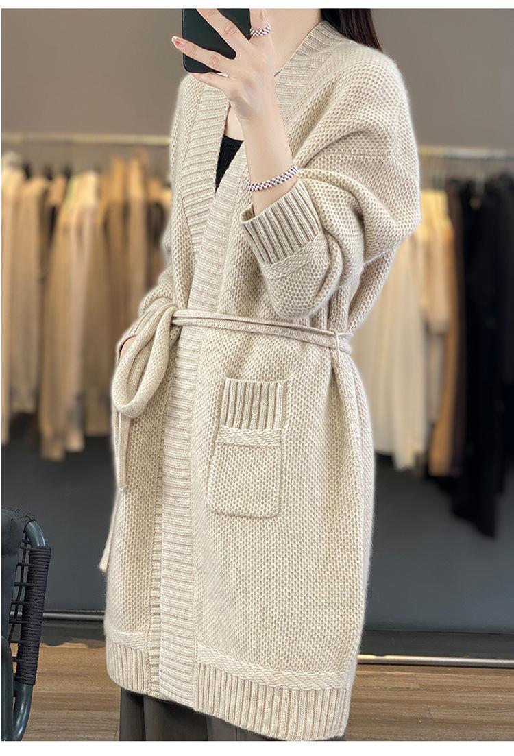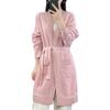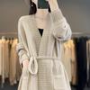Suéter de Lana de Largo Medio con Cuello en V 2025 para Mujer con Cinturón, Abrigo Jacquard de Manga Larga, Cárdigan Holgado de Cachemira