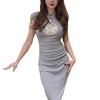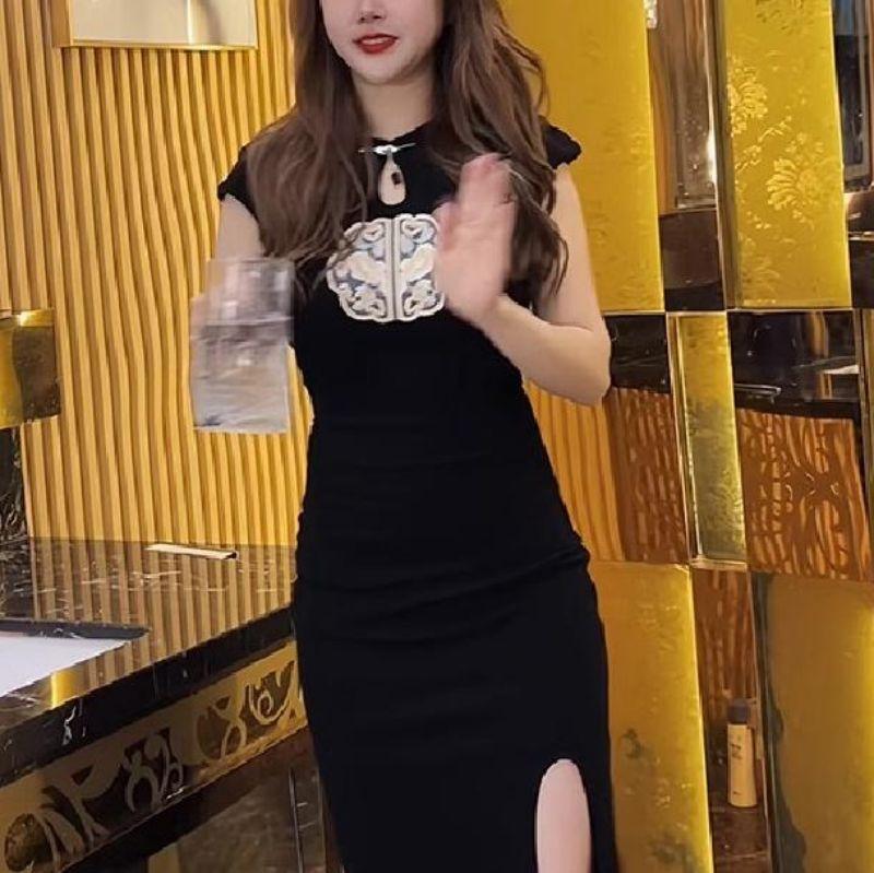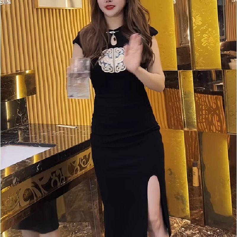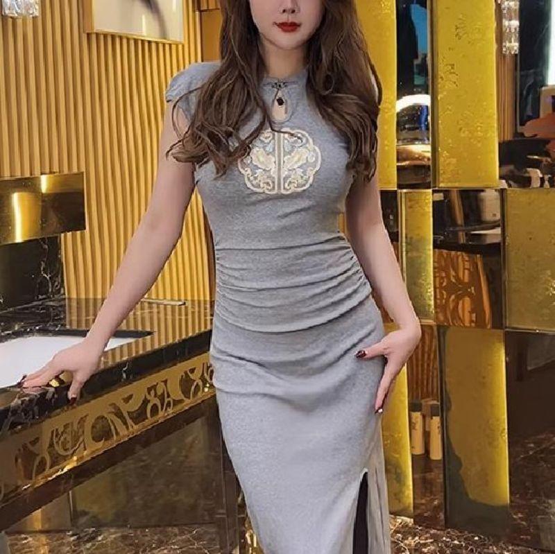Vestido Nuevo Estilo Chino Cuello Mao Botón de Placa Bordado Abertura para Mujer Verano Nuevo Adelgazante Cintura Alta Ajustado Falda Larga Slim