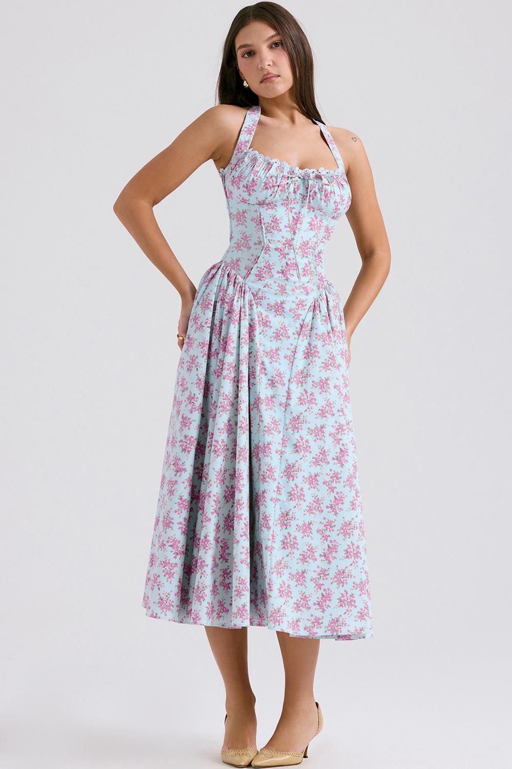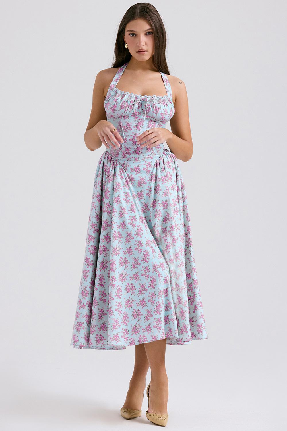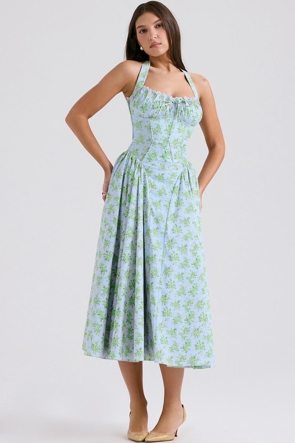 Vestido largo ajustado de verano 2025, estilo europeo y americano, con cuello estampado y encaje.
