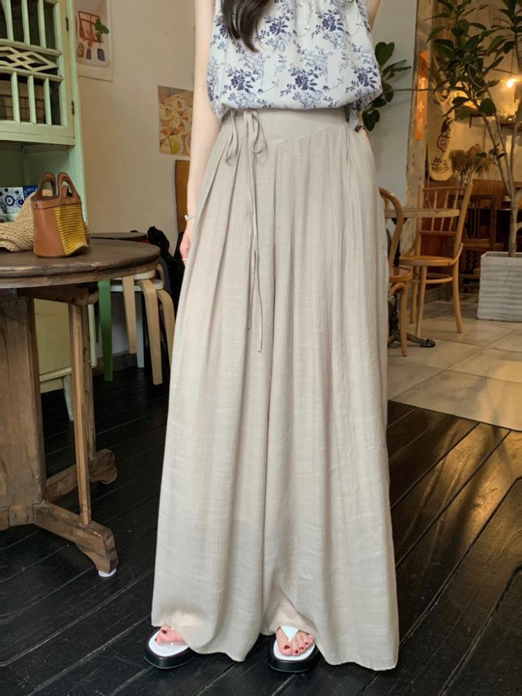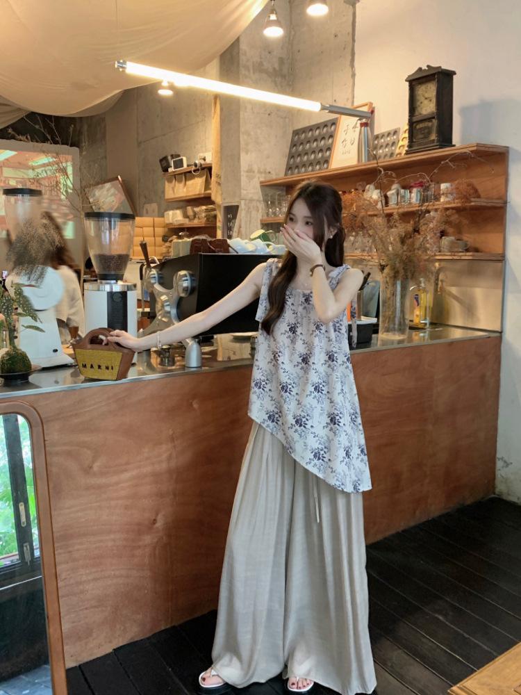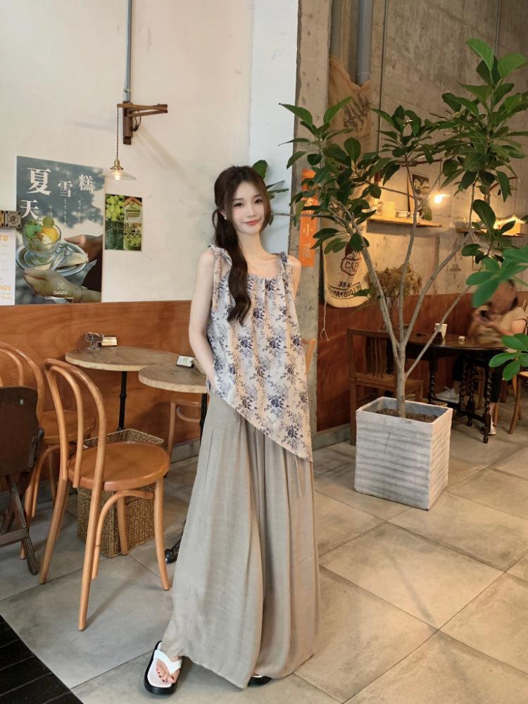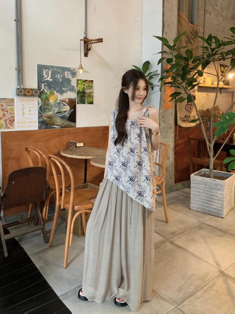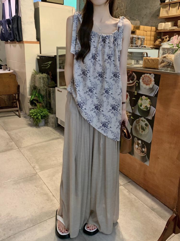 Pantalones largos de pierna ancha con encaje floral estilo coreano, holgados, de corte irregular, con tirantes, combinables, 65594