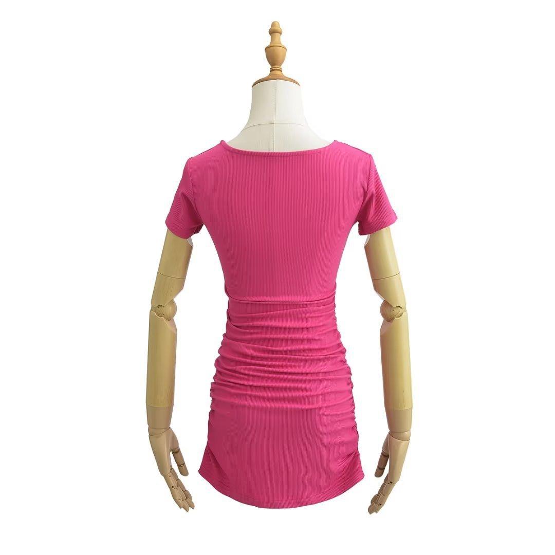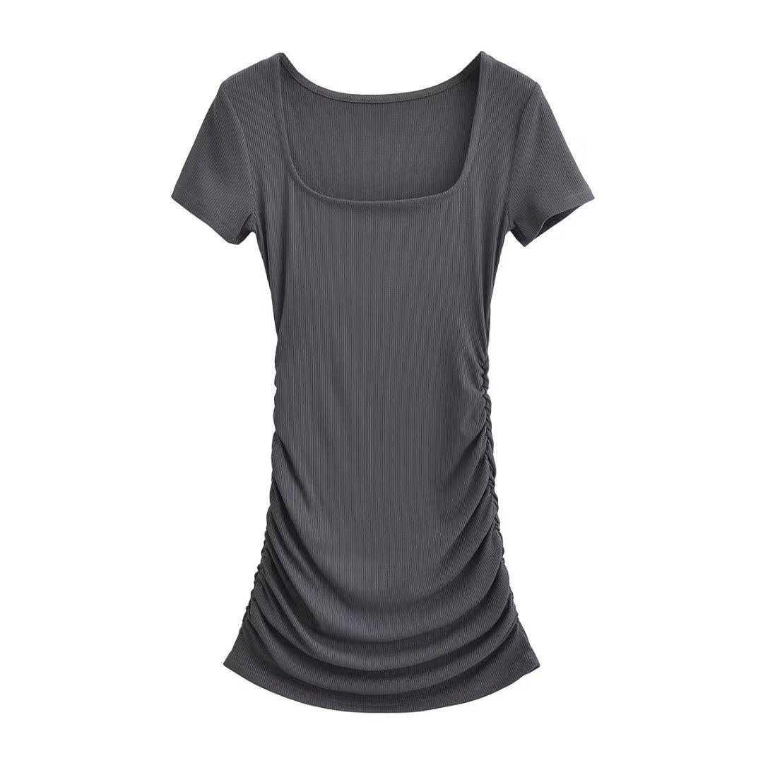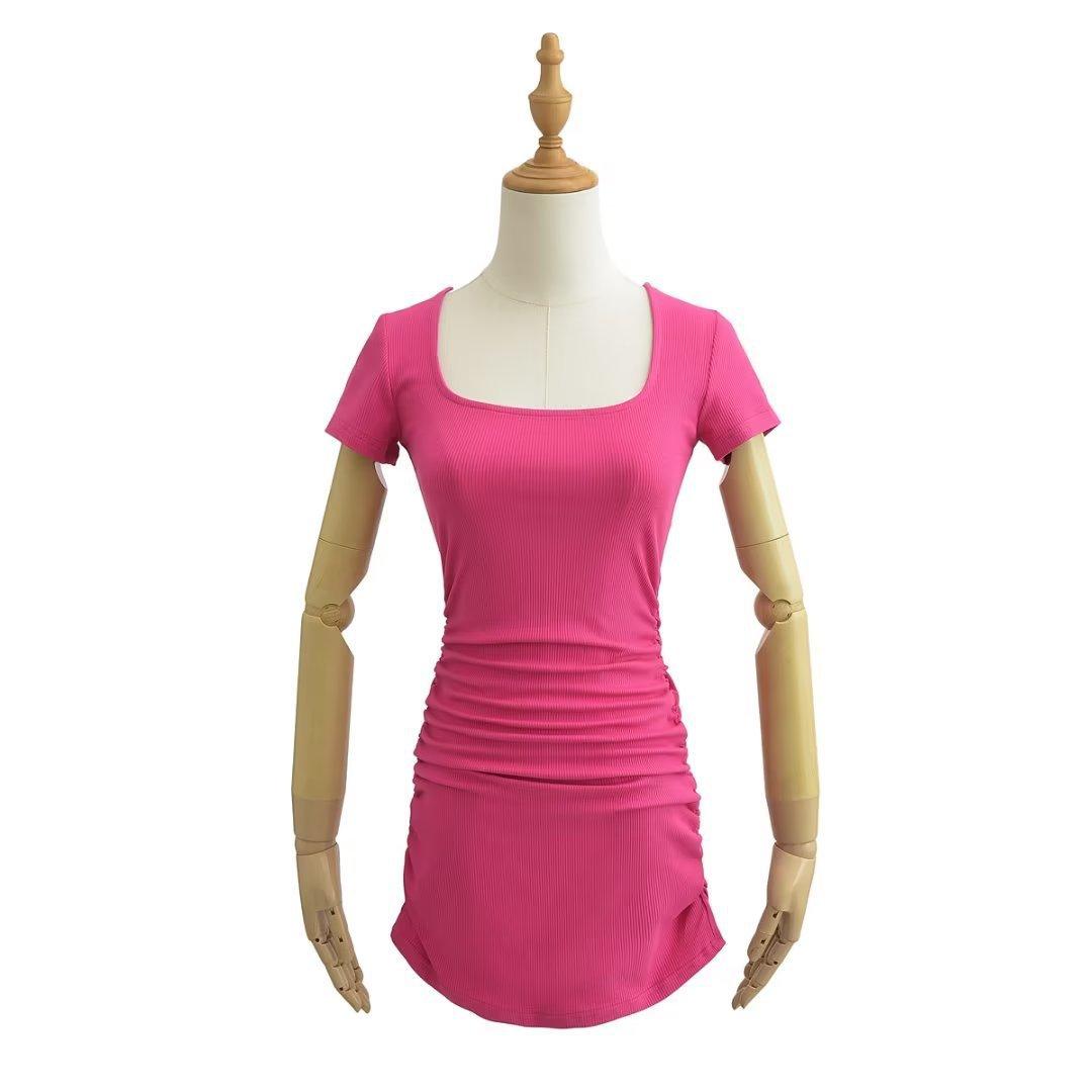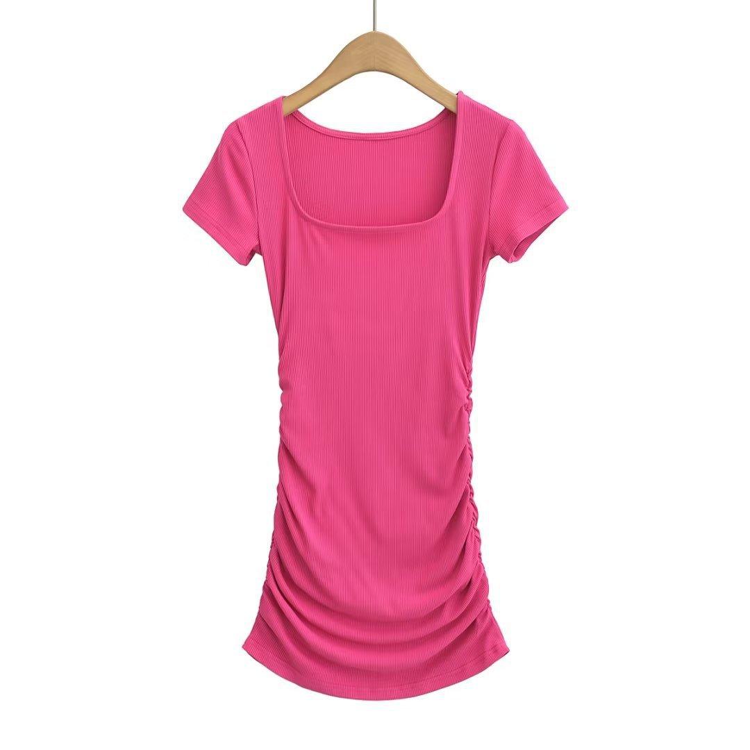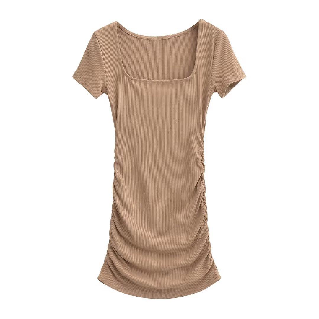 Vestido plisado de manga corta con cuello cuadrado estilo europeo y americano para mujer, verano 2023, nuevo, falda ajustada elástica de color sólido