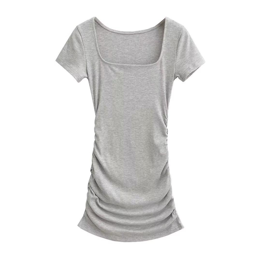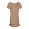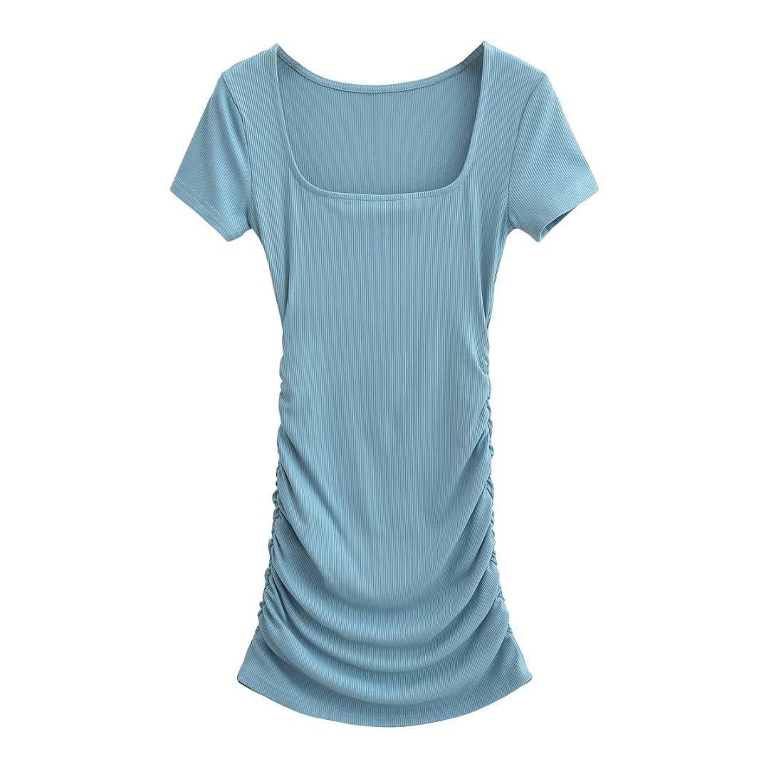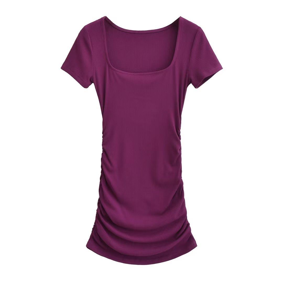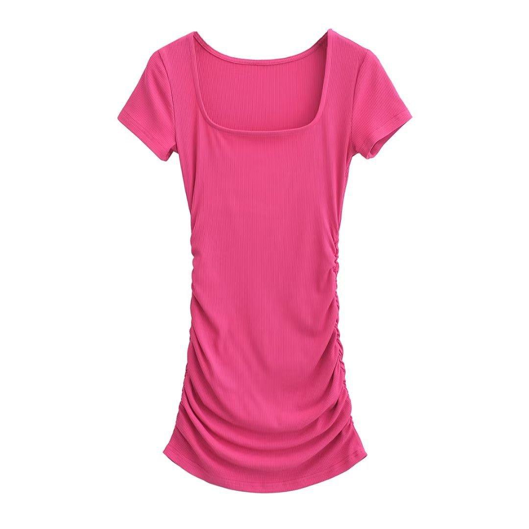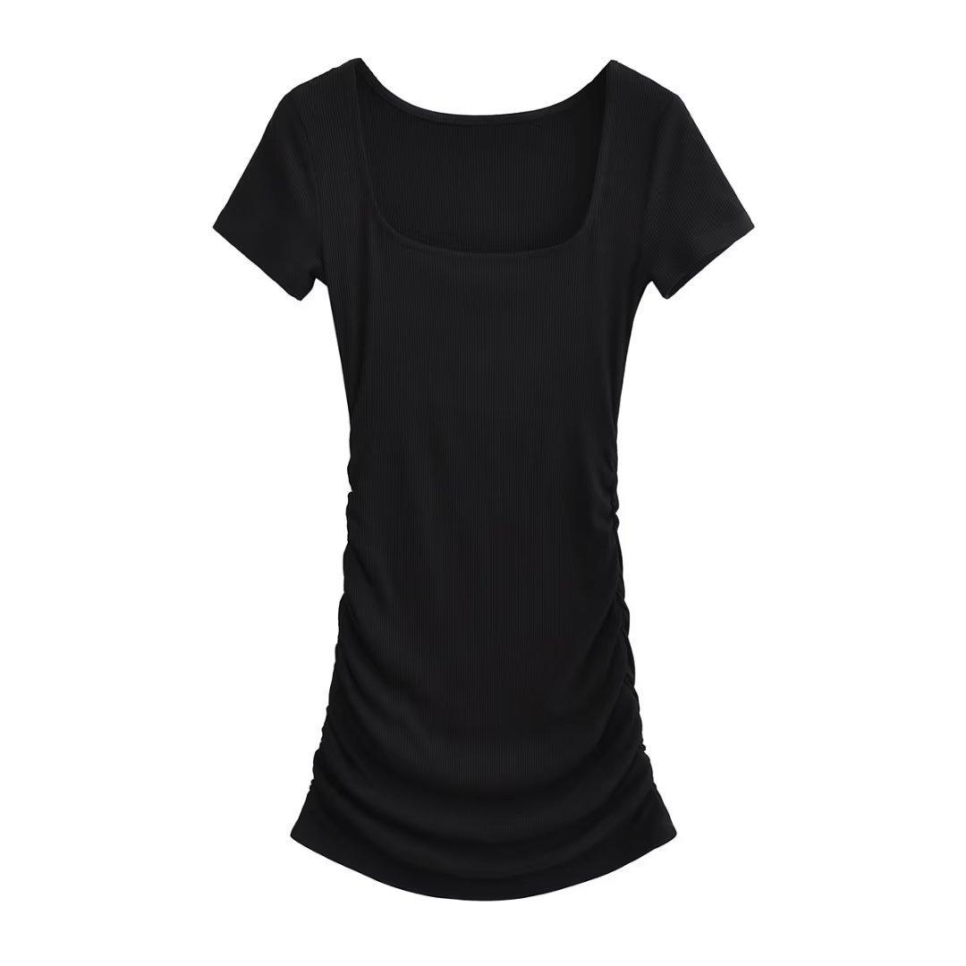 Vestido plisado de manga corta con cuello cuadrado estilo europeo y americano para mujer, verano 2023, nuevo, falda ajustada elástica de color sólido