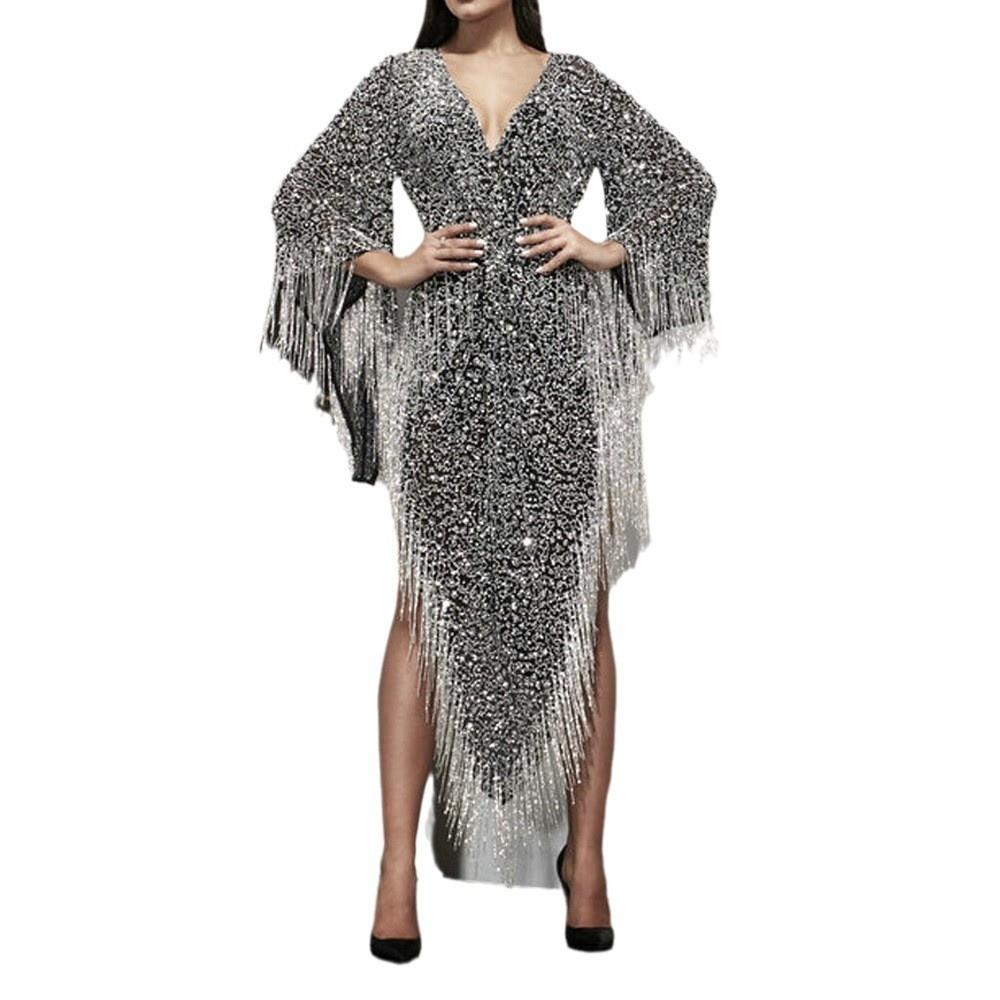 Verano 2025 Ropa Nueva Europea y Americana Vestido Amazon Lentejuelas Manga Larga Irregular Borla Escote en V Profundo Vestido Sexy
