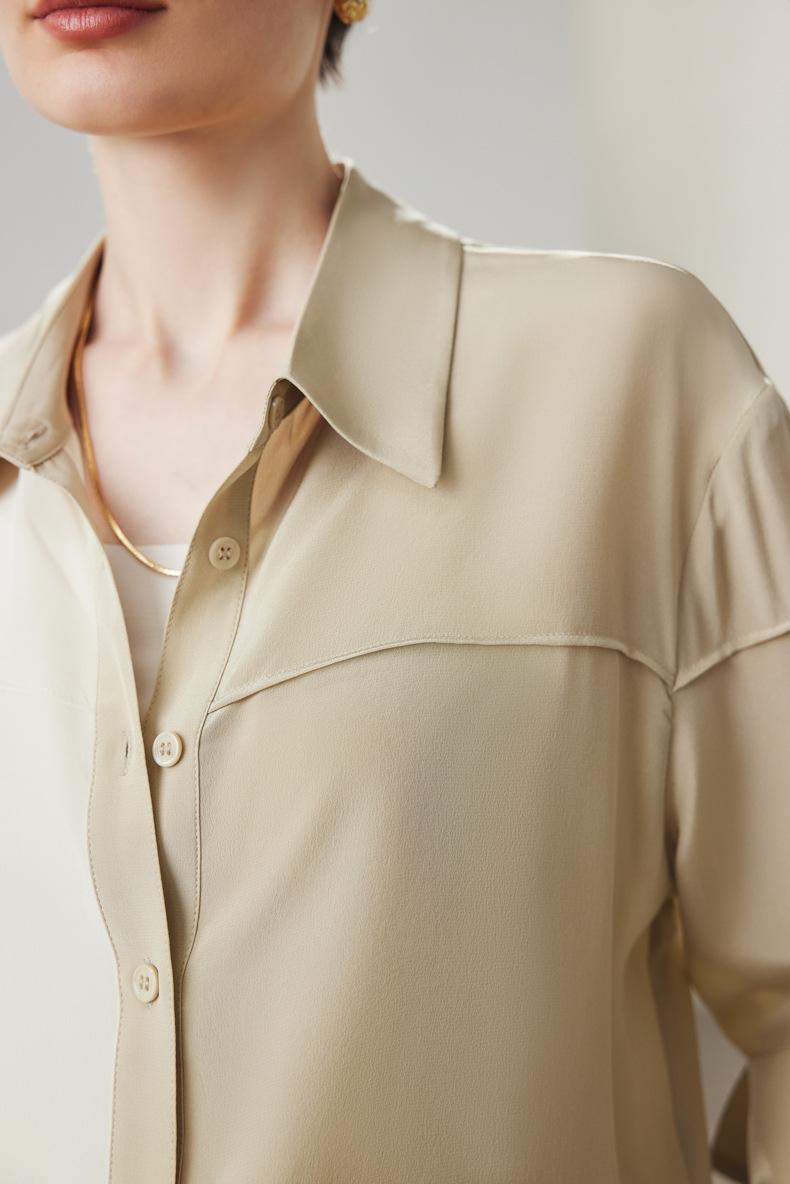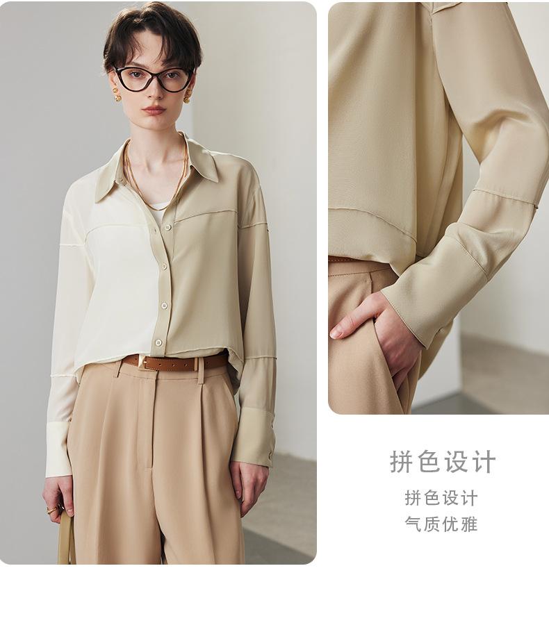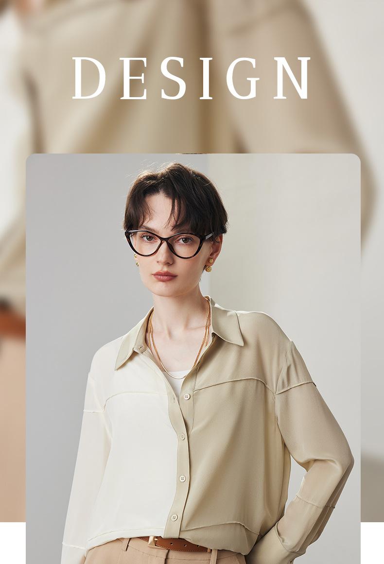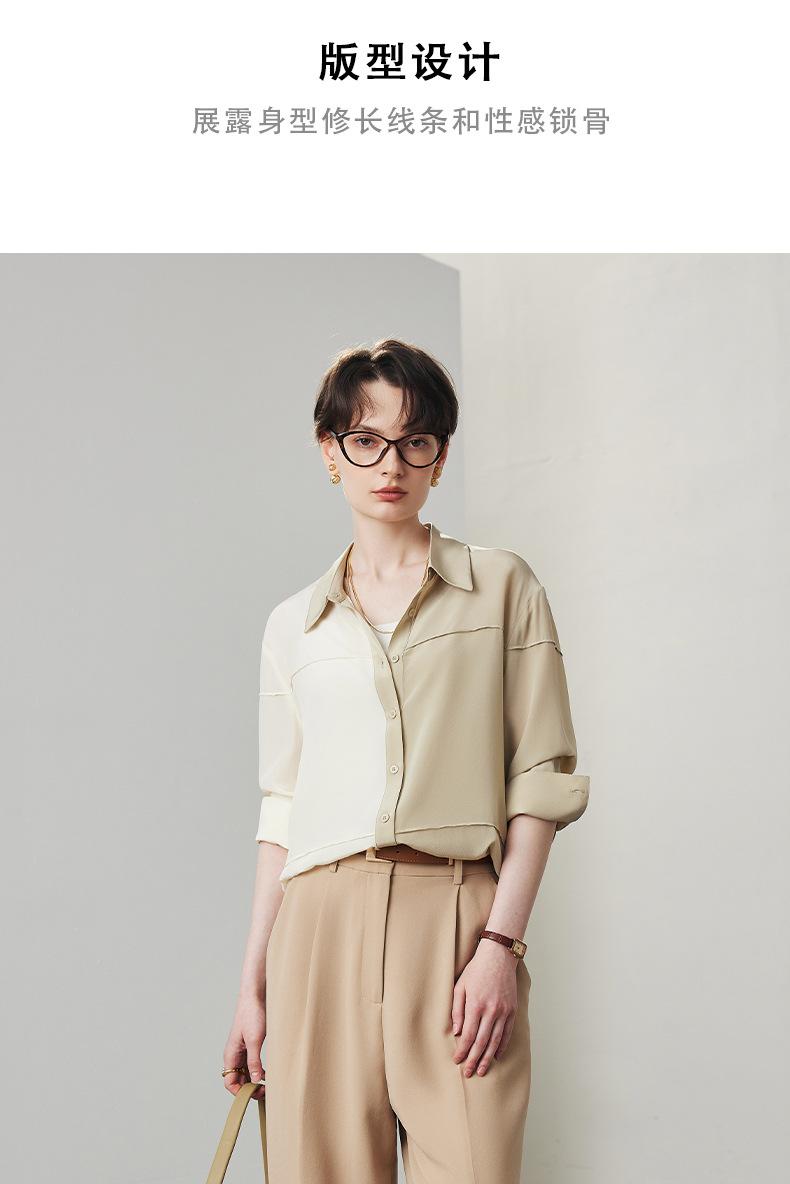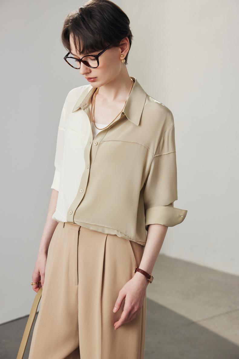Camisa de seda para mujer, primavera y verano 2025, nueva, suelta, con bloques de color distintivos, 100% crepé de China, seda morera.