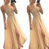 Vestido de Noche Brillante 2025 Verano Europeo y Americano Dorado Cuello V Empalmado Vestido de Fiesta Vestido de Noche para Mujer