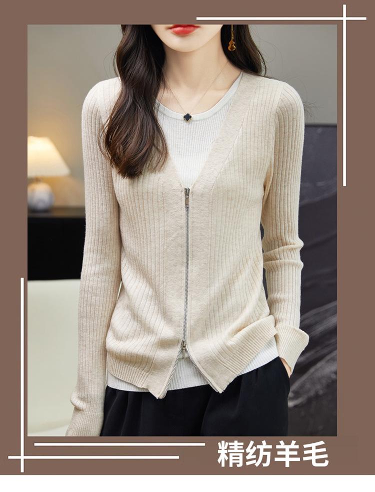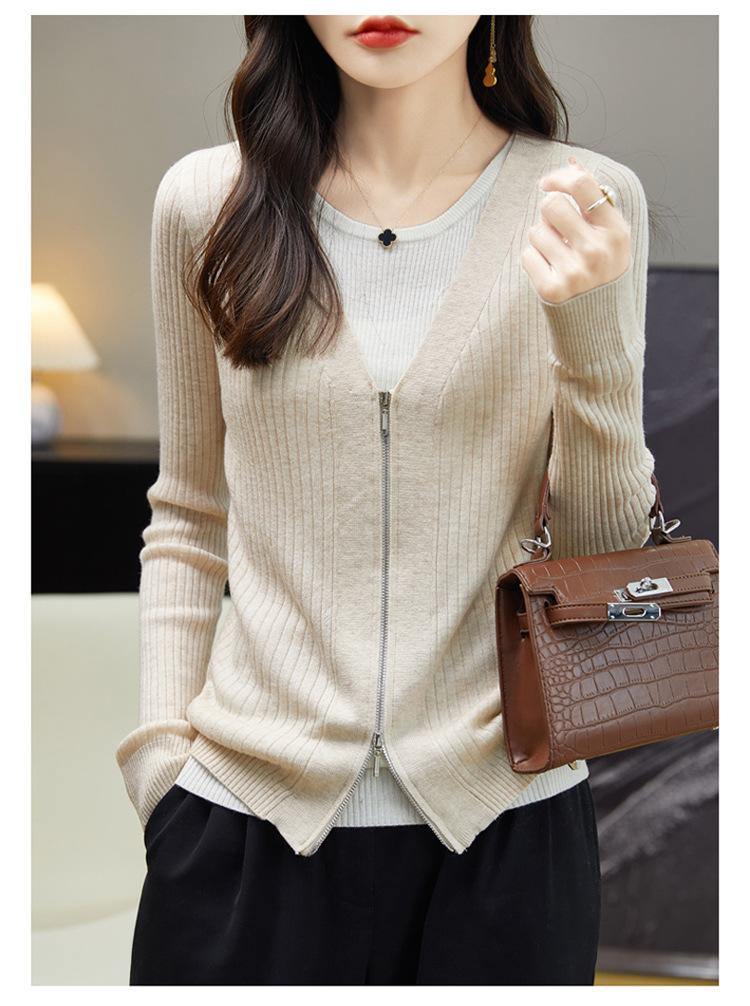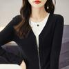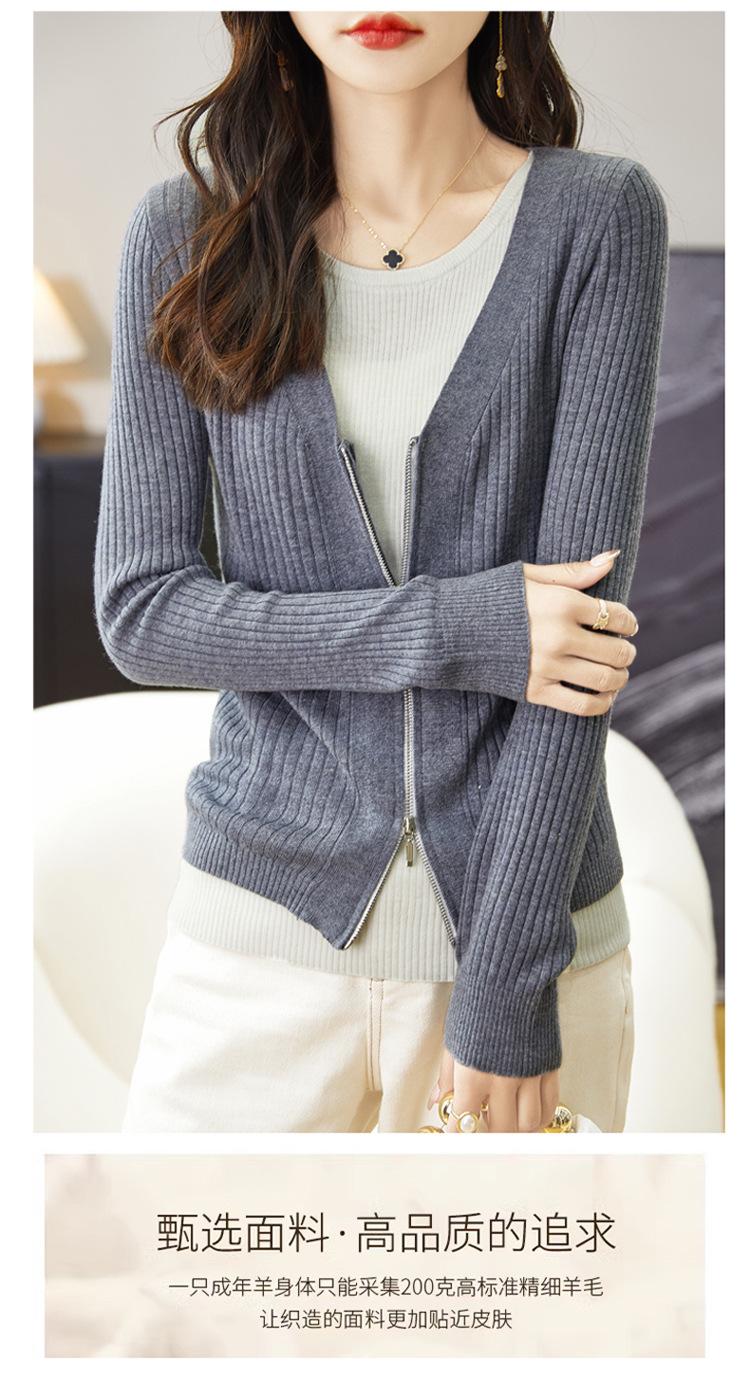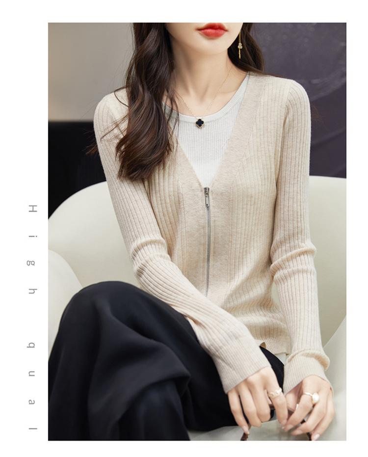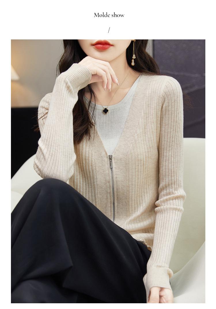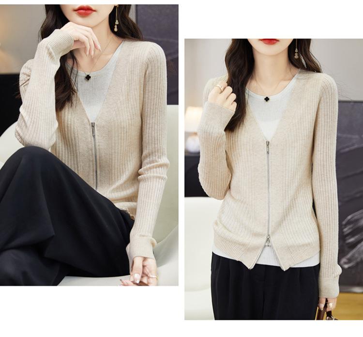 Suéter de lana peinada de primavera para mujer, suéter falso de dos piezas, cárdigan, abrigo, top de manga larga, suéter a juego de colores