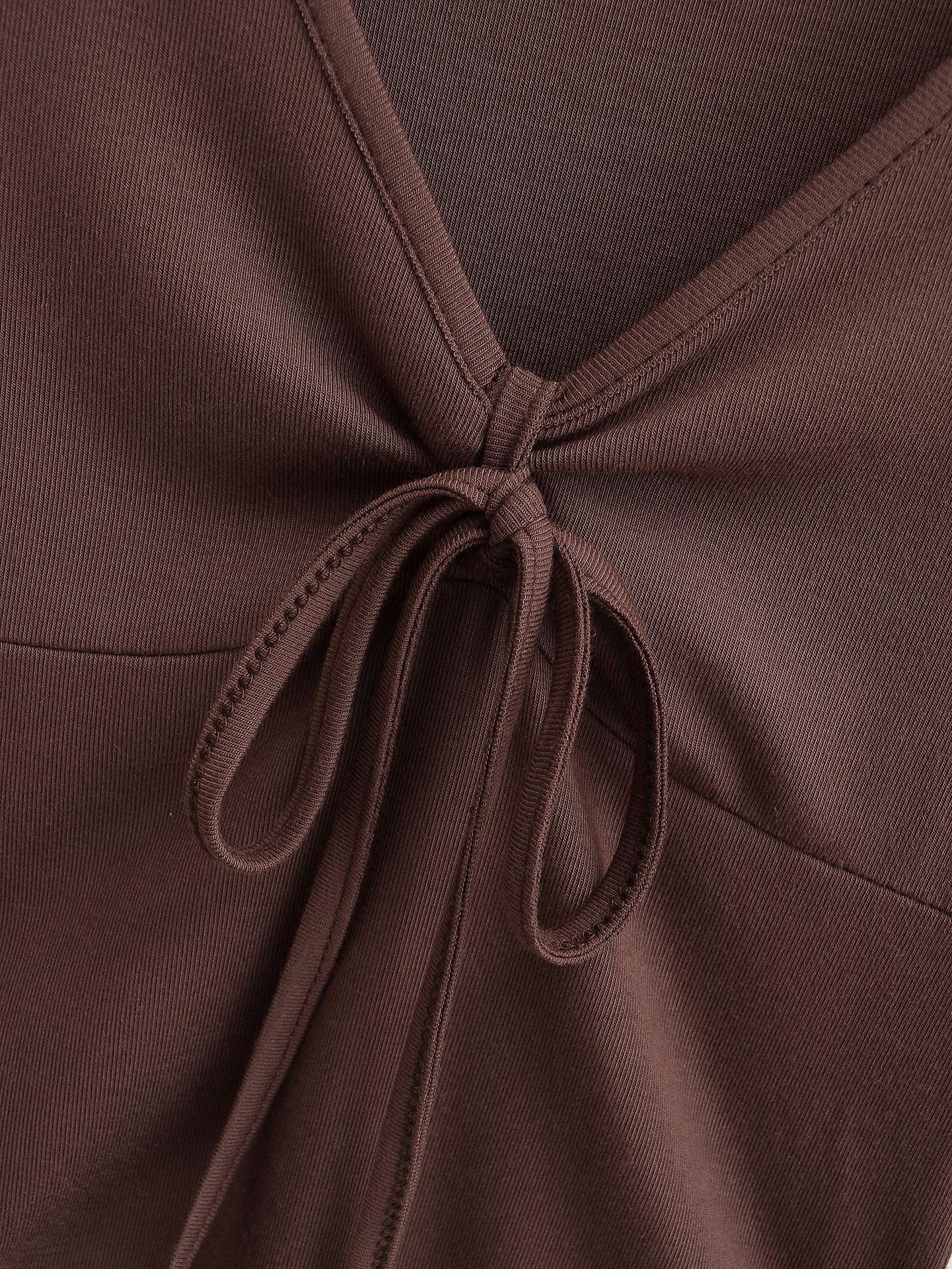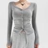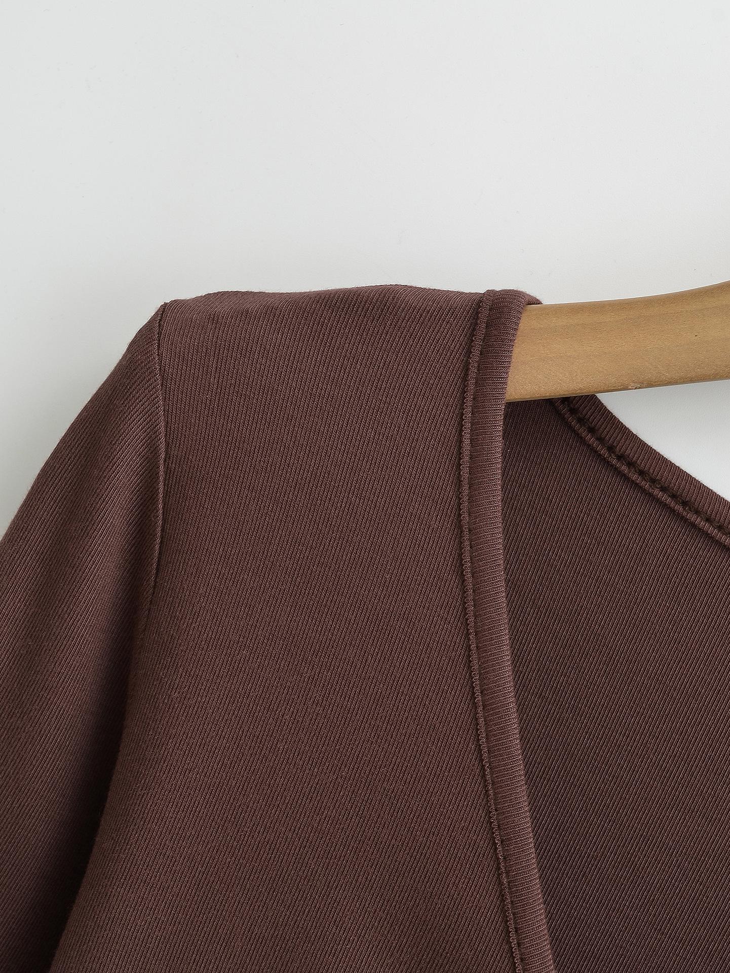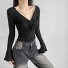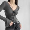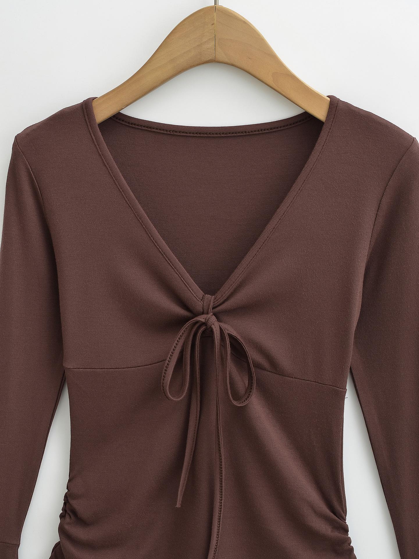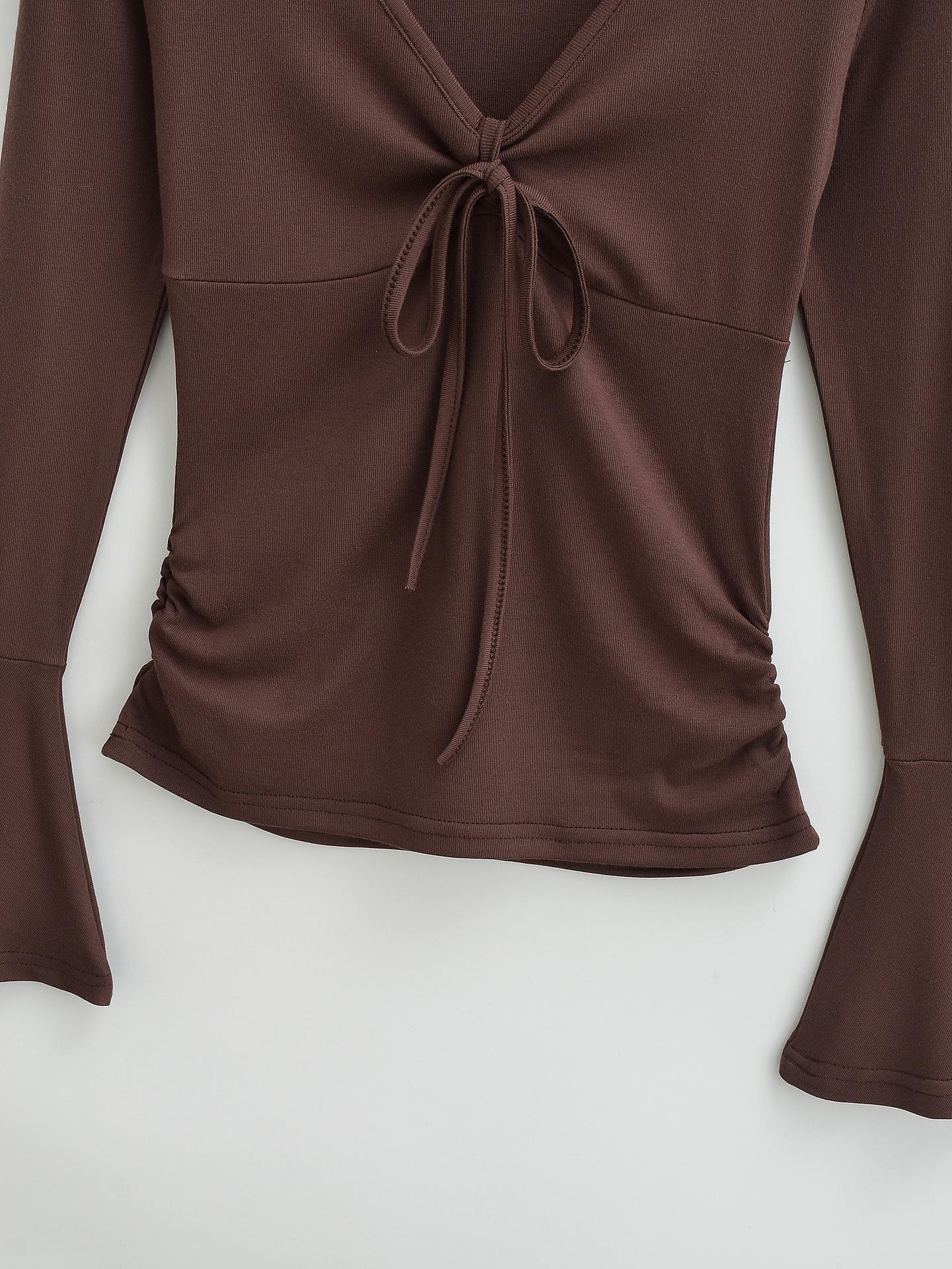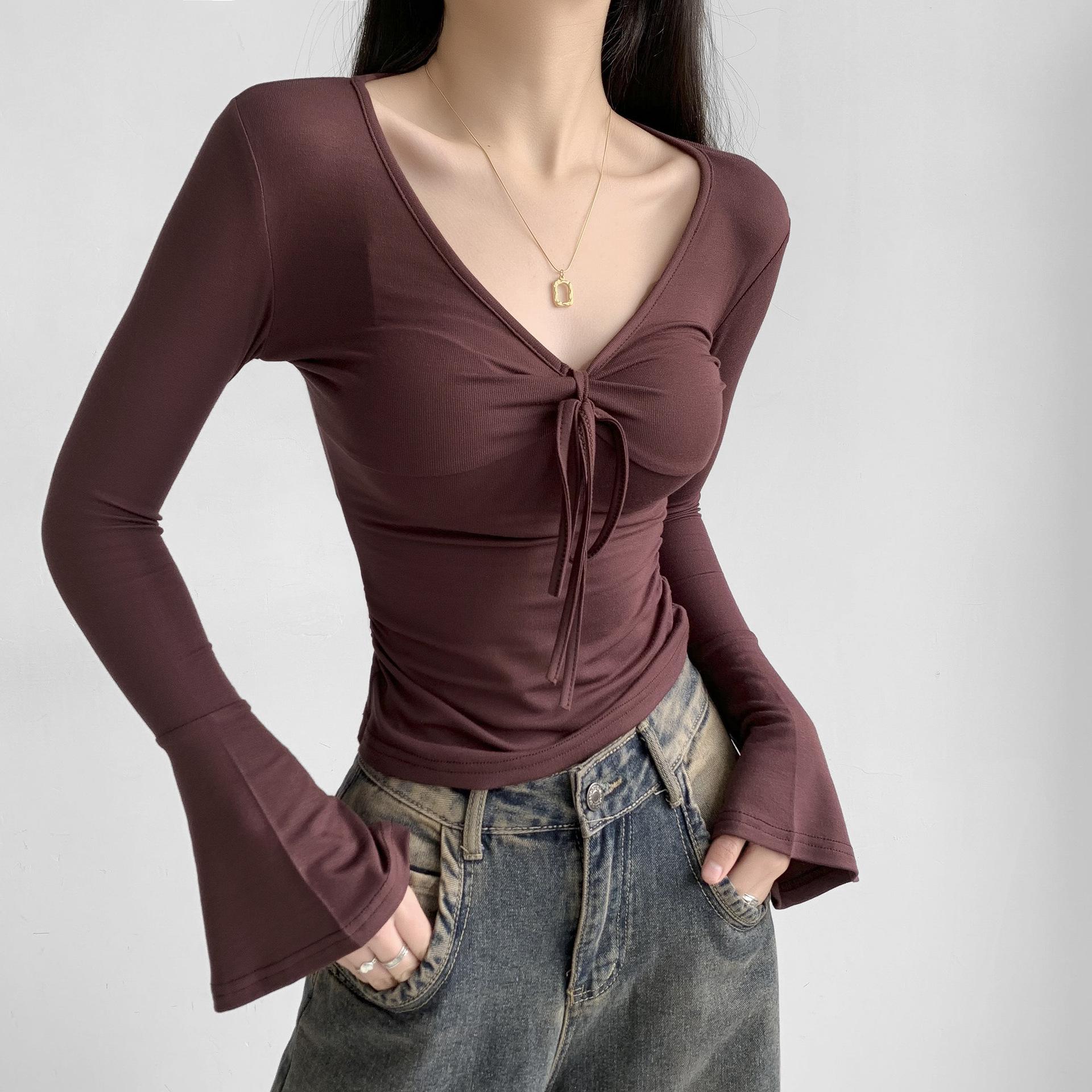 Camiseta de manga larga con cuello en V plisado y cordones de estilo europeo y americano para mujer, primavera 2024, top ajustado con mangas acampanadas y adelgazante