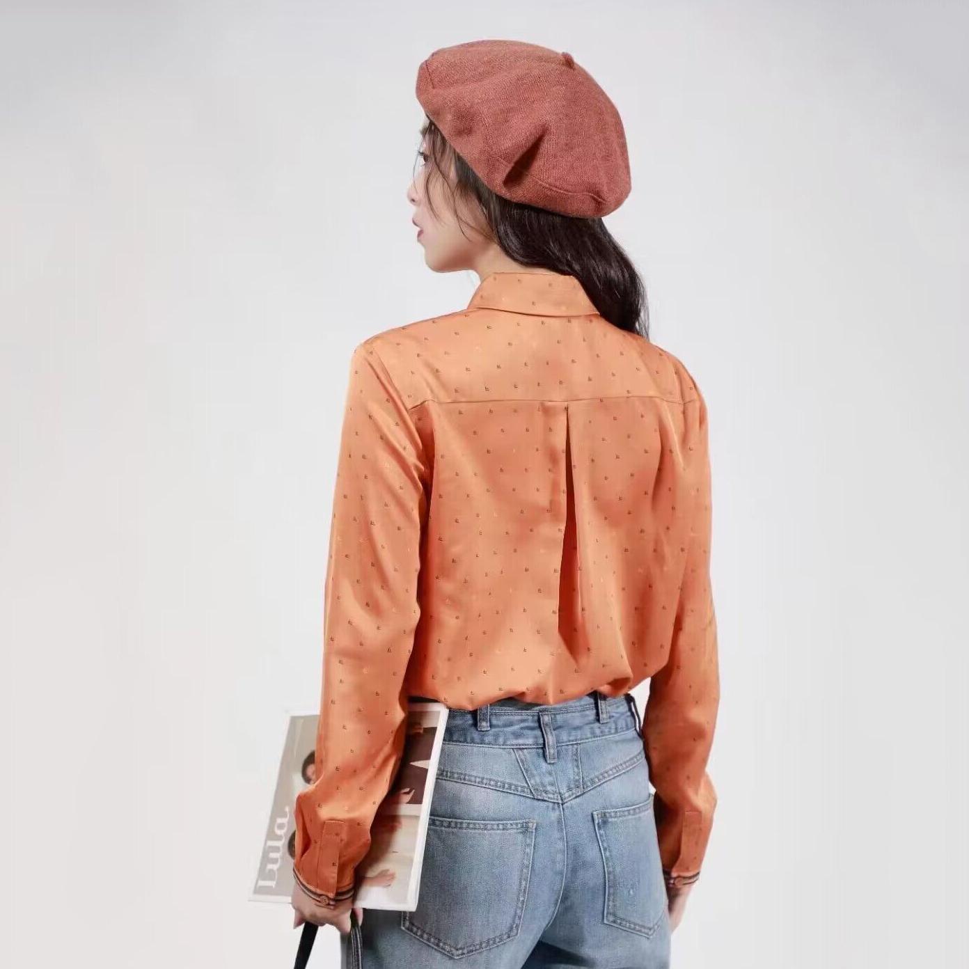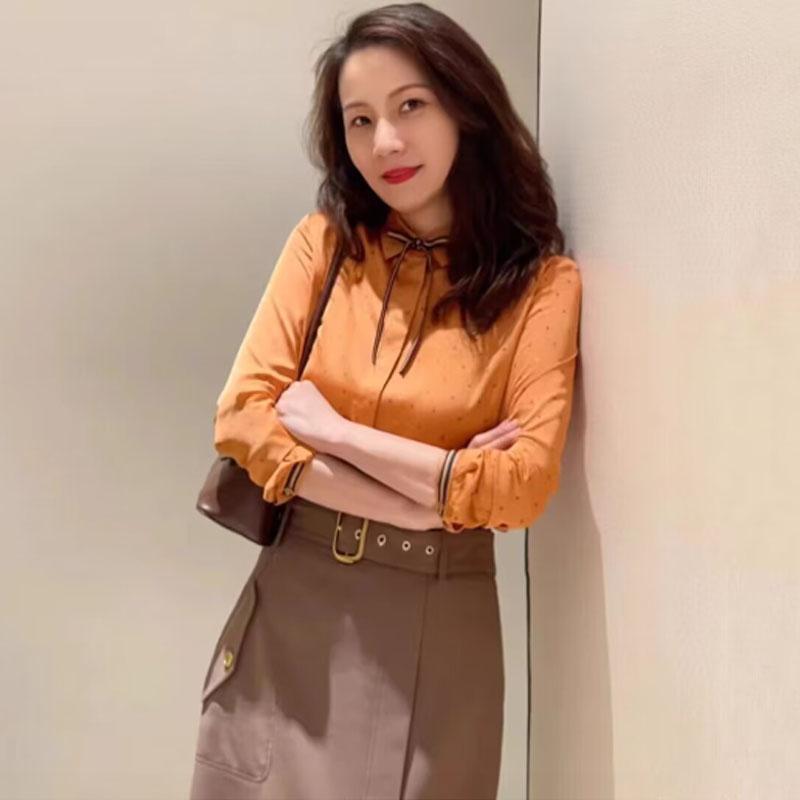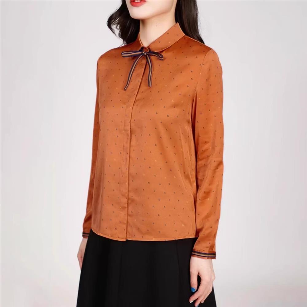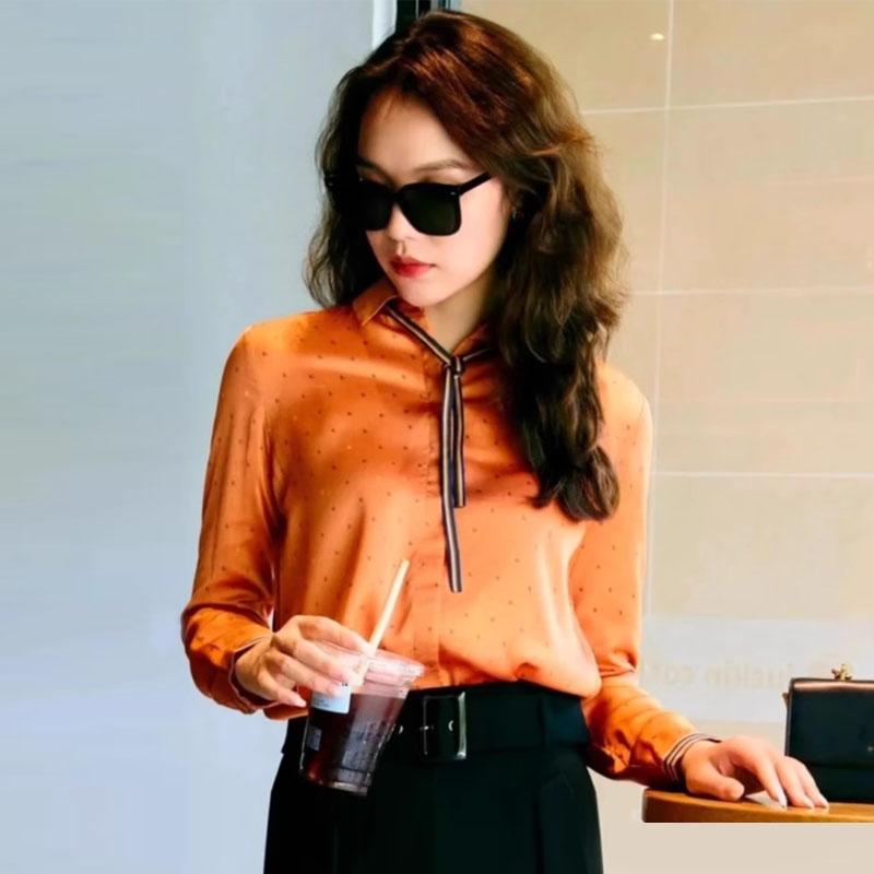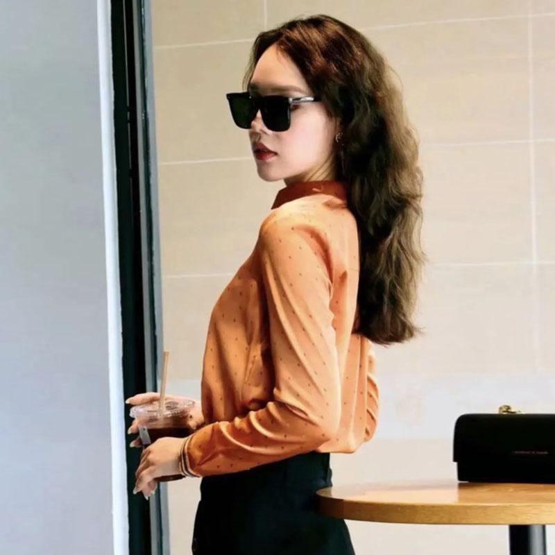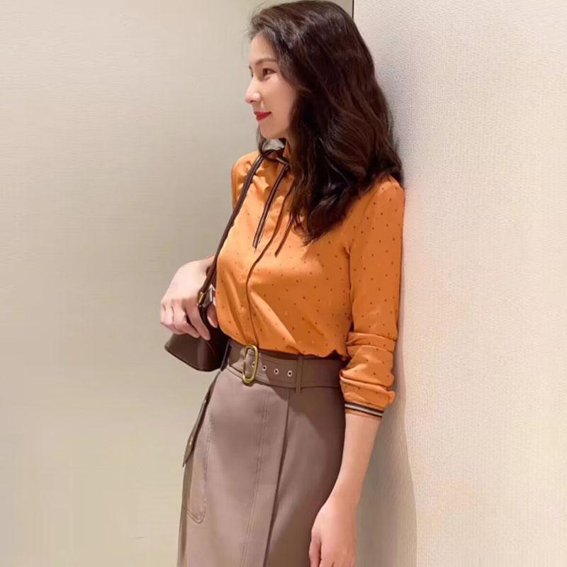 Camisa casual de chifón para mujer con cuello polo, manga larga con cordones y estampado de lunares, otoño 2024