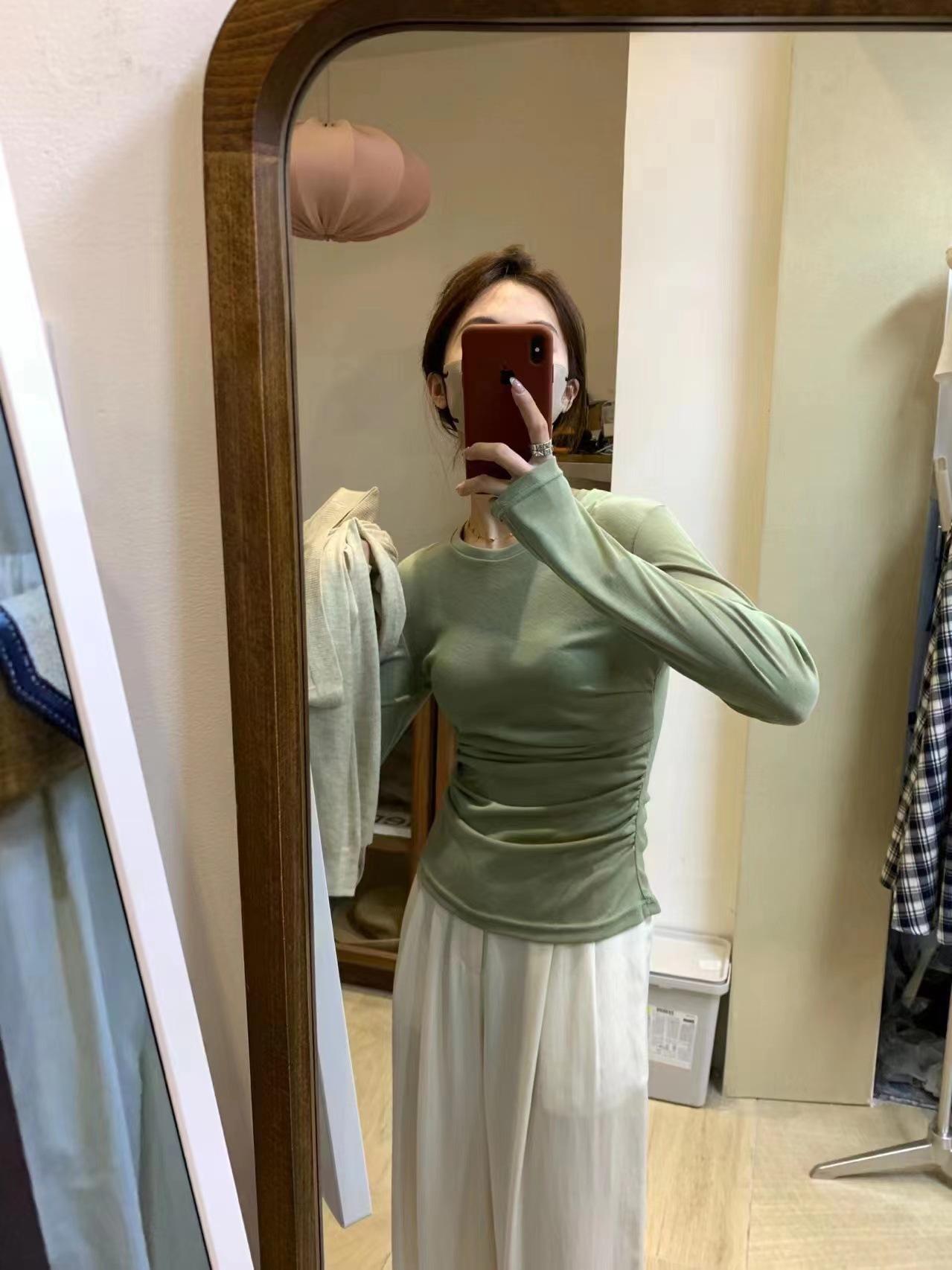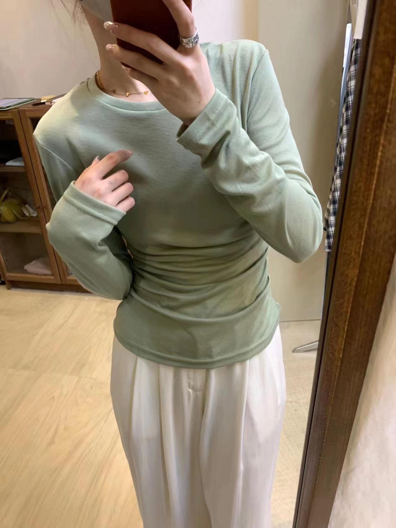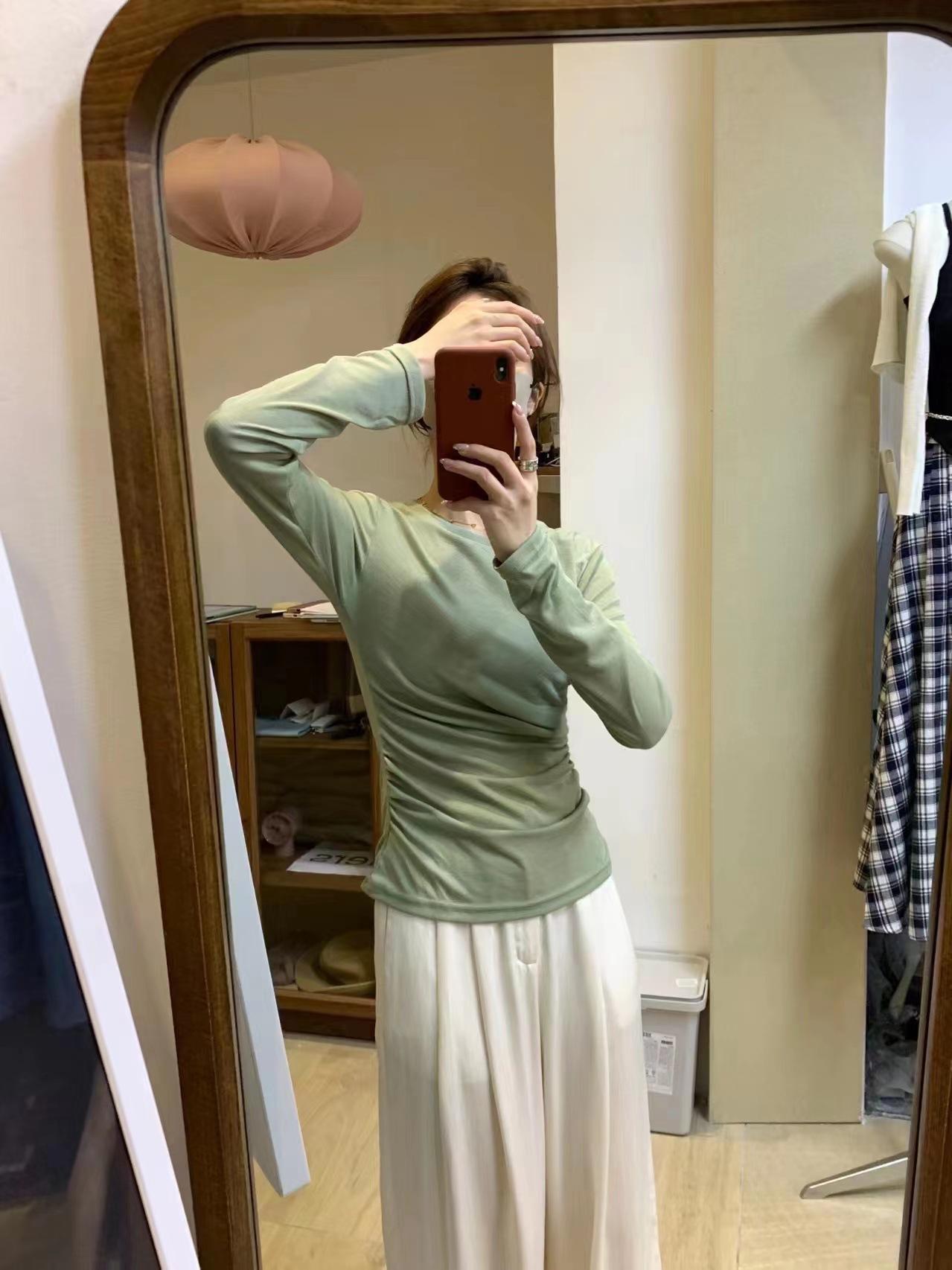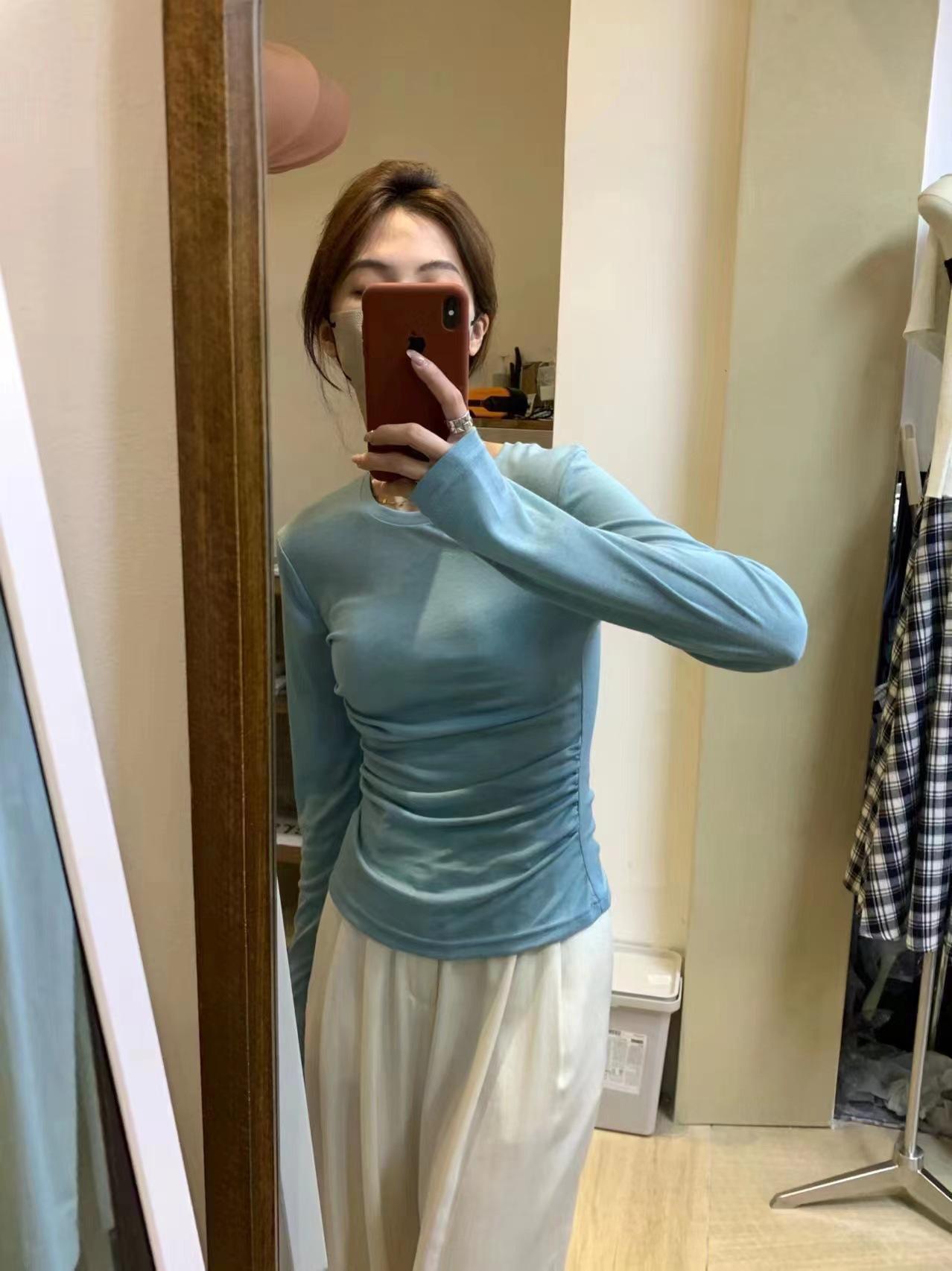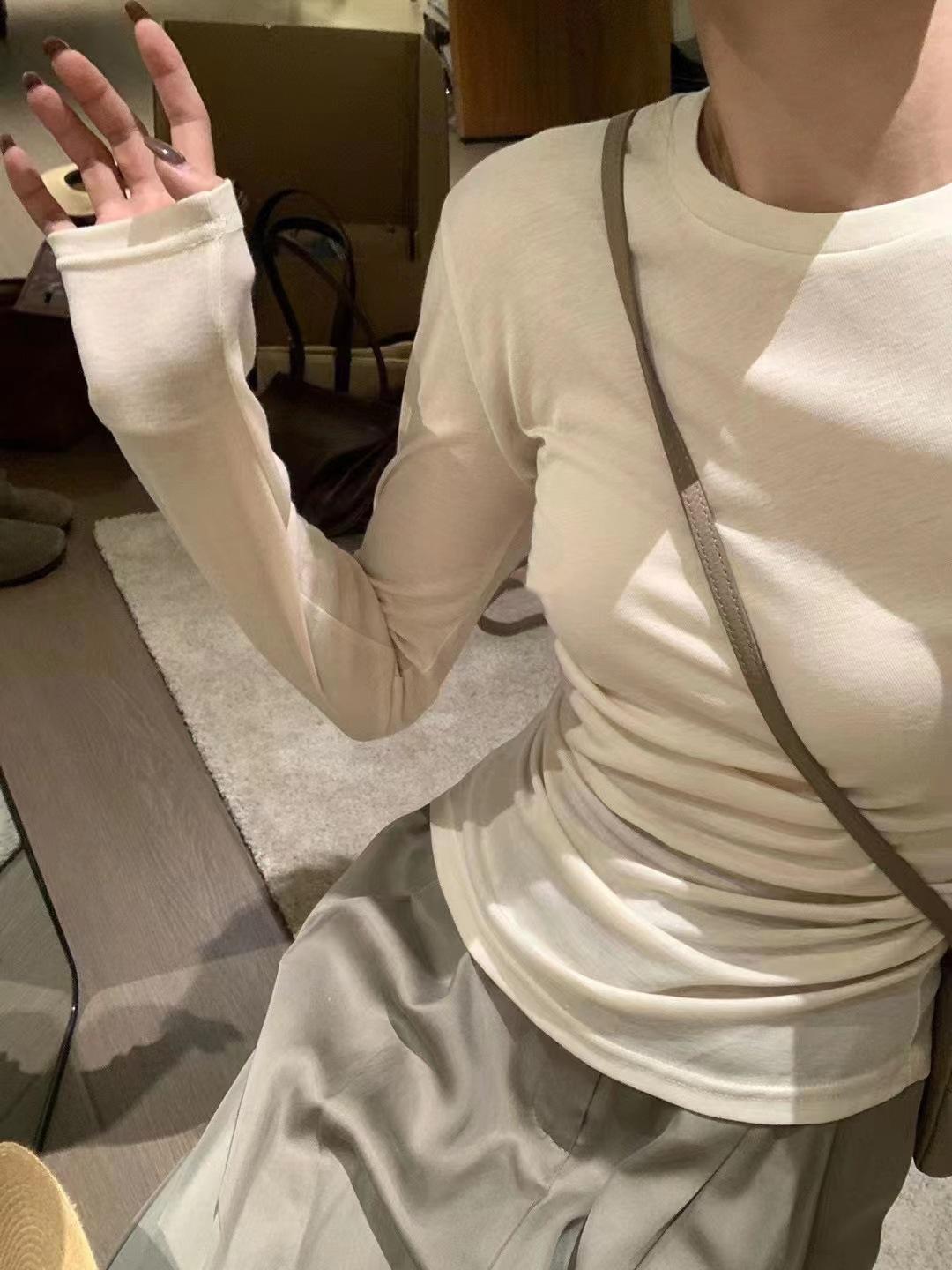 Camisa plisada de protección solar para principios de otoño de 2023, camiseta de manga larga de un solo uso con cuello redondo sencillo y ajustada para mujer