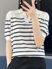 Camiseta de Lana Peinada de Manga Corta con Rayas en el Cuello Polo 2025 Verano Nuevo Estilo Estilo Gentil para Mujer Aspecto Adelgazante Holgado de Manga Corta