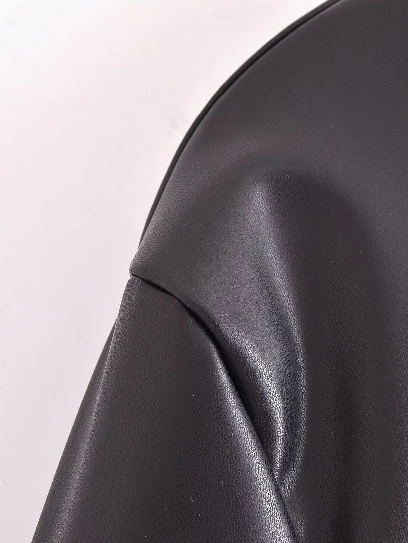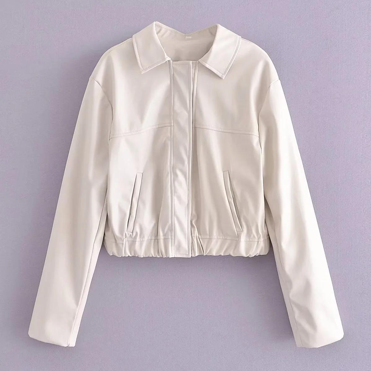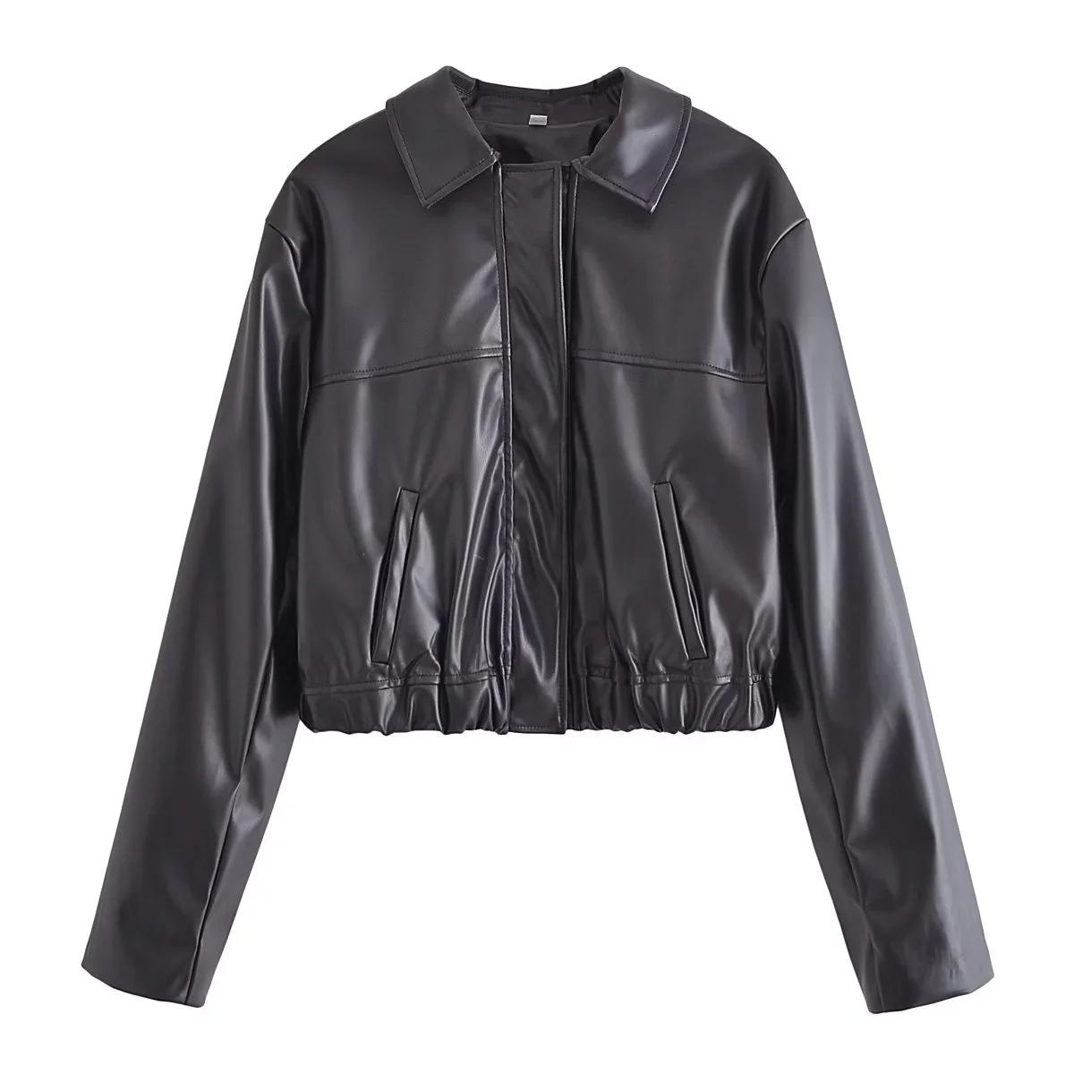 Ropa de mujer de estilo europeo y americano, solapa de moda francesa, hebilla oculta, dobladillo elástico, chaqueta de cuero sintético de primer plano, abrigo corto que combina con todo, moda
