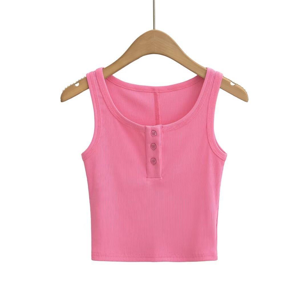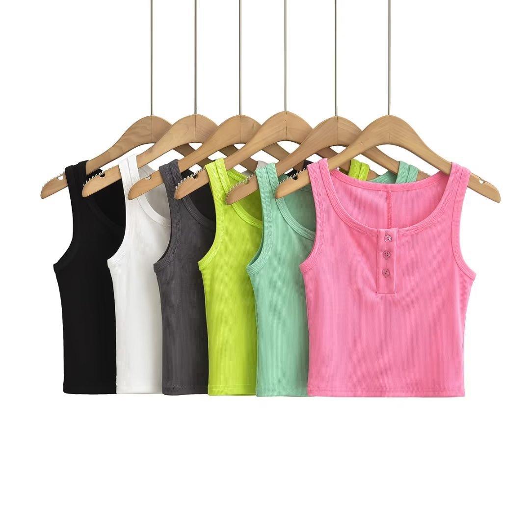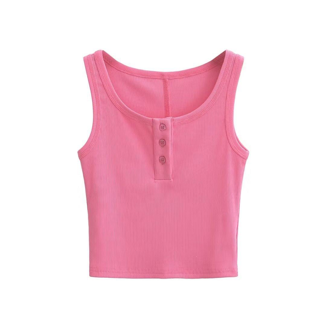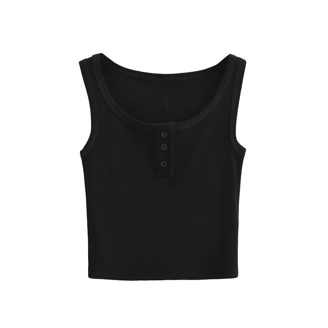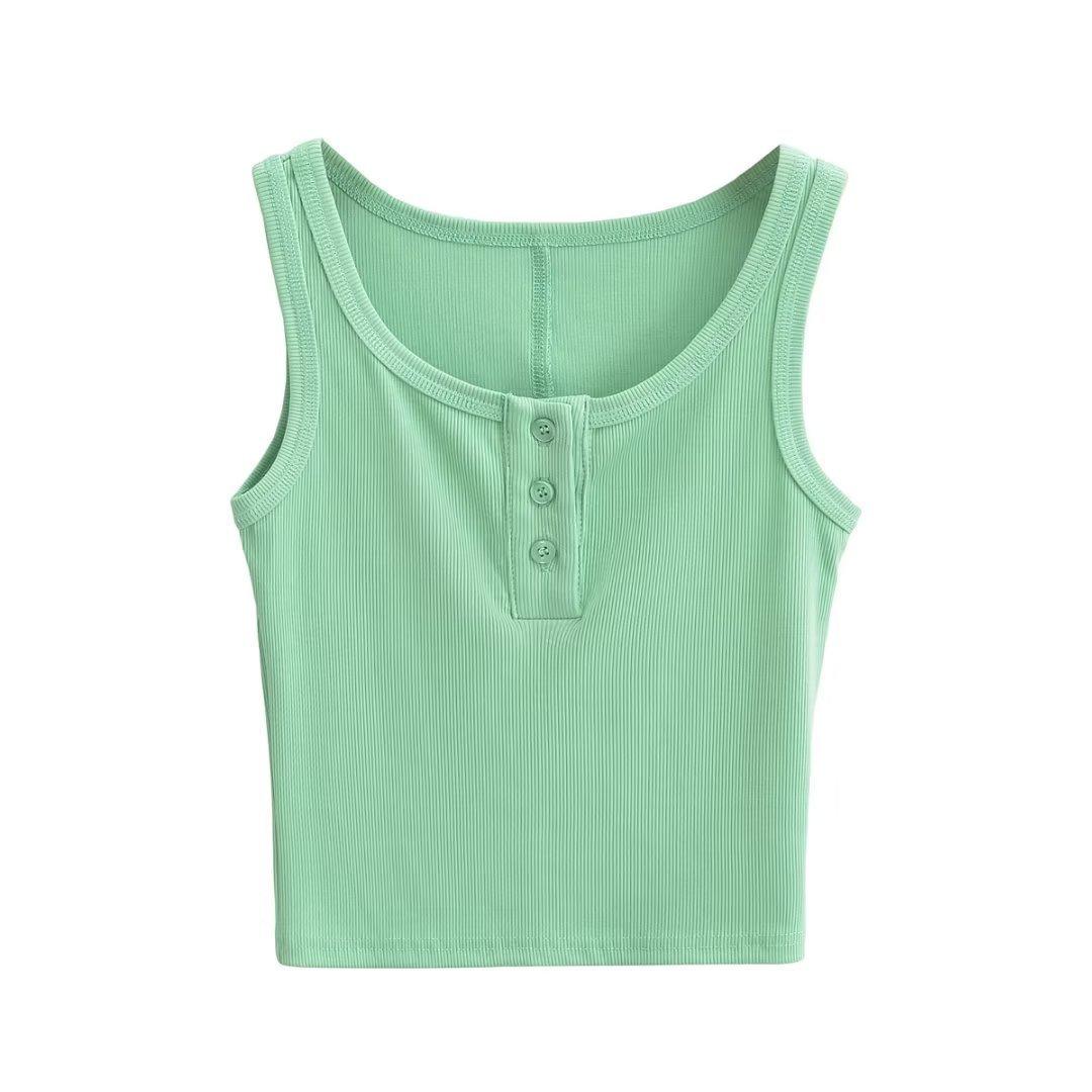 Camisola con botones estilo europeo y americano para mujer, novedad de verano 2023, color liso, sin mangas, corta.