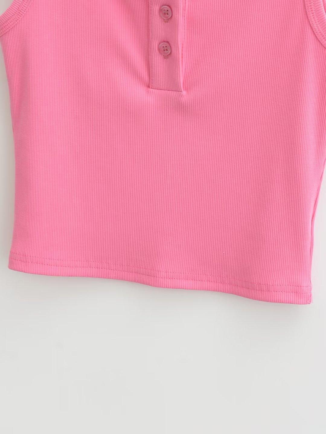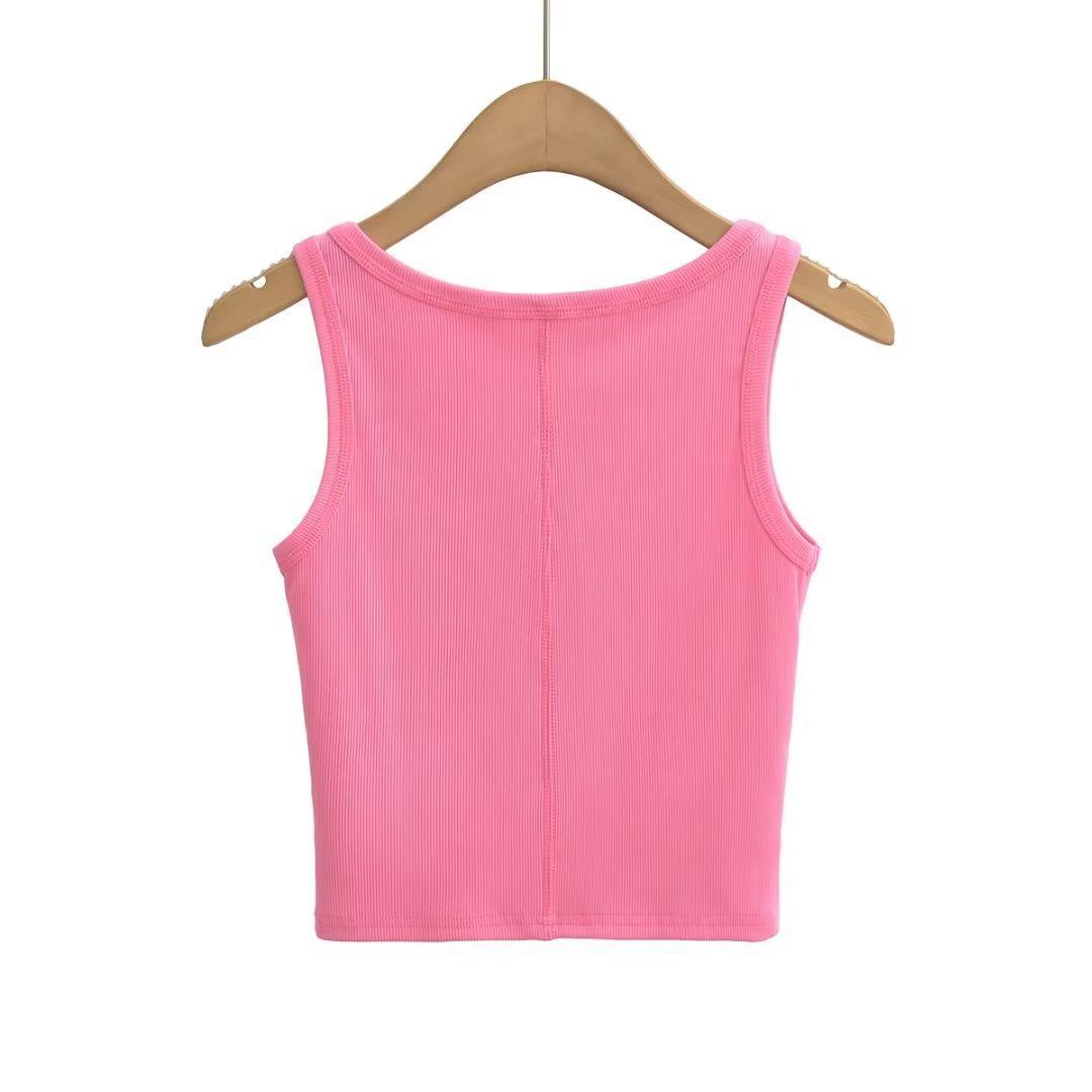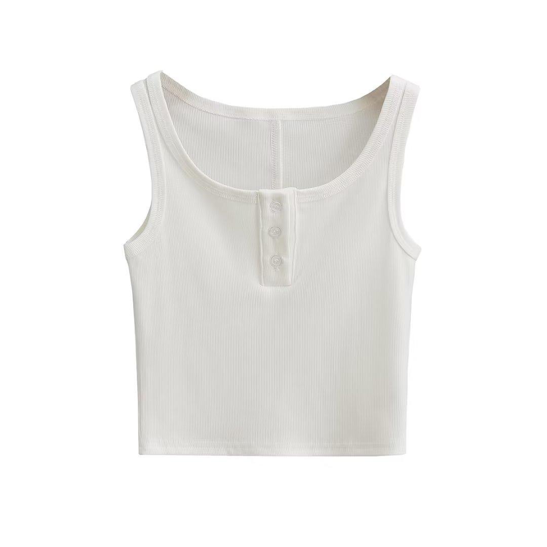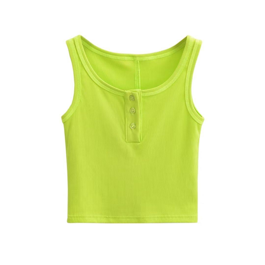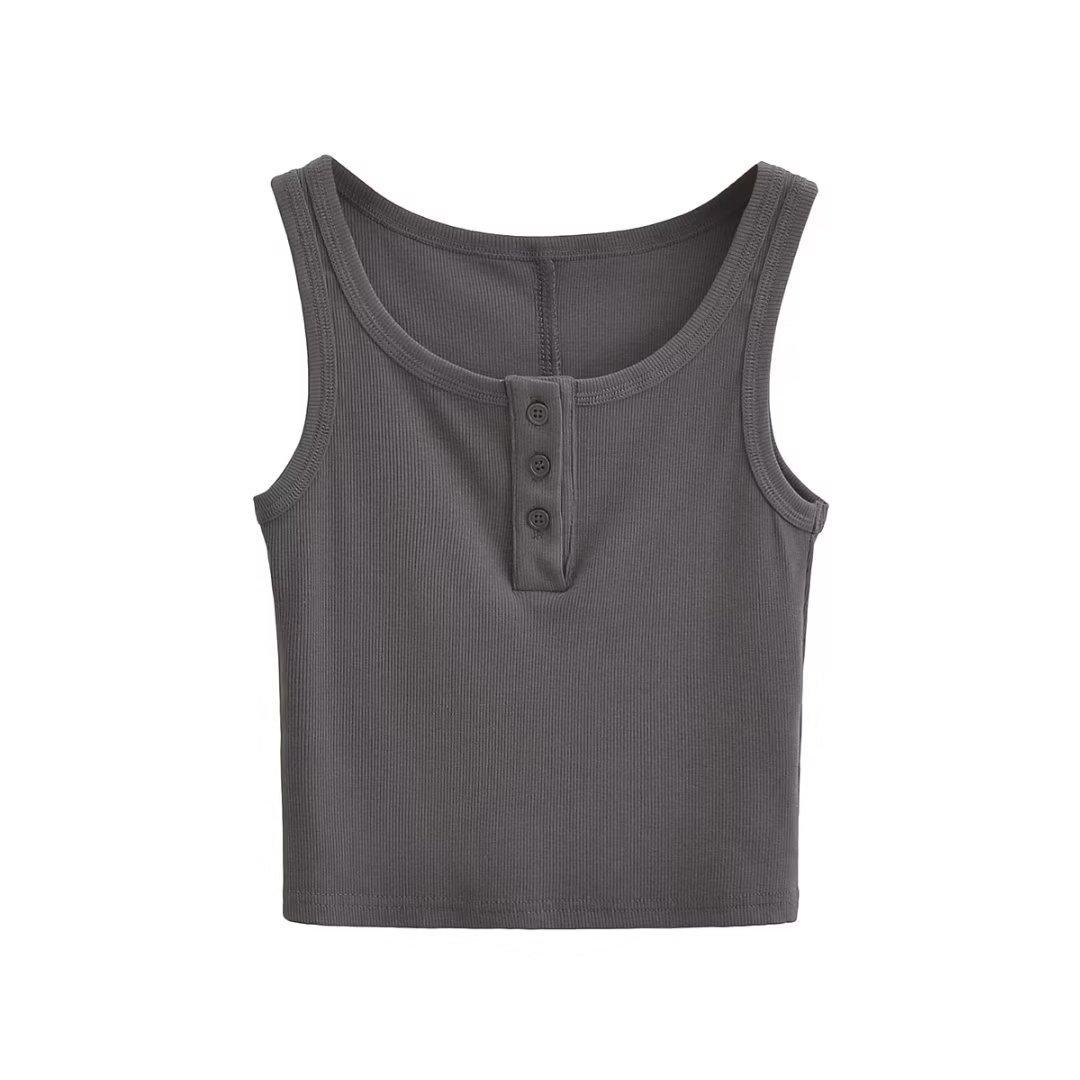 Camisola con botones estilo europeo y americano para mujer, novedad de verano 2023, color liso, sin mangas, corta.