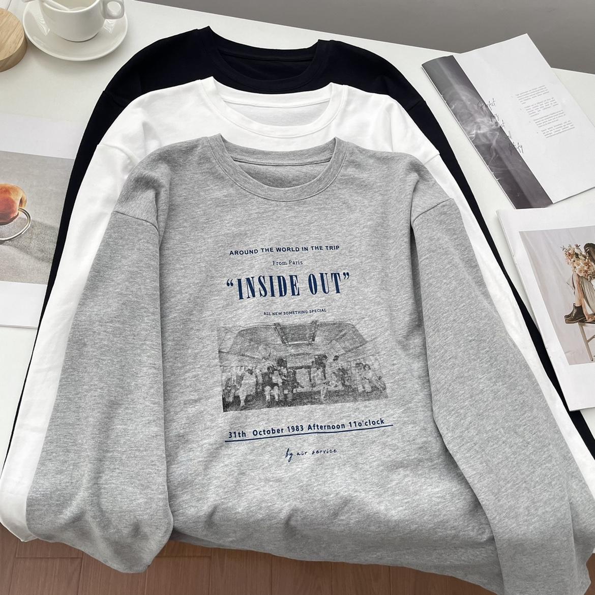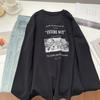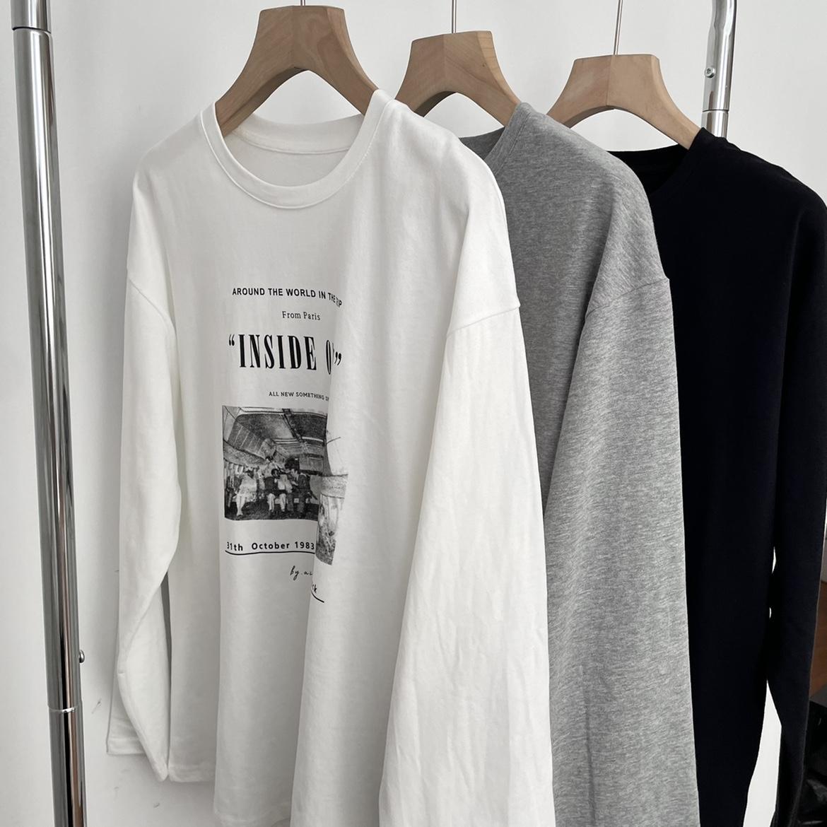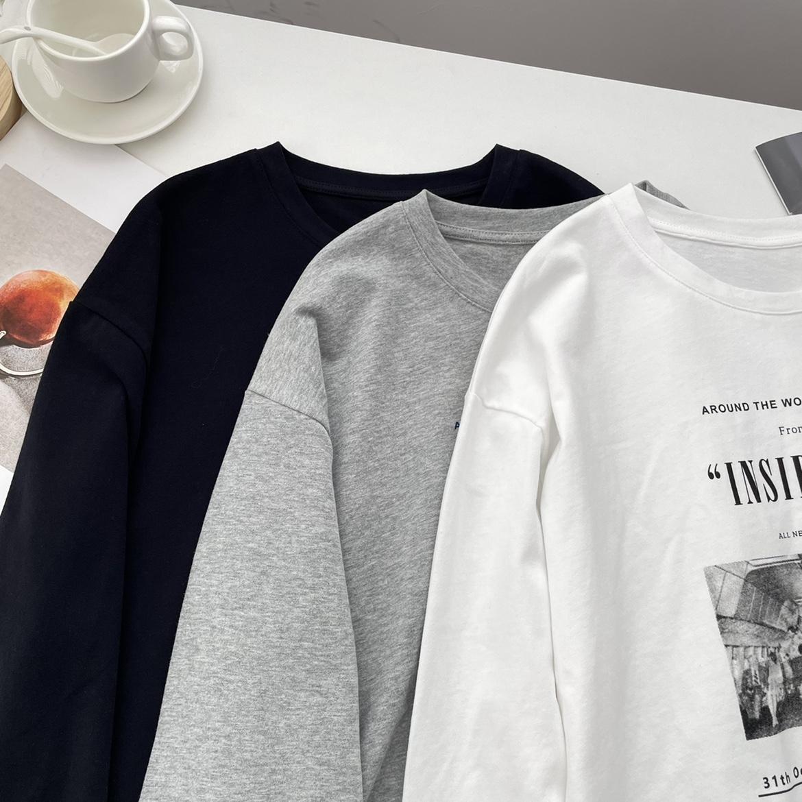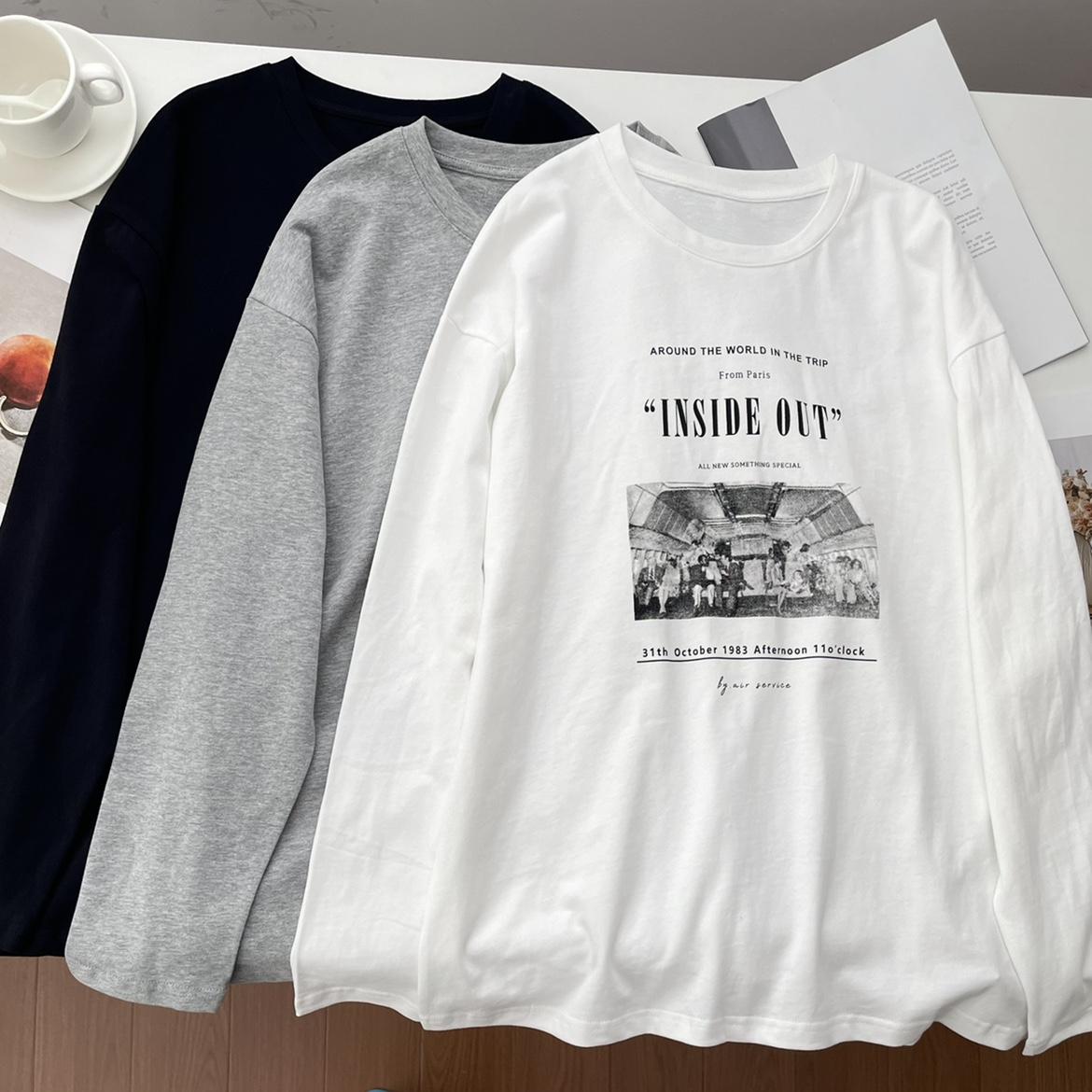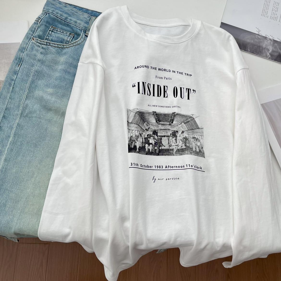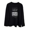 Camiseta de manga larga con estampado artístico, informal, holgada, retro americana, de principios de otoño, versátil, elegante, con cuello redondo y letras en la parte inferior