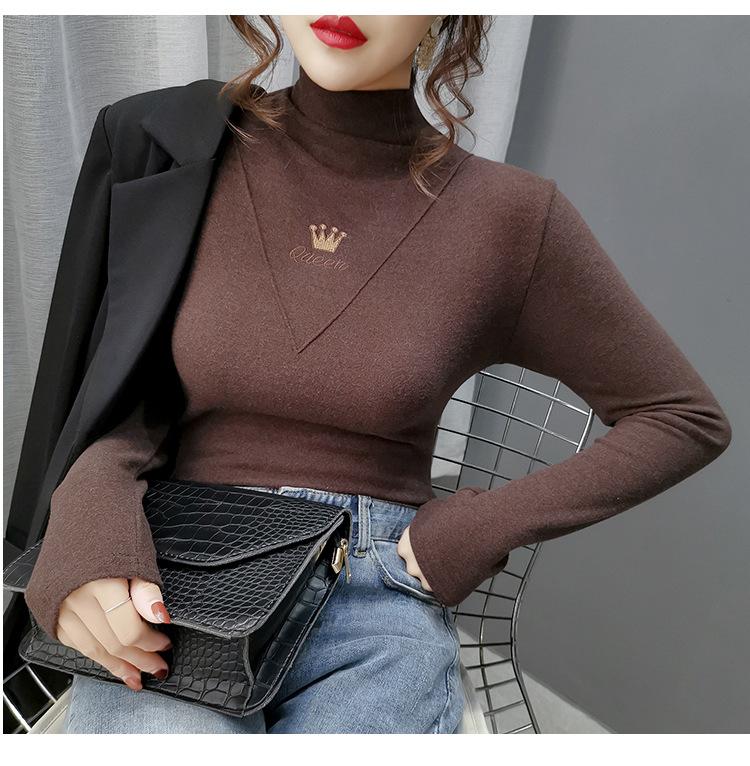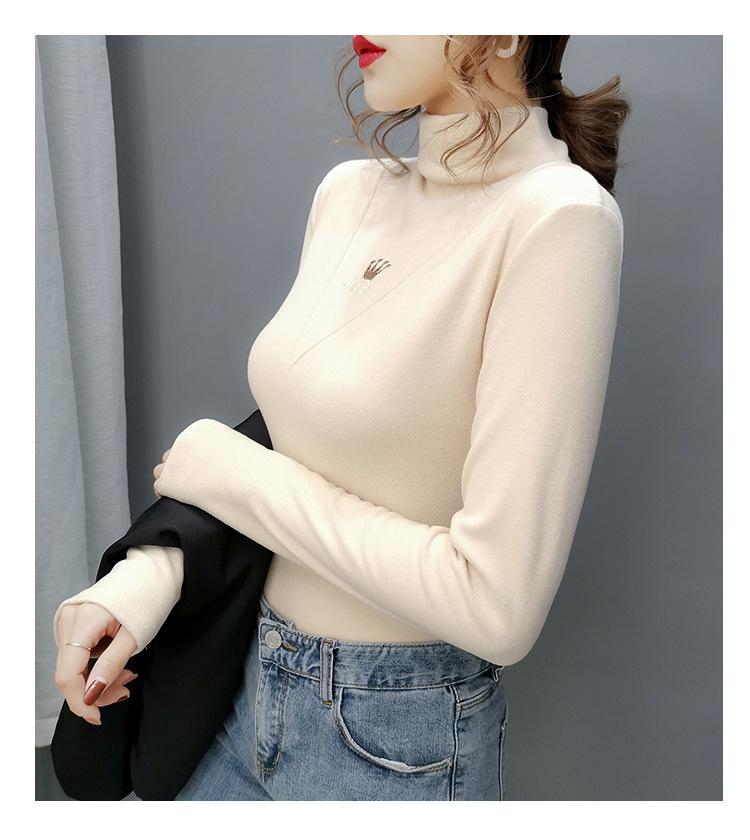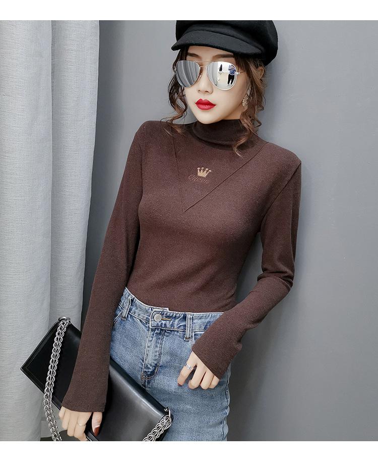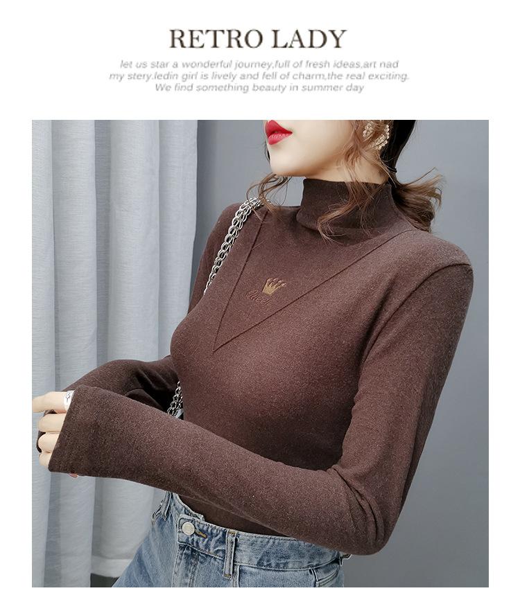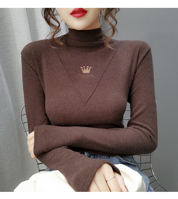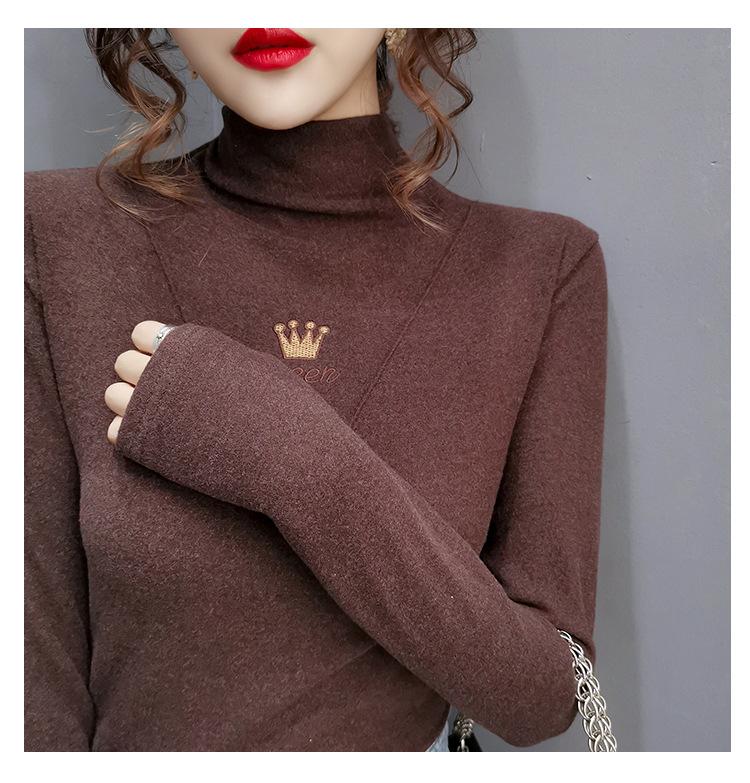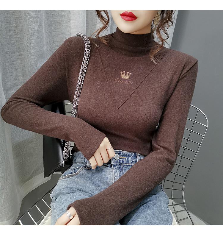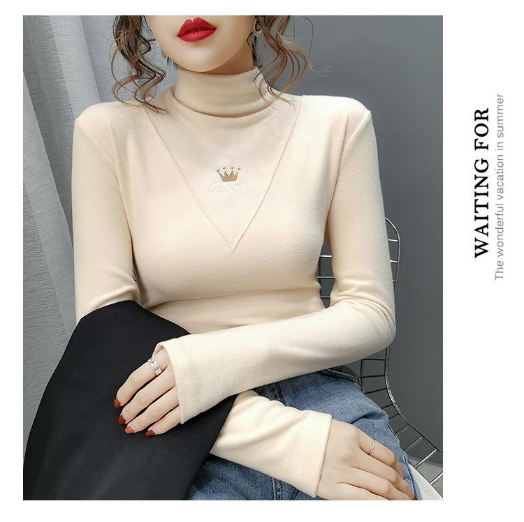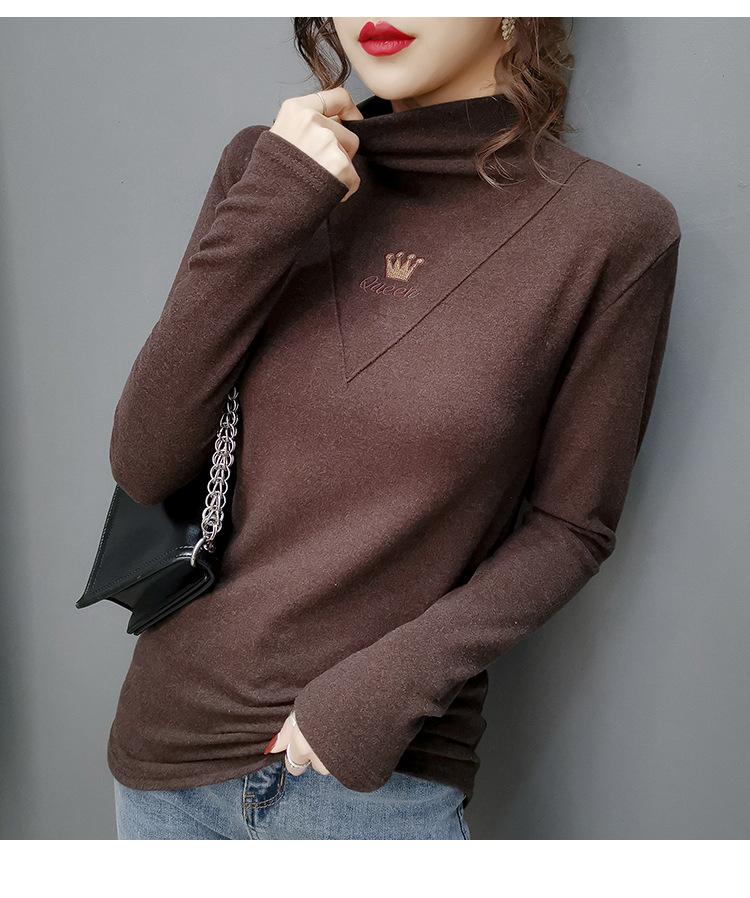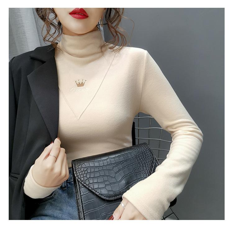 2022 Nuevo Cuello Alto de Manga Larga Bordado Camiseta Base de Felpa de Doble Cara para Mujer, Adecuada para la Moda de Otoño, Invierno y Primavera
