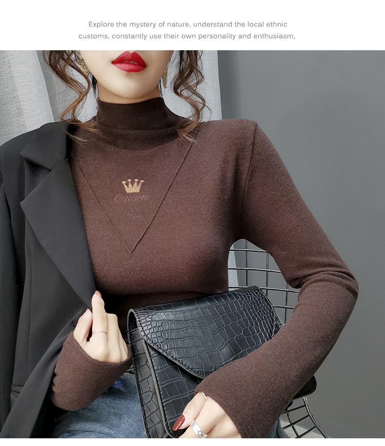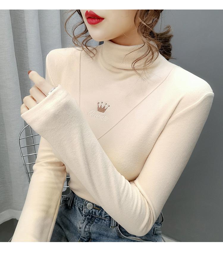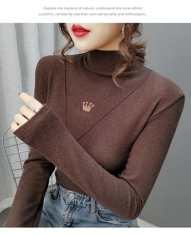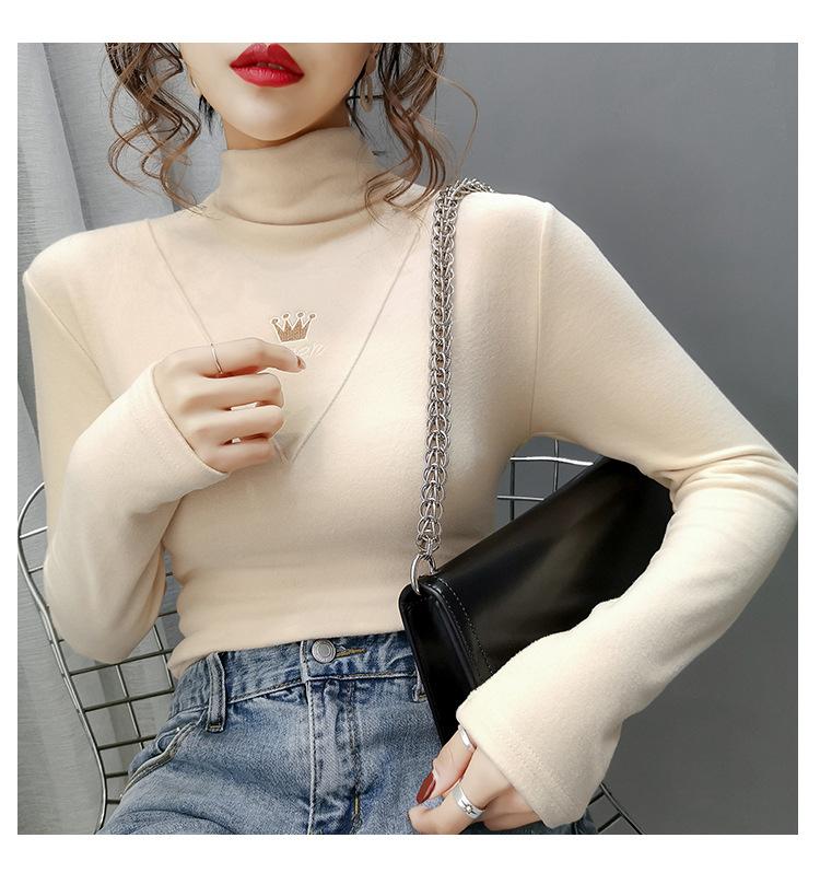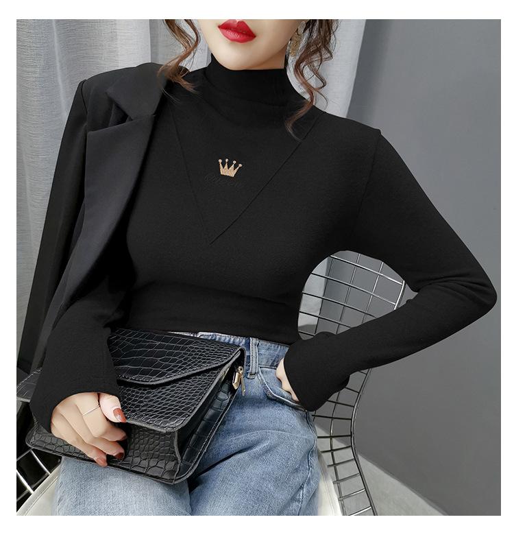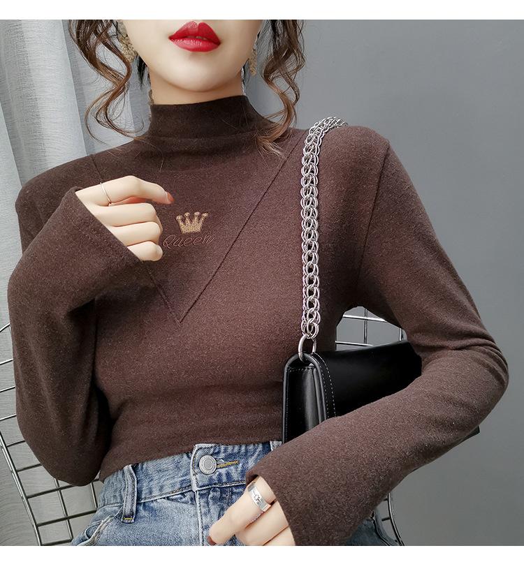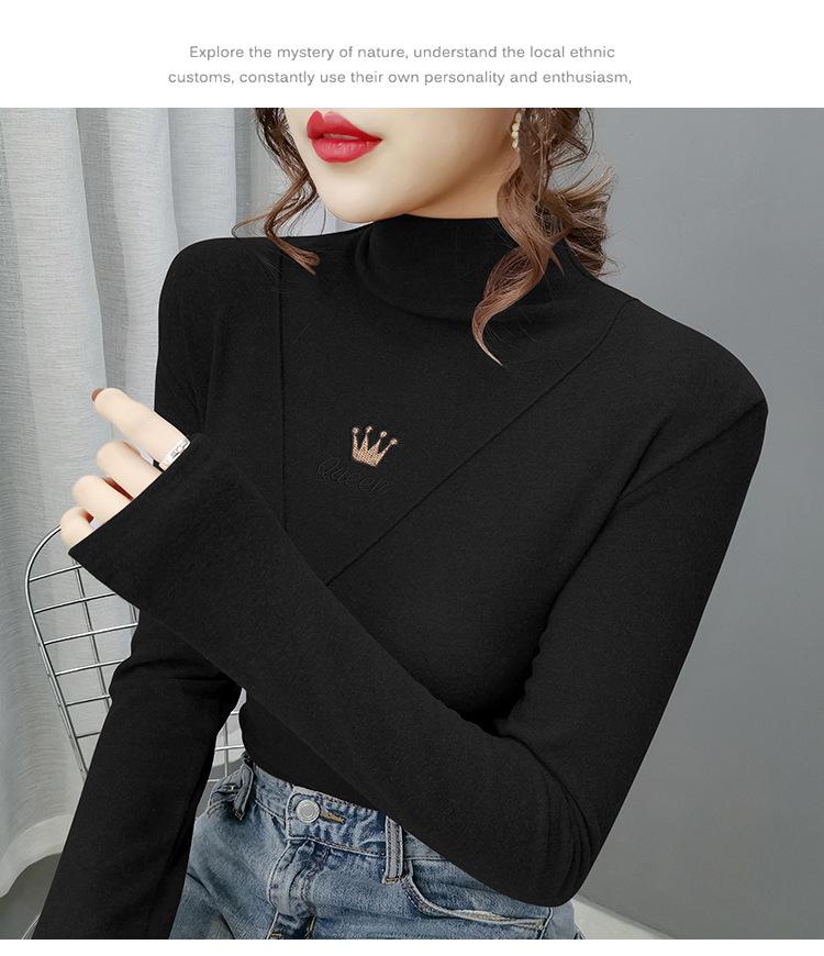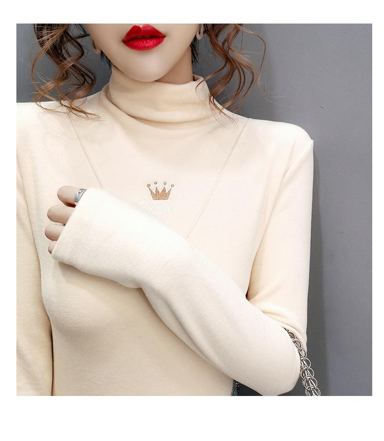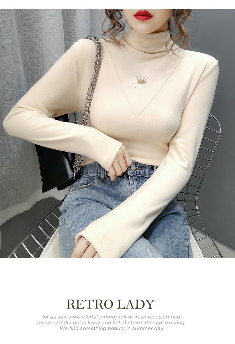 2022 Nuevo Cuello Alto de Manga Larga Bordado Camiseta Base de Felpa de Doble Cara para Mujer, Adecuada para la Moda de Otoño, Invierno y Primavera