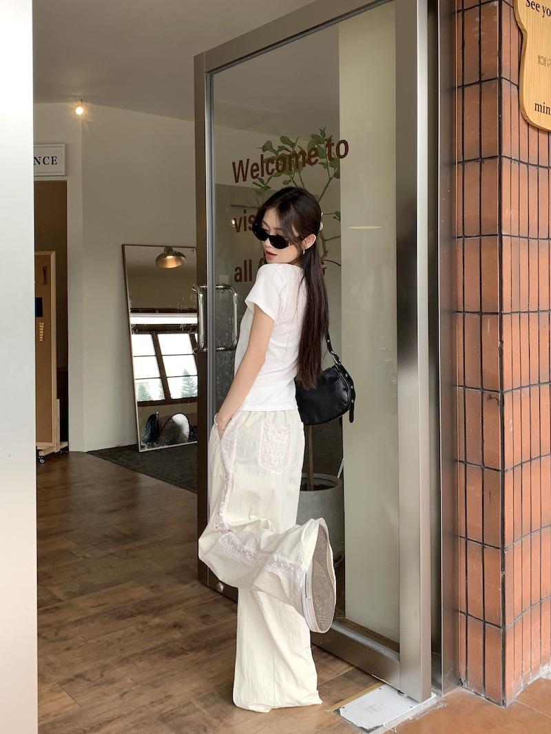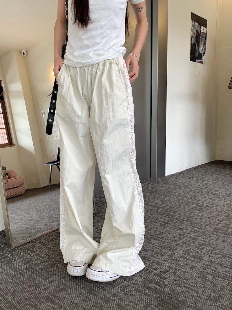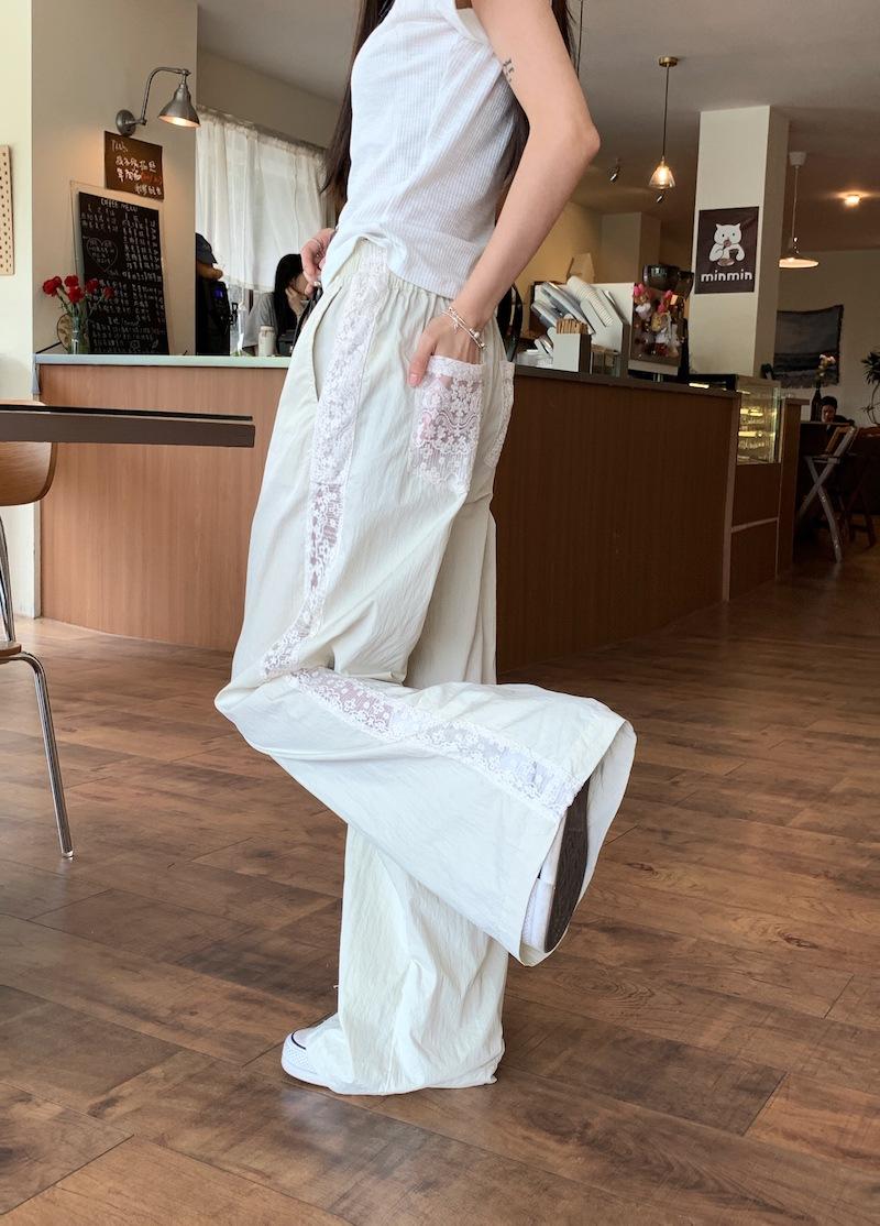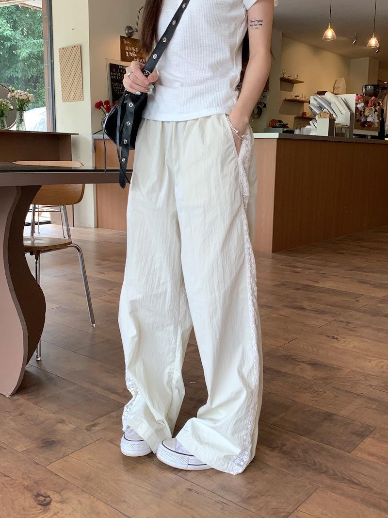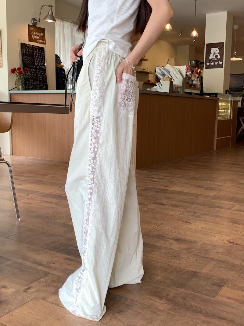 Pantalones anchos con costuras de encaje y diseño blanco Real Shot para mujer, pantalones holgados de pierna recta, pantalones casuales, pantalones largos de verano 2024