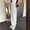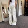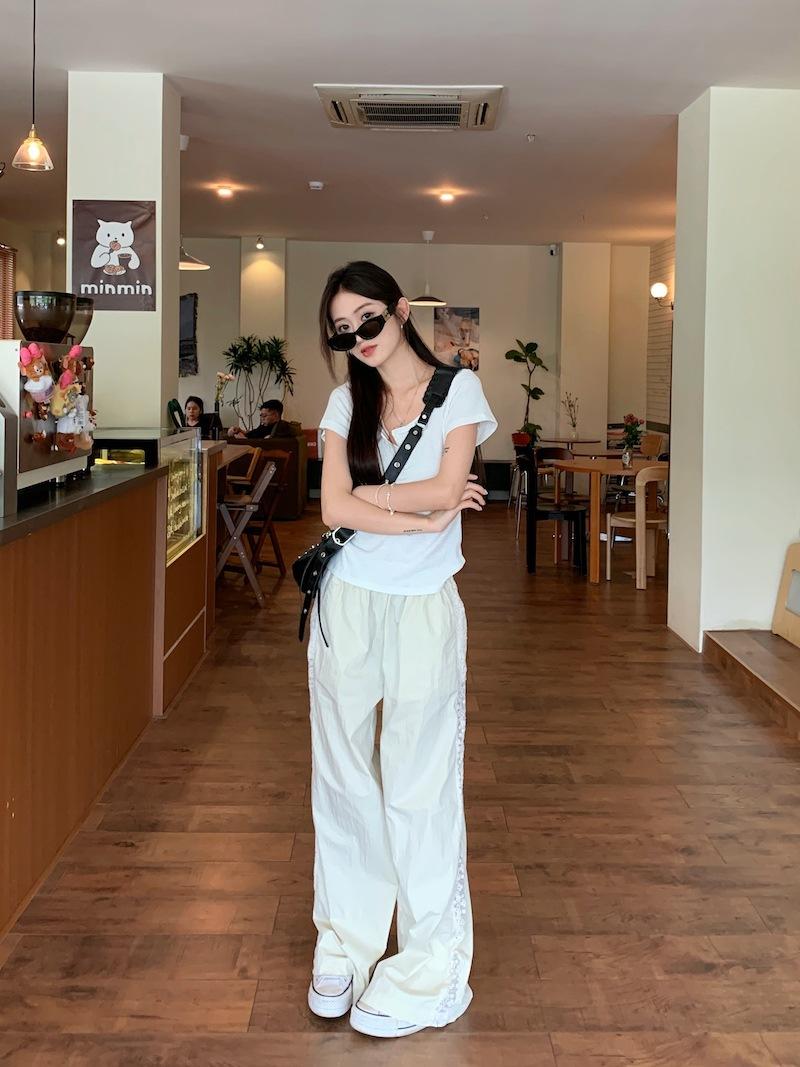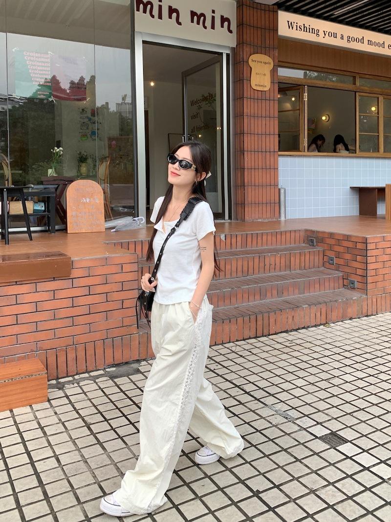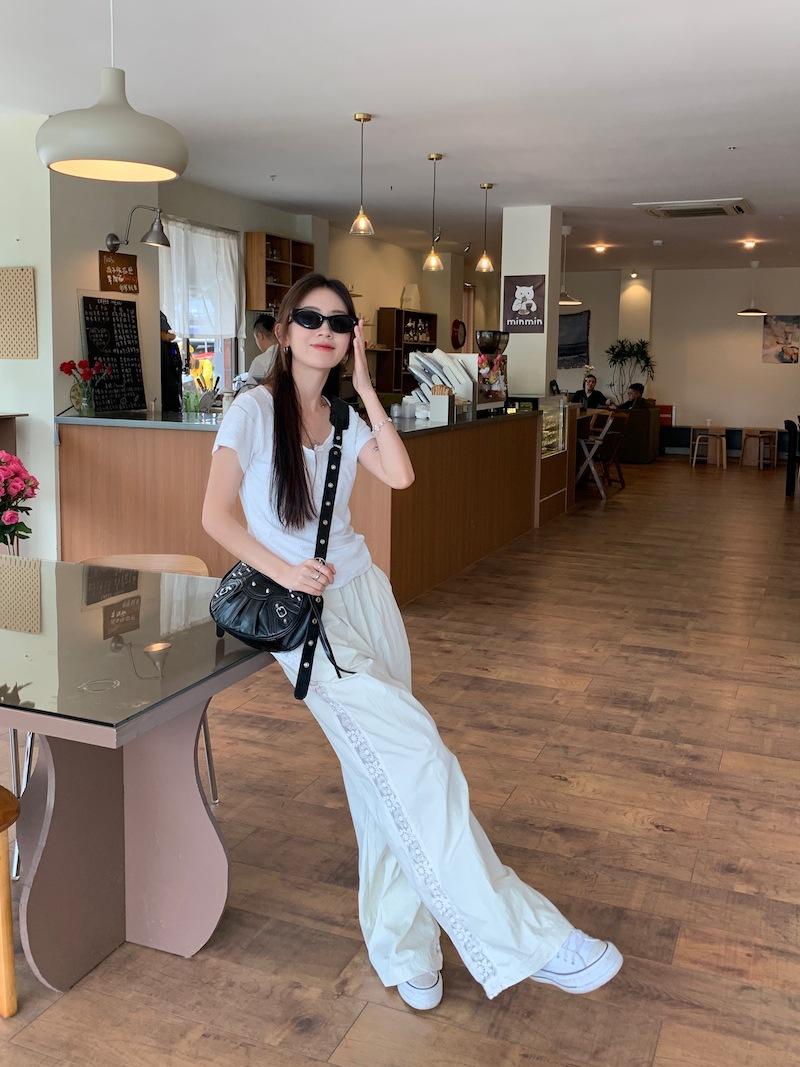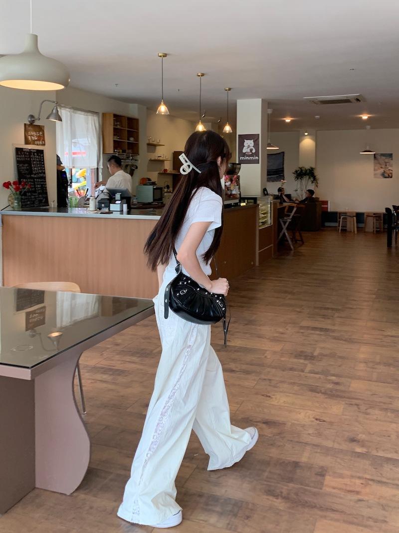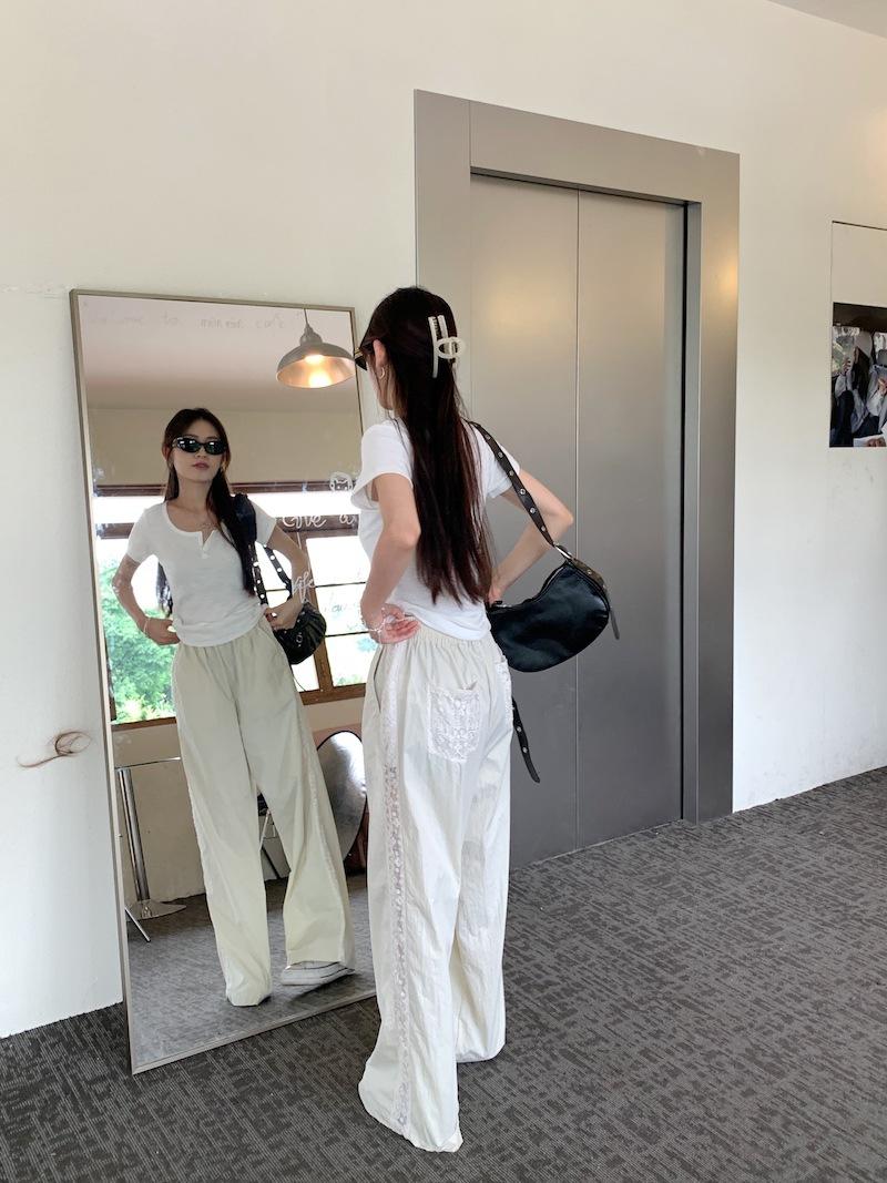 Pantalones anchos con costuras de encaje y diseño blanco Real Shot para mujer, pantalones holgados de pierna recta, pantalones casuales, pantalones largos de verano 2024