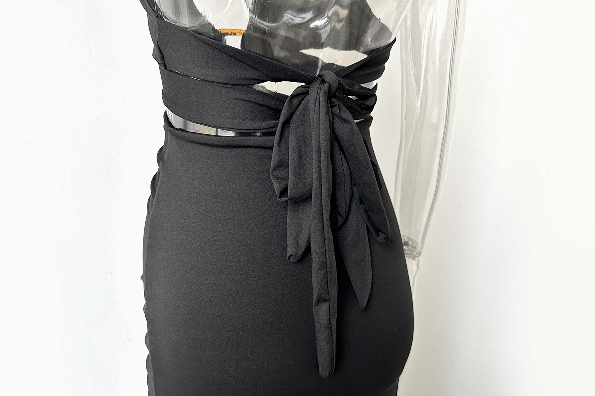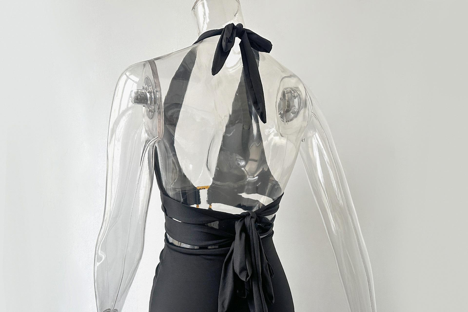 Contiene parches, lazos halter huecos en el cuello y un diseño de elemento metálico cuadrado con anillo de hierro en la cintura, ¡lo que lo hace más estilo europeo y americano!