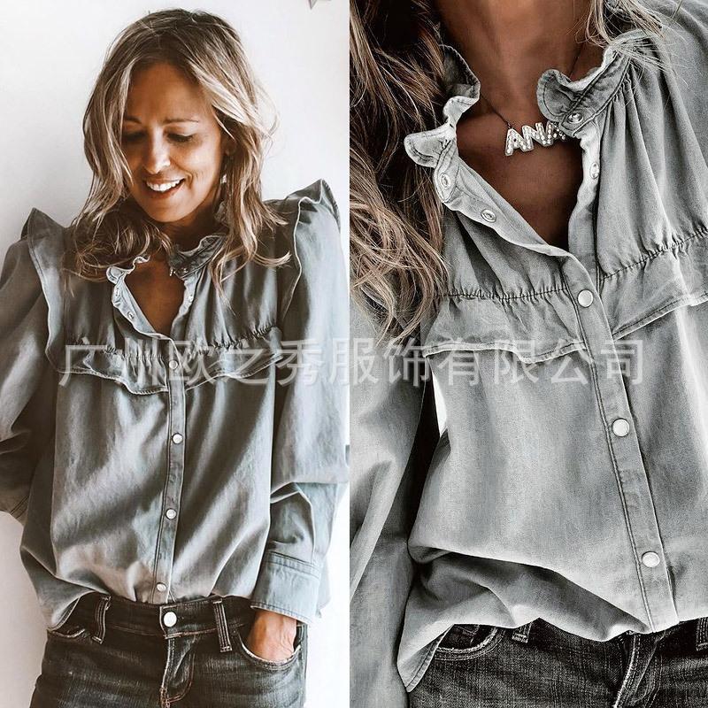 Camisa de mezclilla de manga larga con cuello de muñeca europea y americana transfronteriza de primavera y verano con volantes para ir al trabajo, tops holgados para mujer Amazon¥49Compre ya |