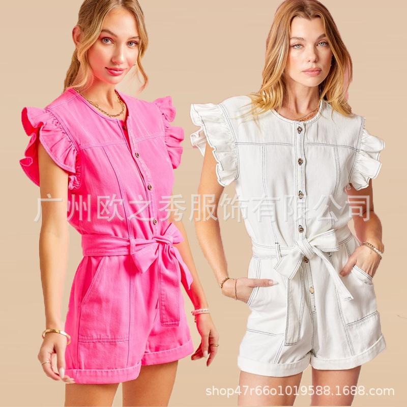 Mono de Verano 2023 Amazon Manga Volante Moda Casual Cinturón Traje de Shorts de Mezclilla Ropa de Mujer Transfronteriza Europea y Americana¥59Compre ya |
