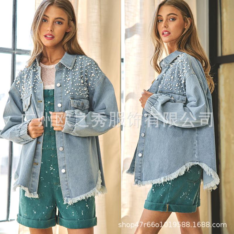 AliExpress estación independiente transfronteriza 2023 otoño e invierno chaqueta de manga larga para mujer tops mezclilla con flecos de borde crudo y remaches¥62Compre ya |