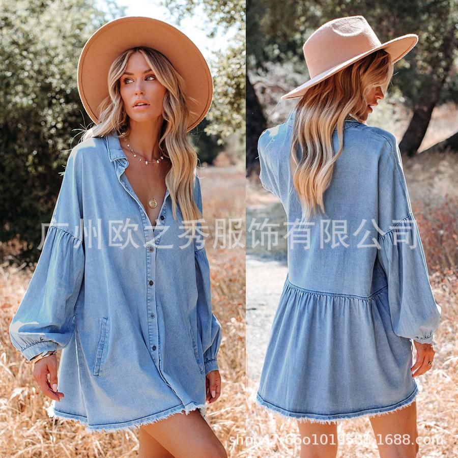 Amazon transfronterizo 2023 primavera y verano falda vaquera de manga farol para mujer europea y americana polo vestido casual holgado¥59Compre ya |