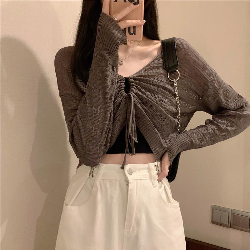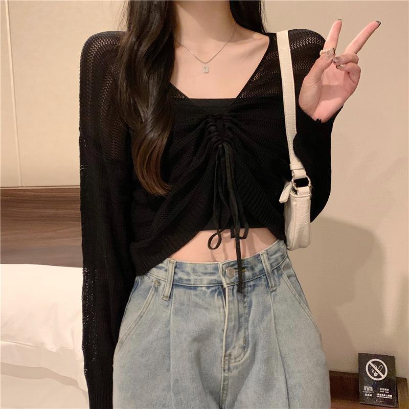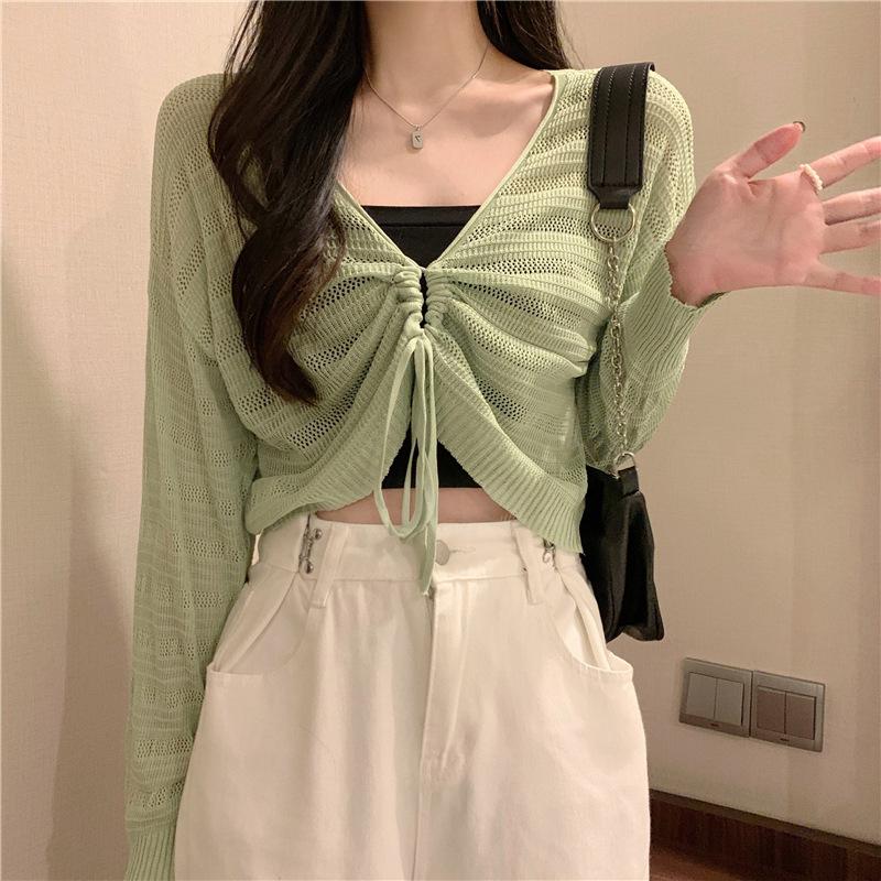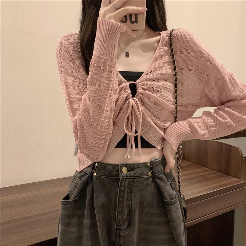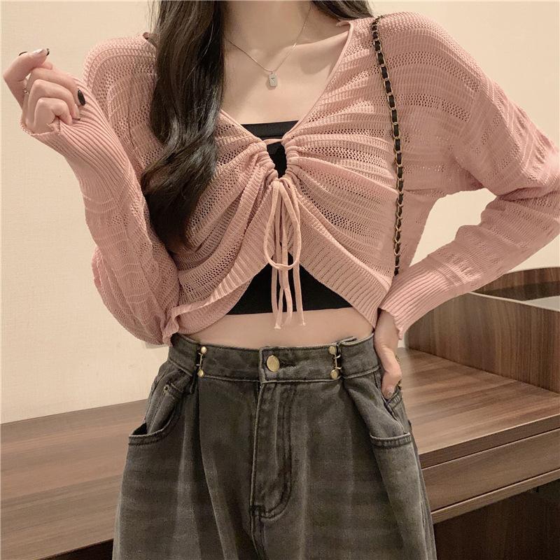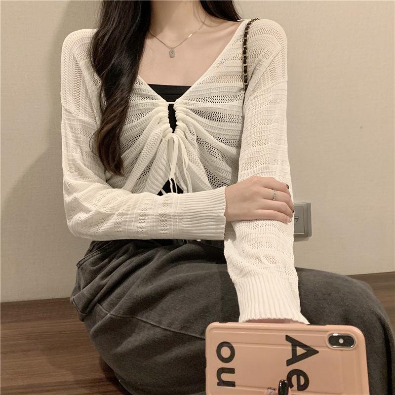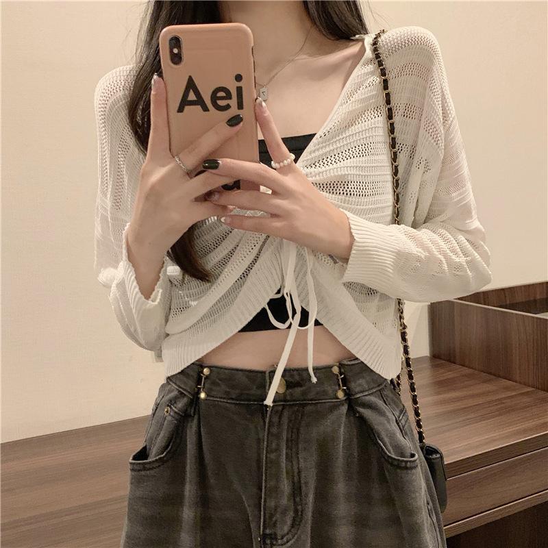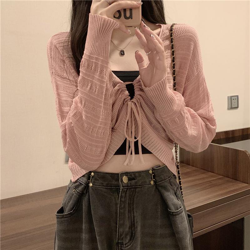 Cárdigan de punto con cordón calado estilo coreano para mujer, protector solar, blusa exterior con tiras pequeñas y finas de verano