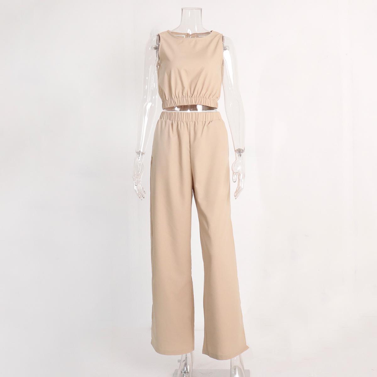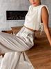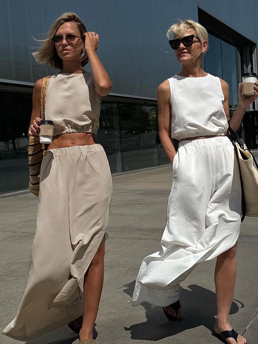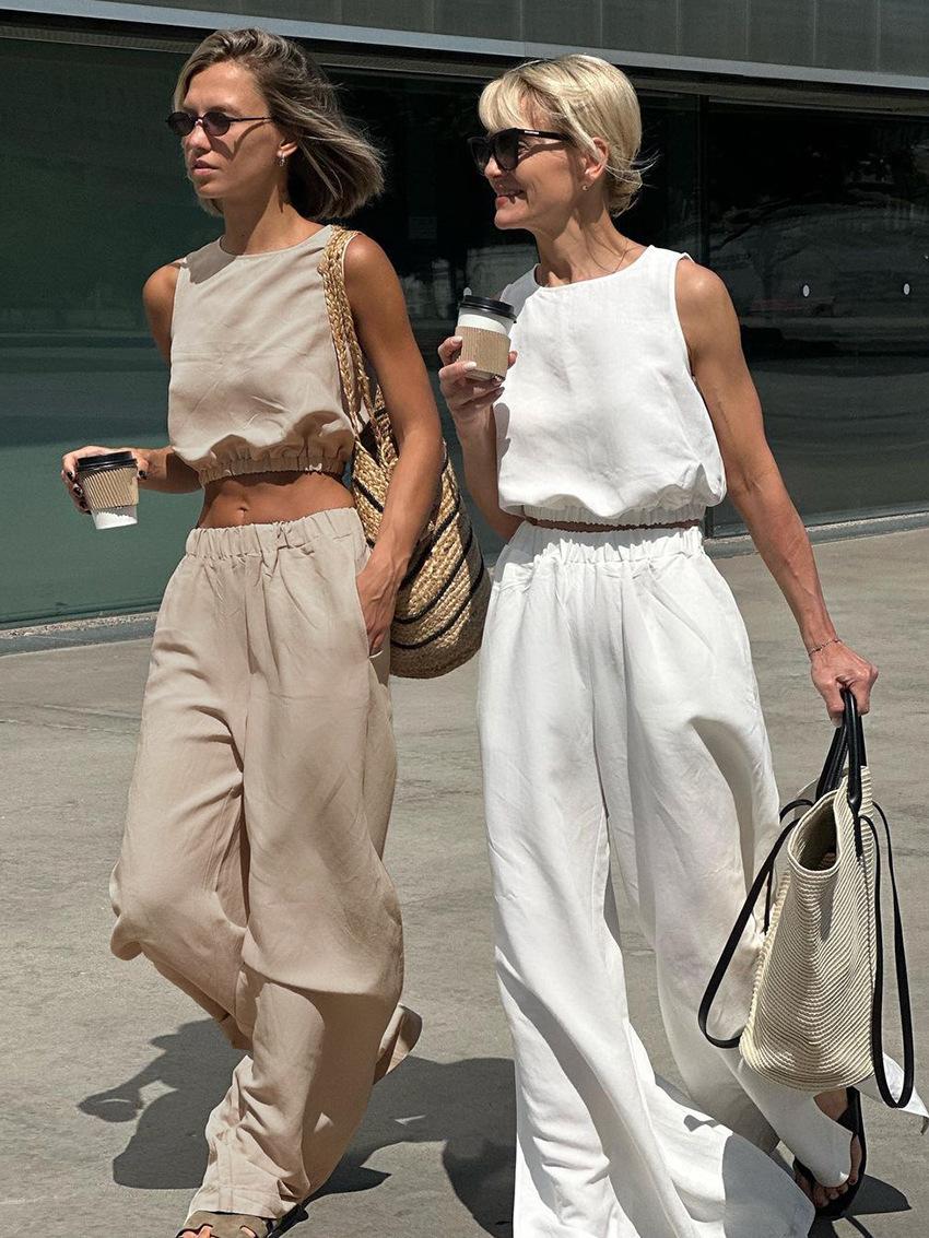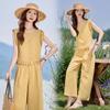 Traje de Algodón y Lino 2025 Verano Top Corto sin Mangas con Cintura Elástica + Pantalón Largo con Aberturas Traje de Dos Piezas Color Sólido