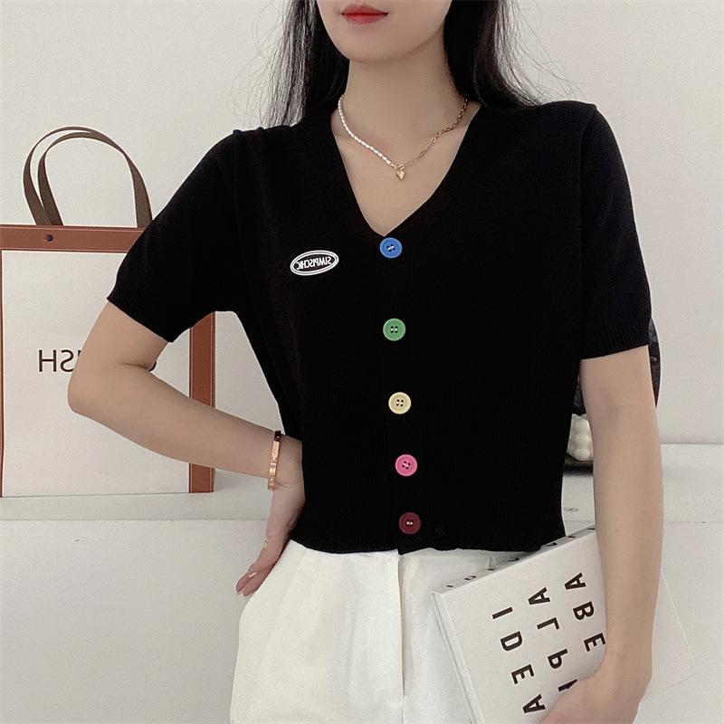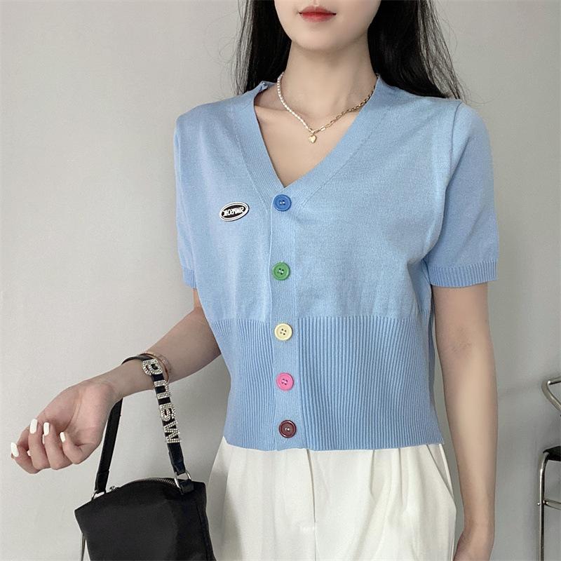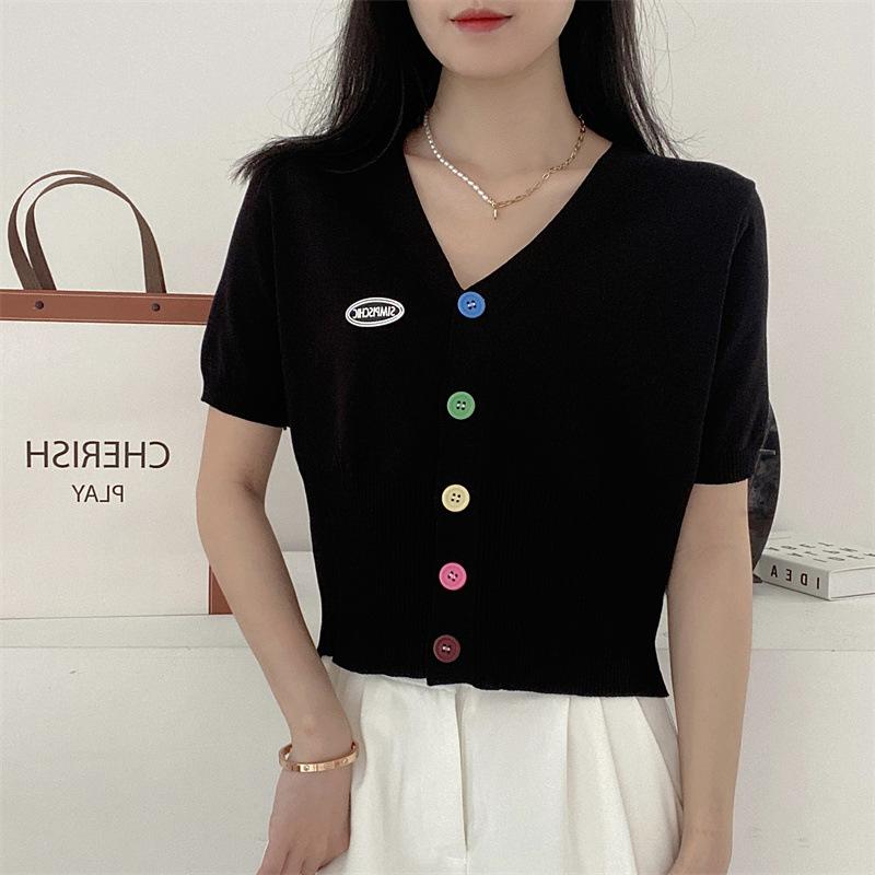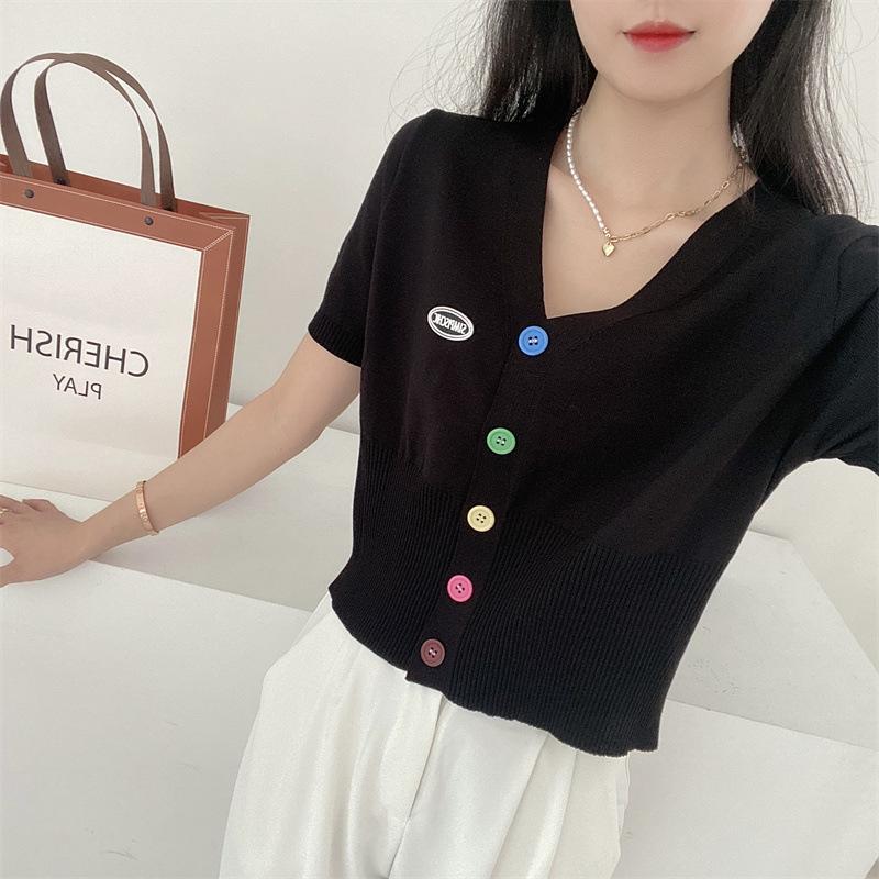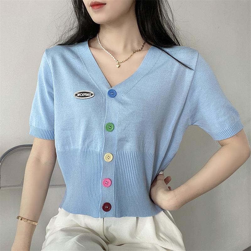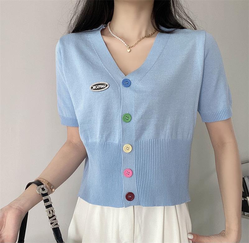 Cárdigan de Punto de Seda de Hielo Camiseta de Manga Corta para Mujer Verano 2022 Nuevo Sentido del Diseño Nicho Estilo Occidental Top Corto con Cuello en V