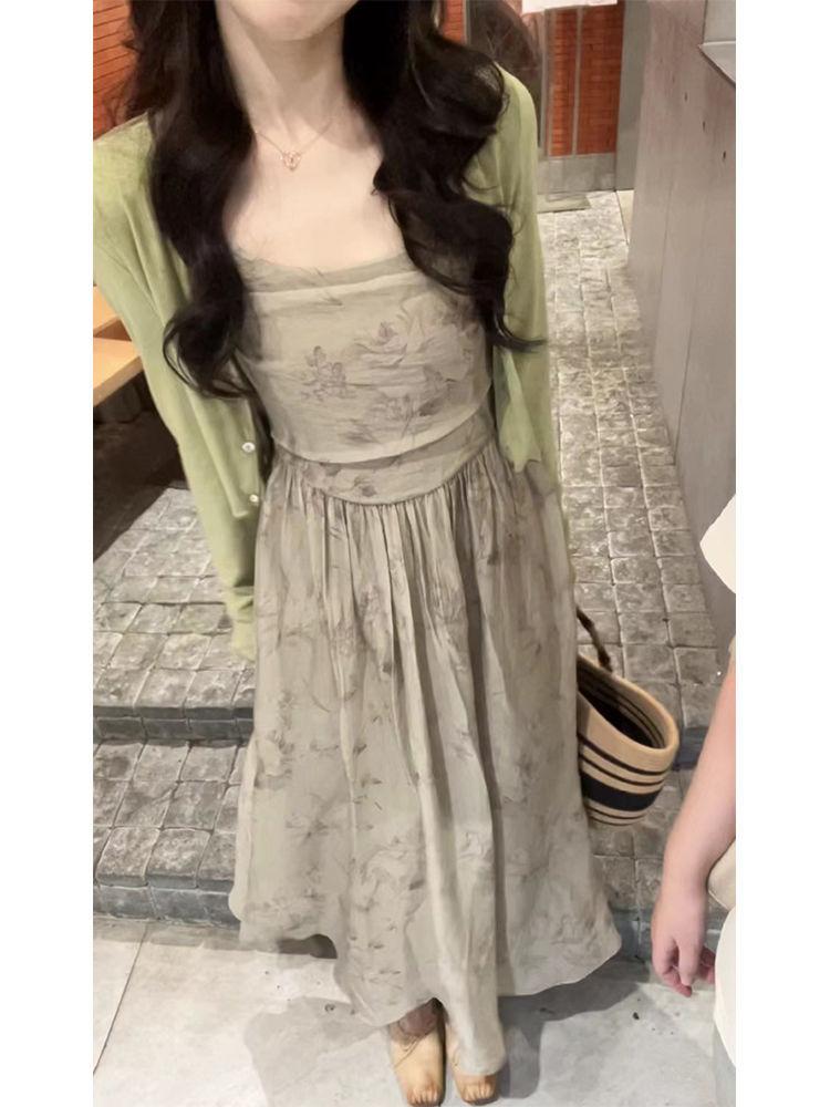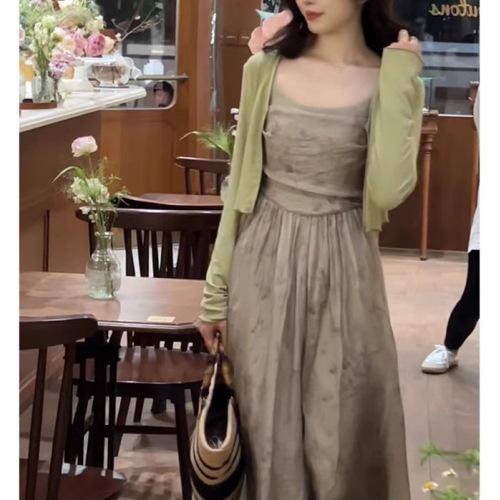 Loose Frost green cardigan, Yuanshan purple cardigan, Loose Frost green suspender skirt, Yuanshan purple suspe...