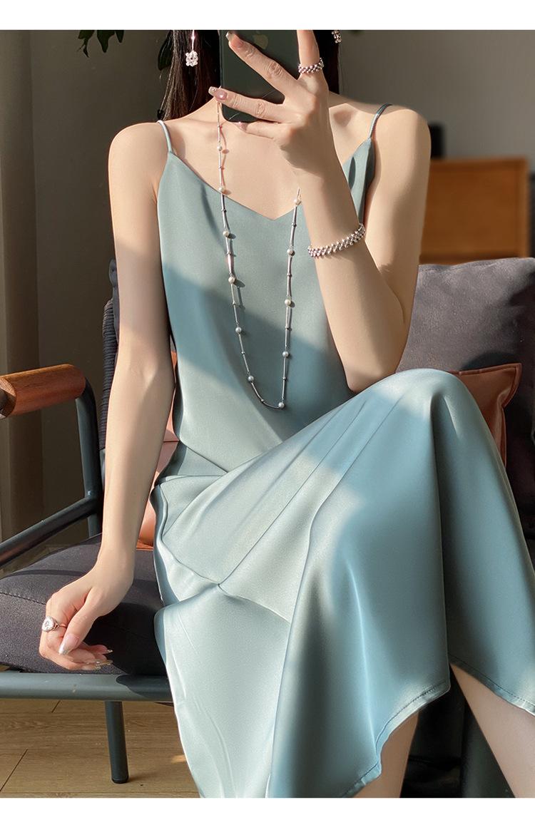 Seda 2024 Verano Señoras Nuevo Cuello en V Ajustado Vestido Interior Satén Celebridad Sexy Vestido de Tirantes Falda Larga