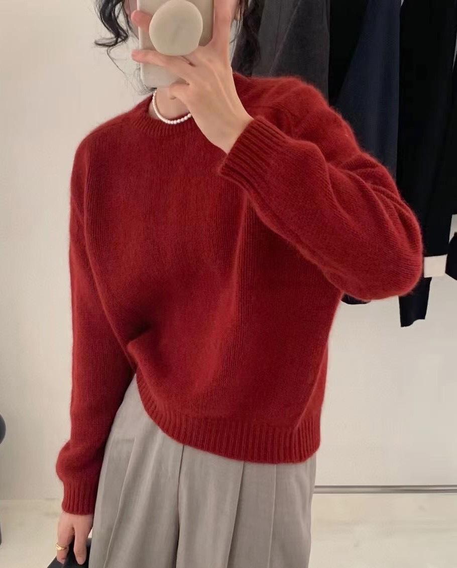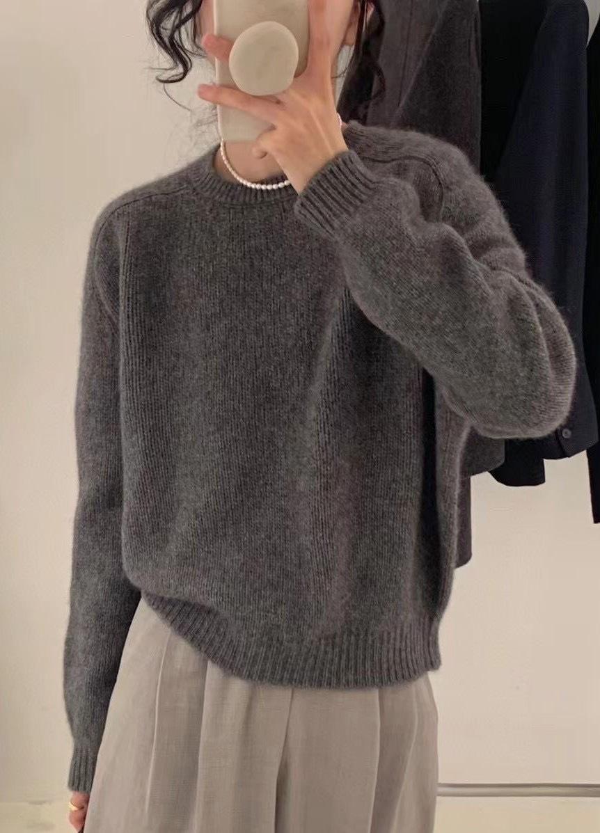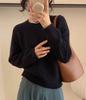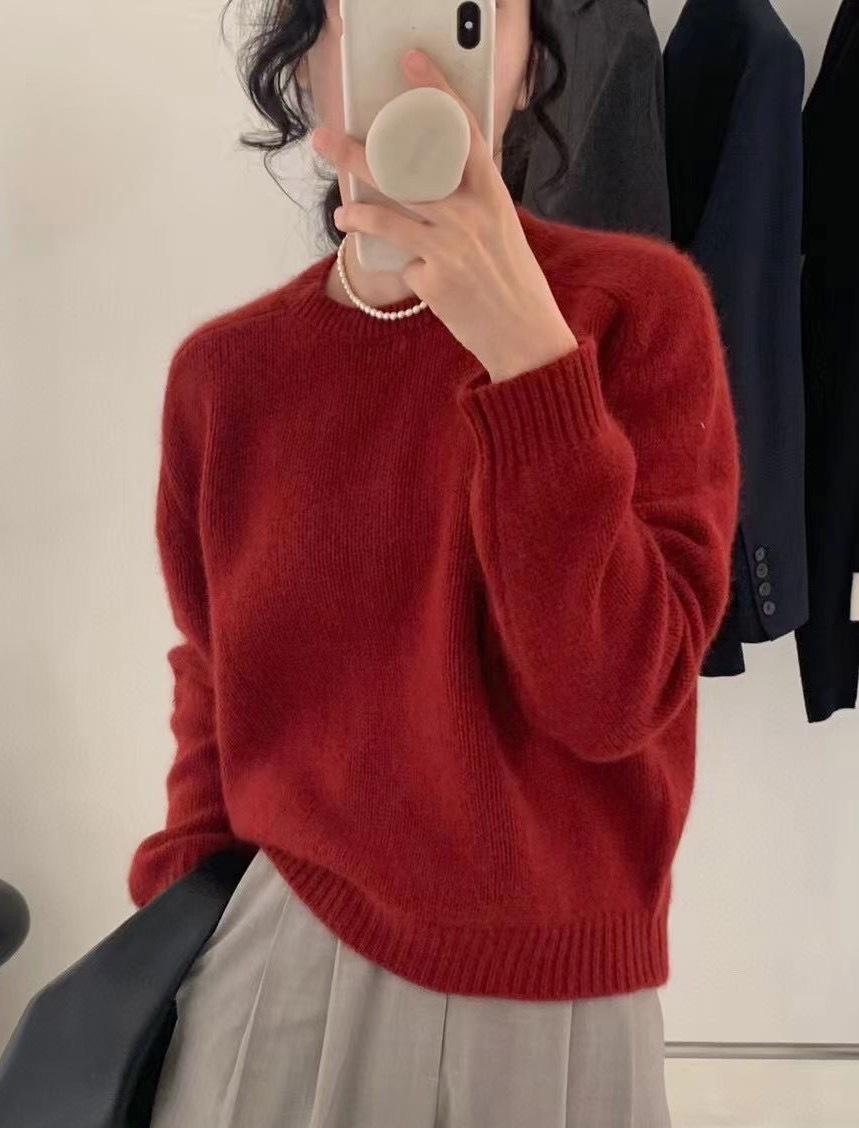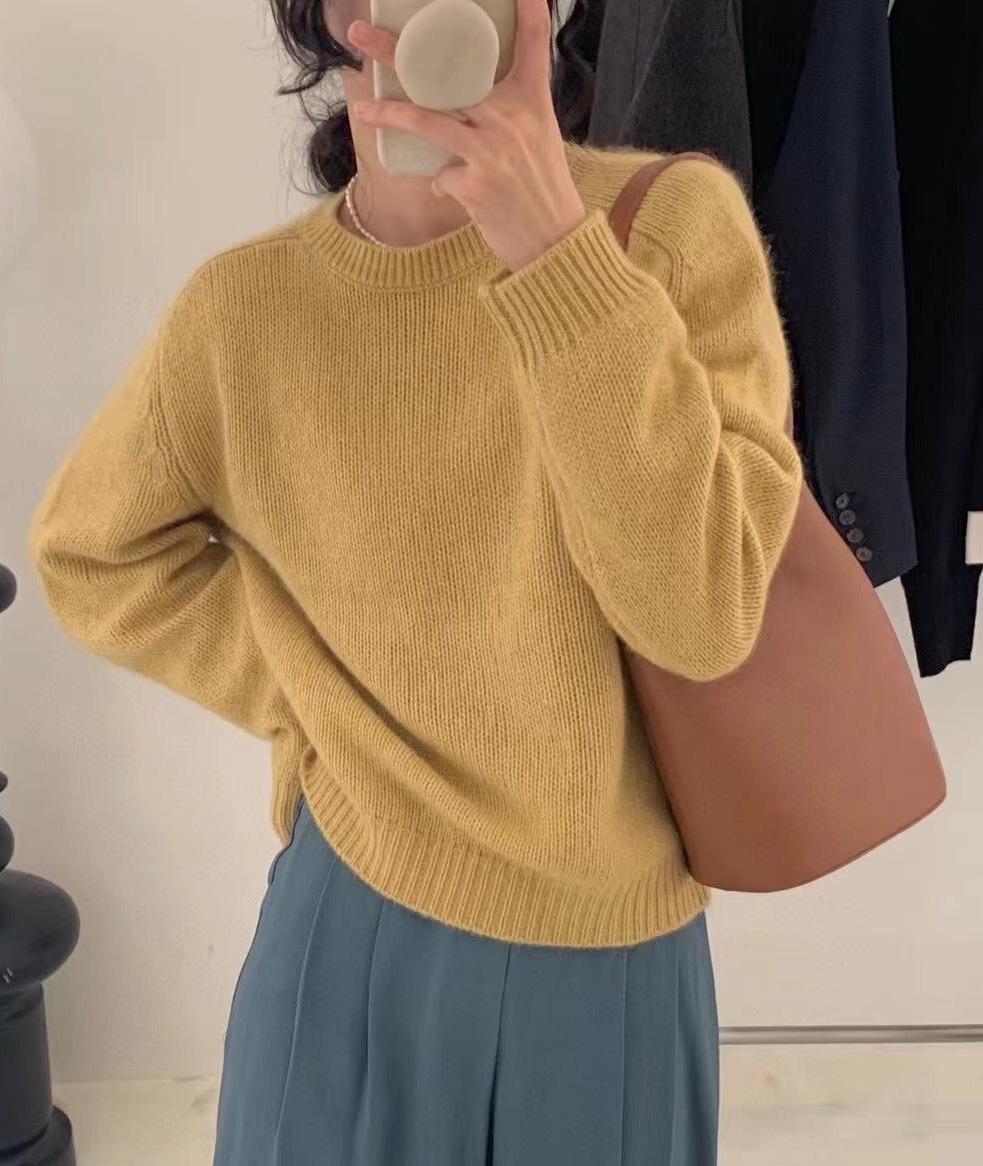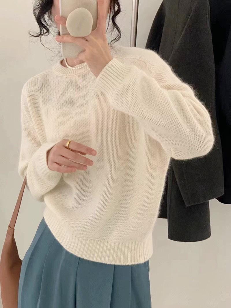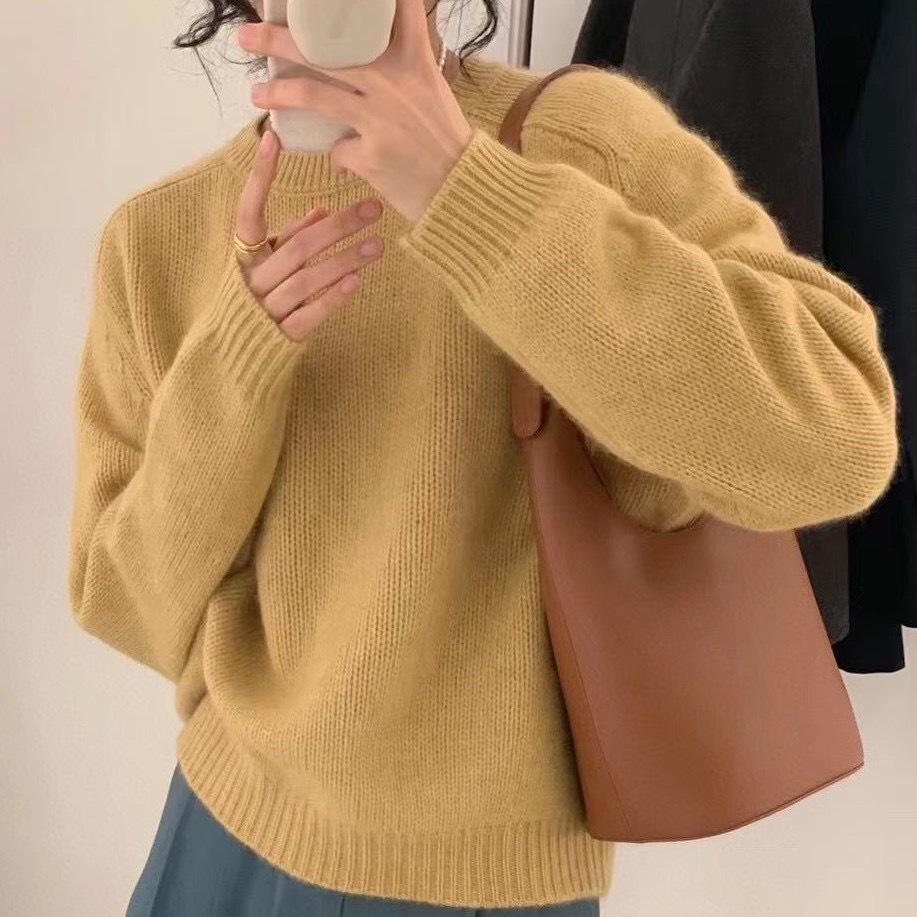 Suéter de Punto Corto Elegante de Cuello Redondo para Mujer 100% Lana Pura Jersey Suelto Holgazán Estilo Ropa de Trabajo Otoño e Invierno Nueva Tendencia de Suéter