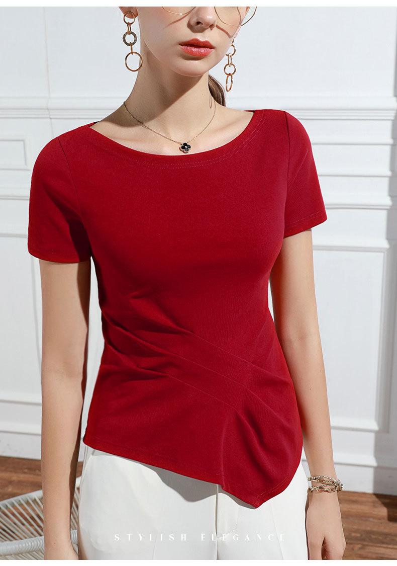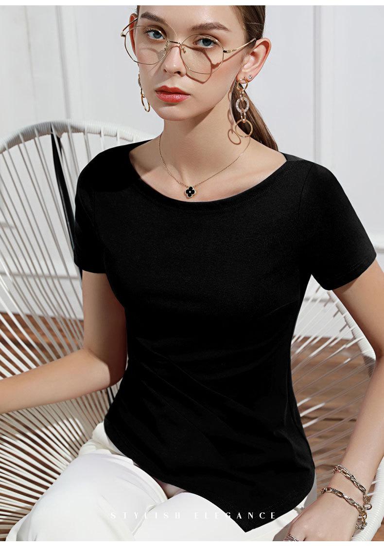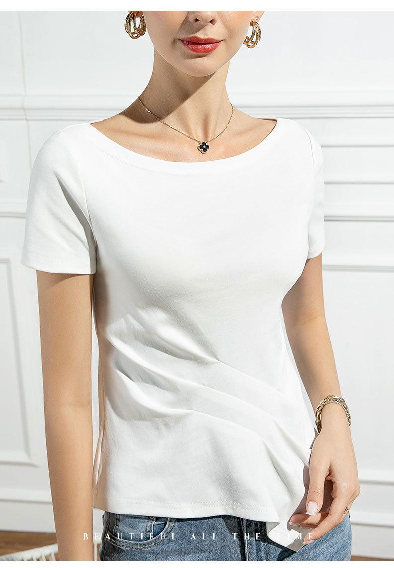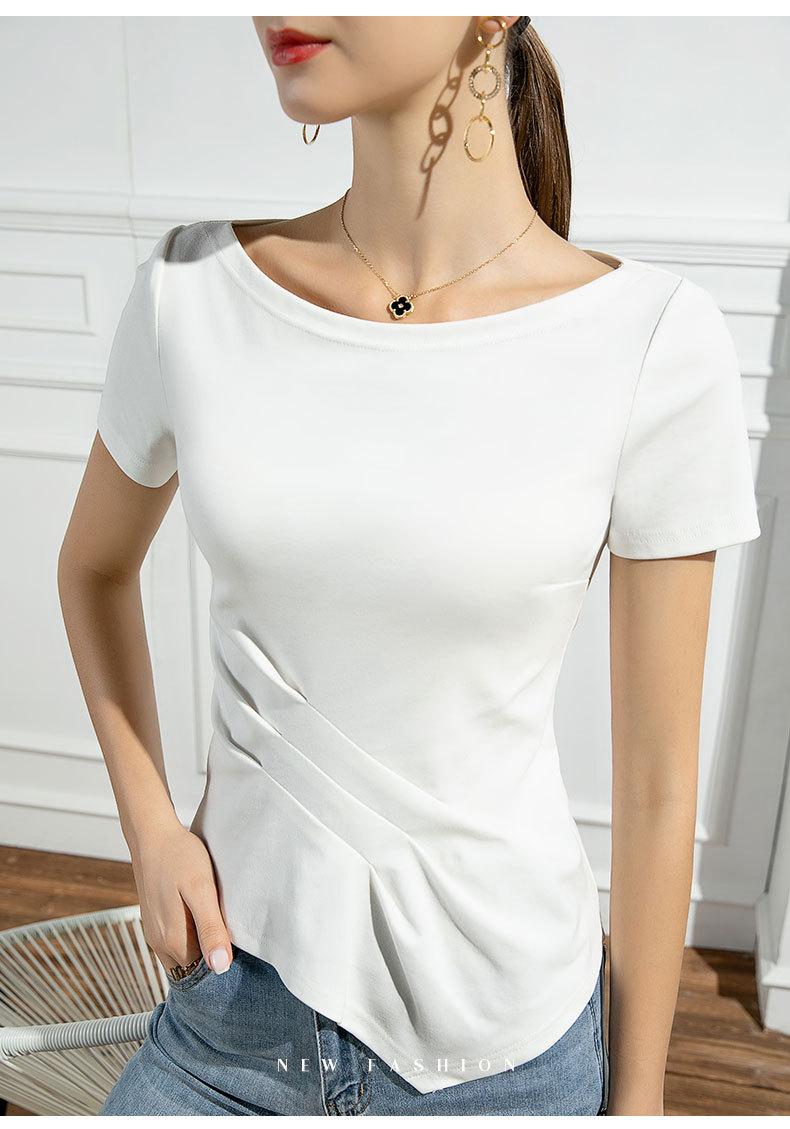 Camiseta de verano con cuello redondo para mujer, de manga corta, corte entallado, de algodón puro, diseño de nicho, estilo primavera y verano, estilo europeo, color liso.