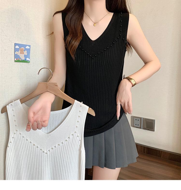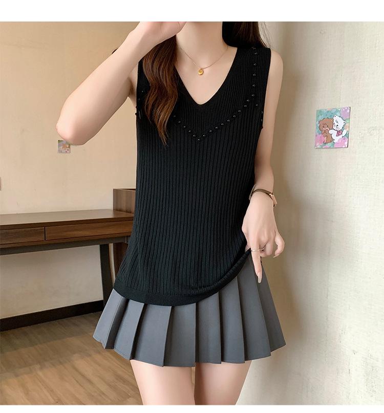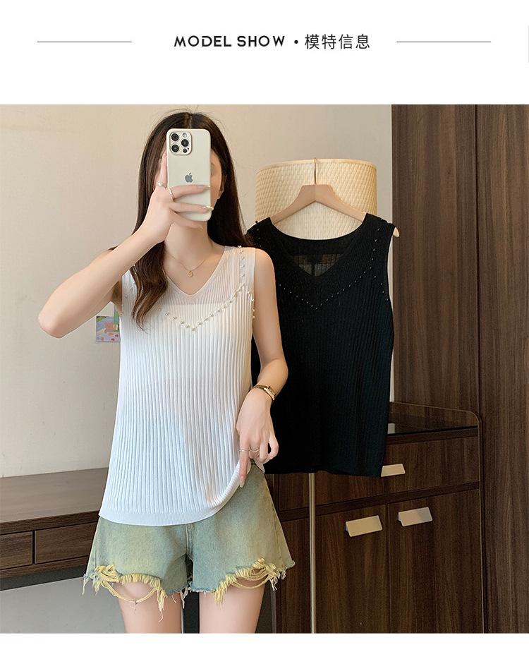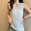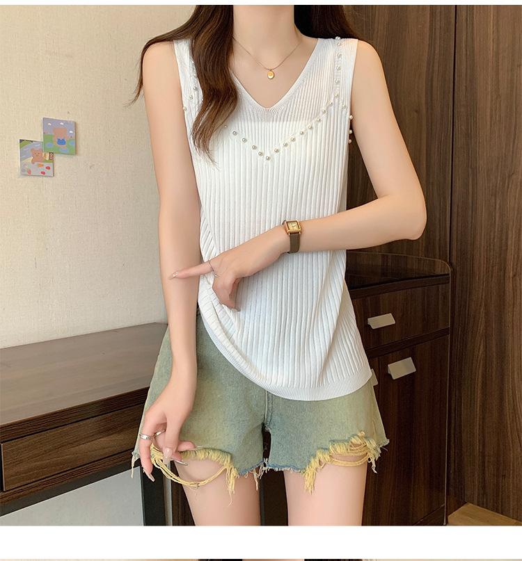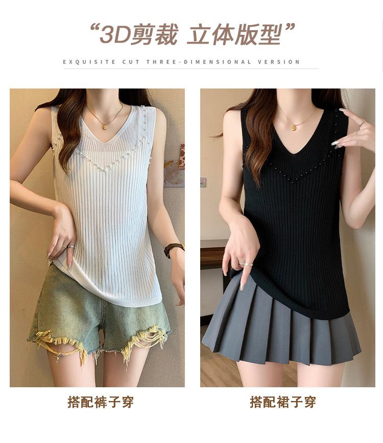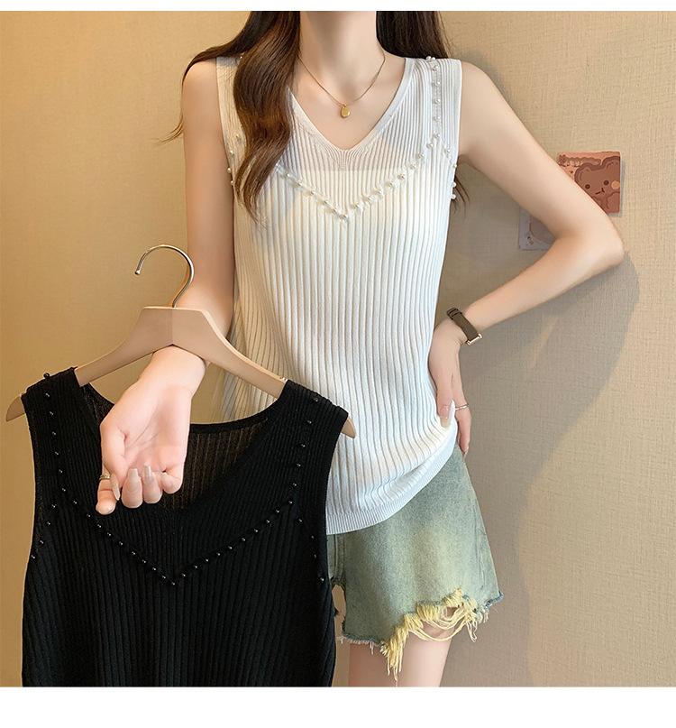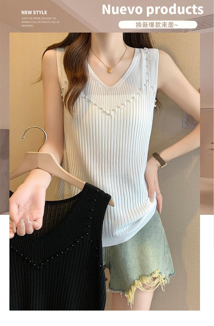 Camisola de punto sin mangas de seda de hielo para mujer, verano 2025, nueva, cuello en V, abalorios pesados, camiseta interior y exterior